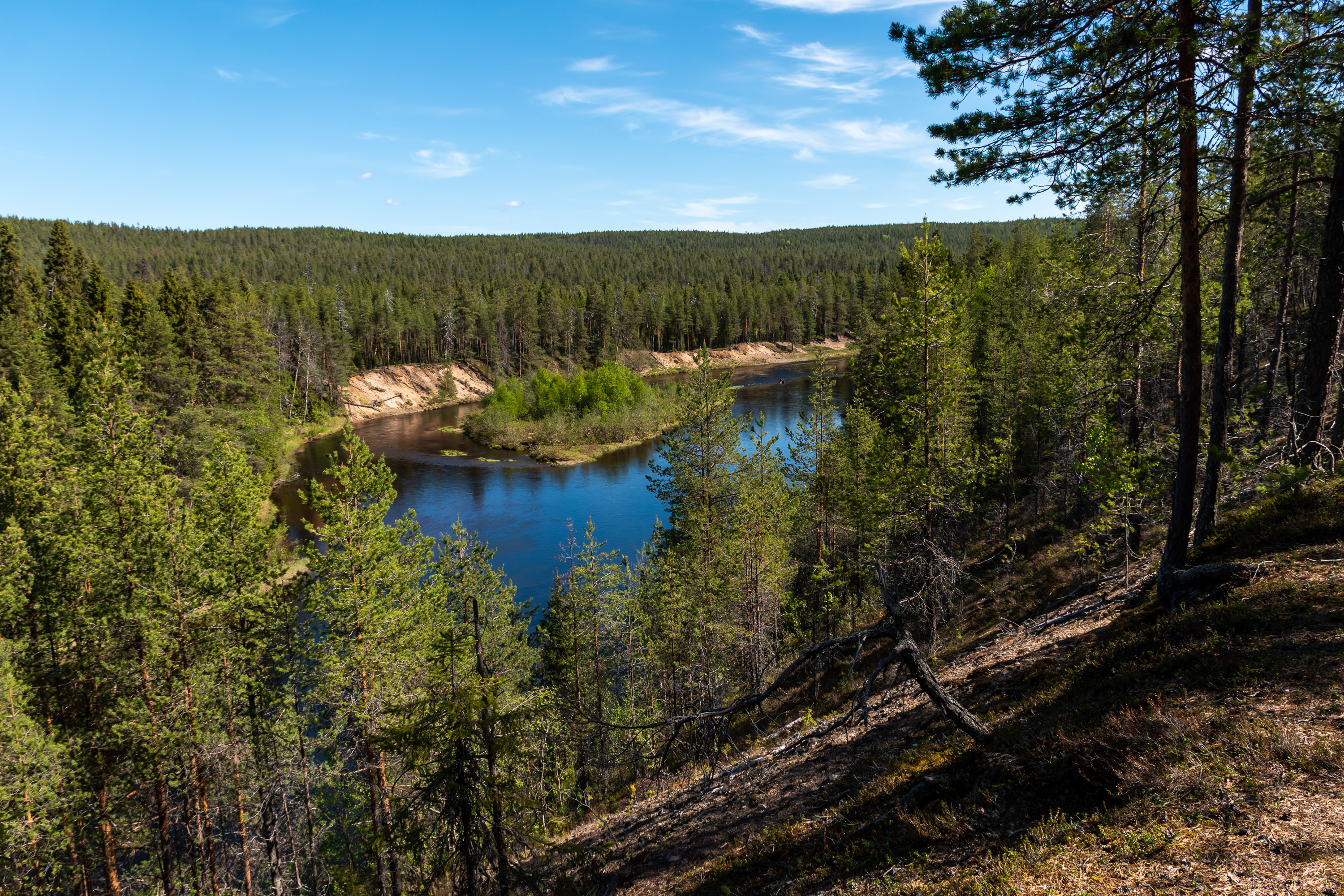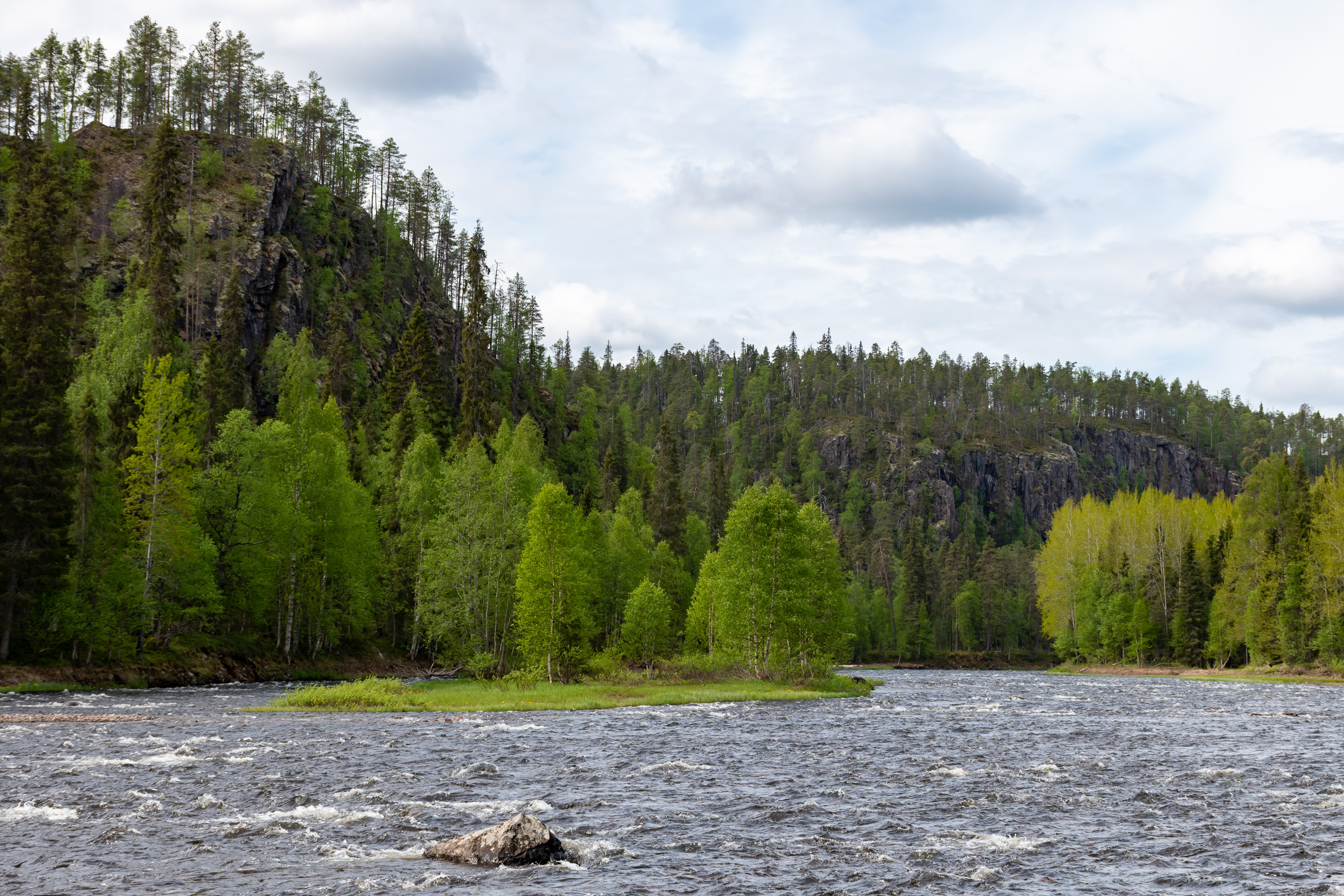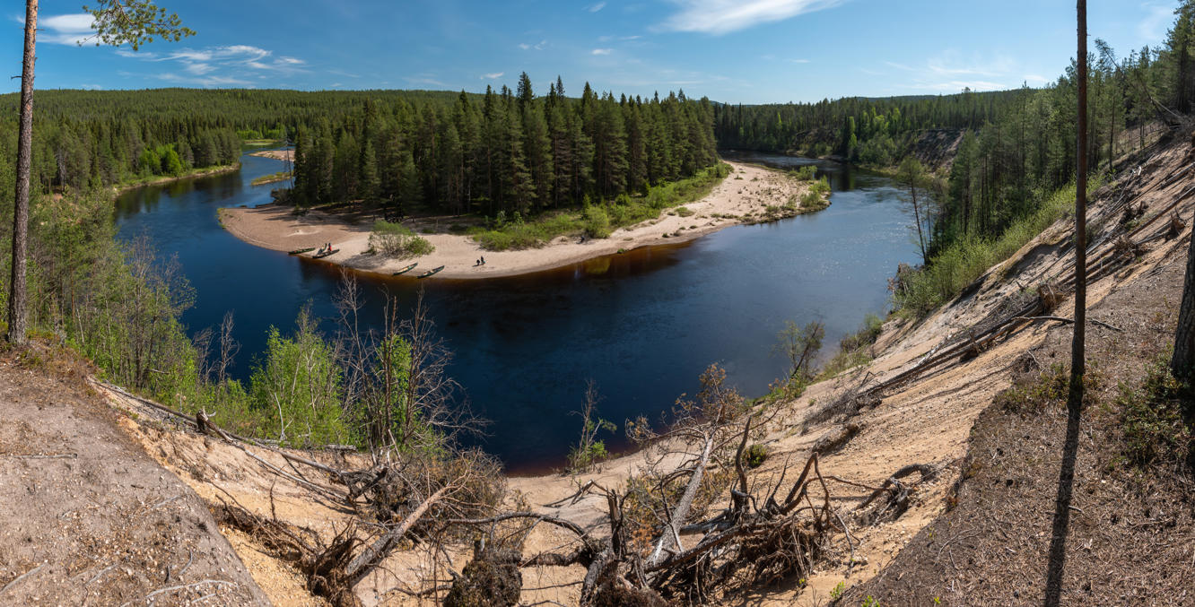 7. Киутакёнгяс — последний серьезный порог на Оуланкайоки, по крайней мере, по эту сторону российской границы. Весь оставшийся путь река течет тихо и спокойно, образуя множество крутых излучин-меандров, местами среди очень высоких крутых песчаных обрывов.