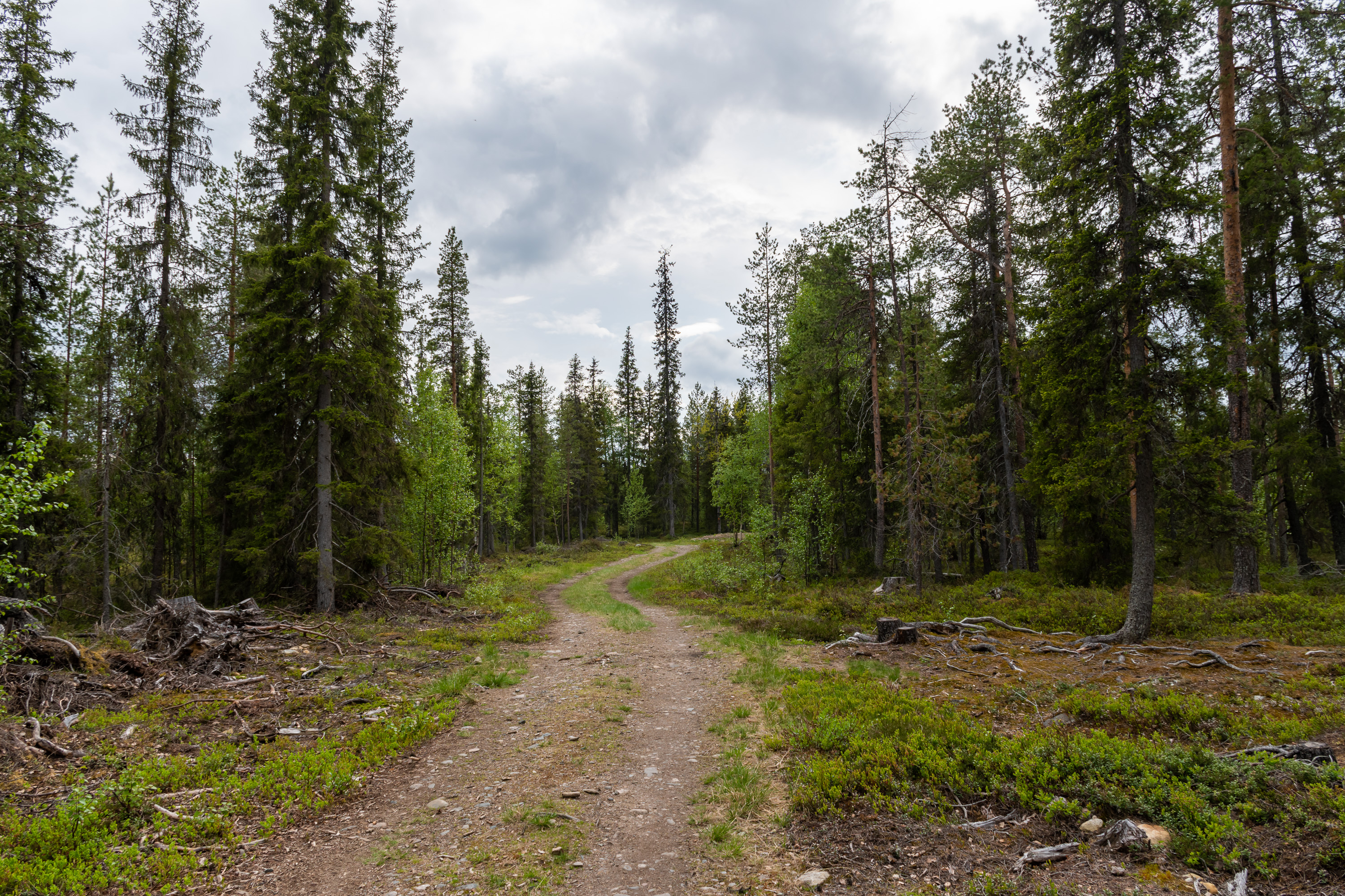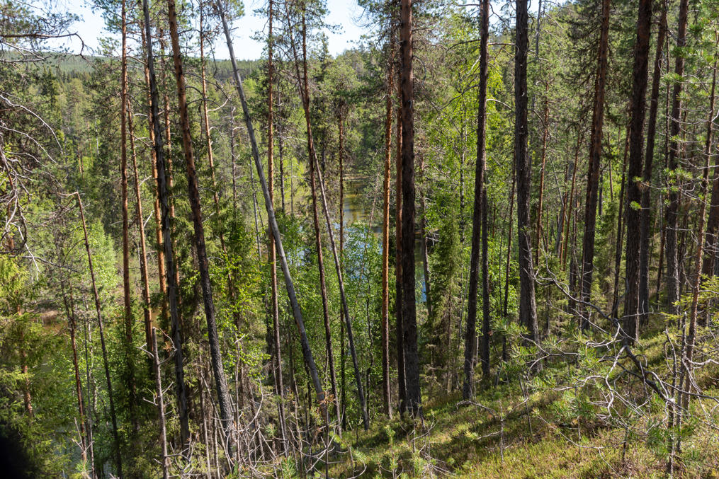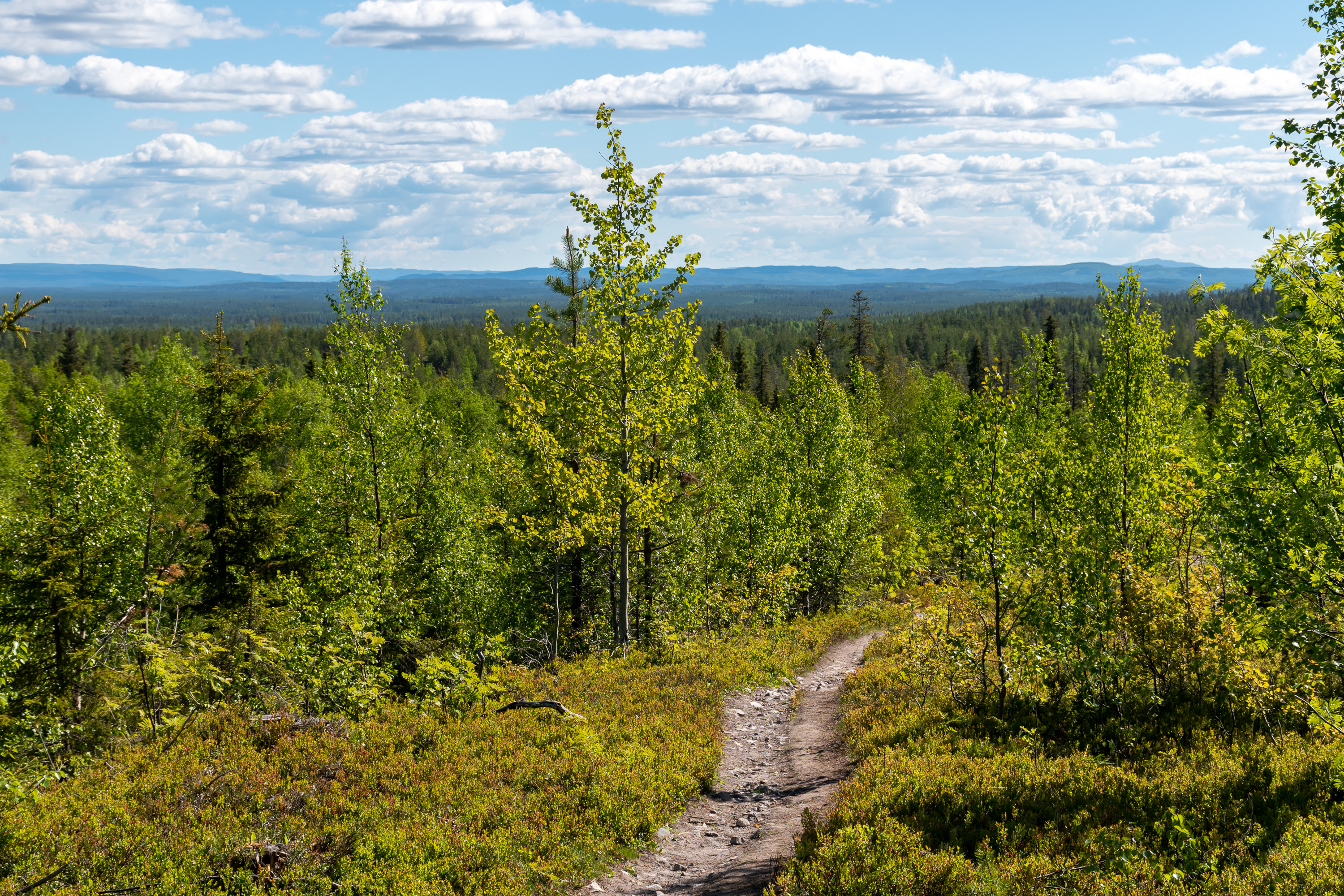 21. Самая высокая точка между долинами, пологая лесистая гора Кулмакковаара, позади, и заодно мы ровно на полпути всего Медвежьего кольца, между Хаутаярви и Рукой.