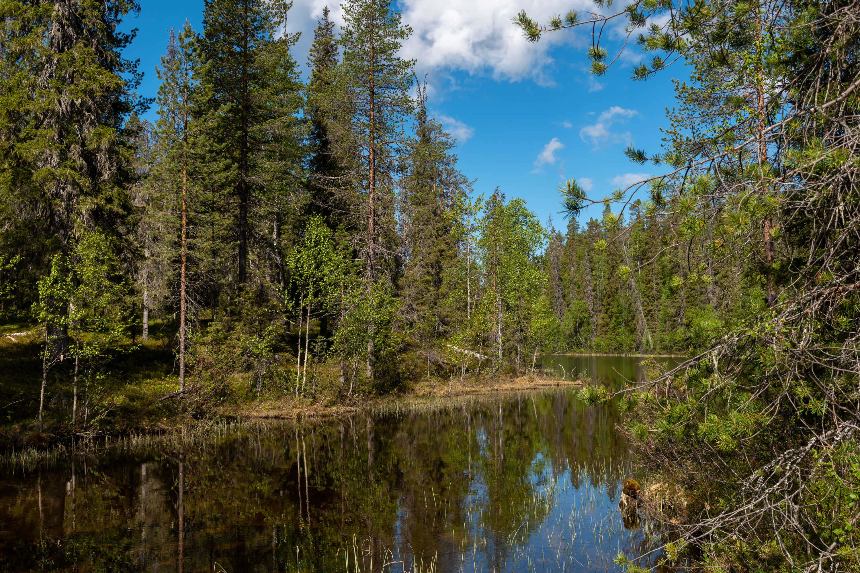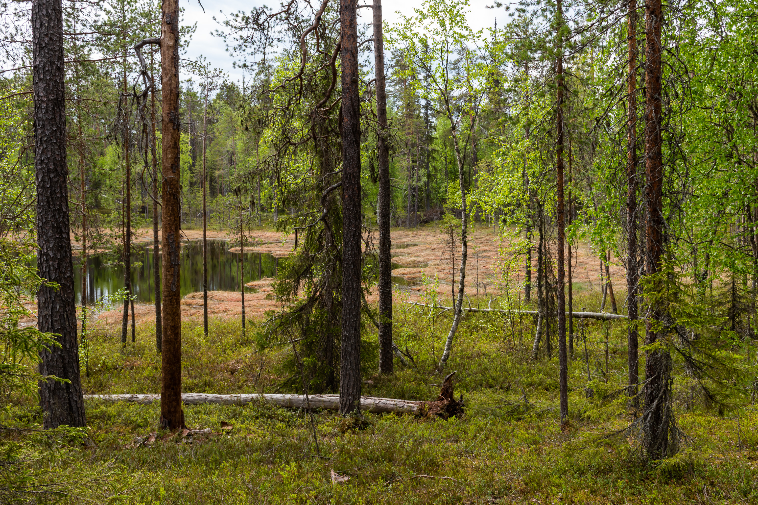 62. Участок между Поронтимайоки и Конттайненом тоже скучноватый и не входит ни в какие охраняемые природные территории, его разнообразят только подъемы на мелкие сопки и местами виды со склонов и вершин. Озерцо Исо-Куиккалампи (Iso Kuikkalampi, фин. Большой Гагарий пруд) здесь сфотографировано с лесной дороги, по которой проходит участок маршрута.