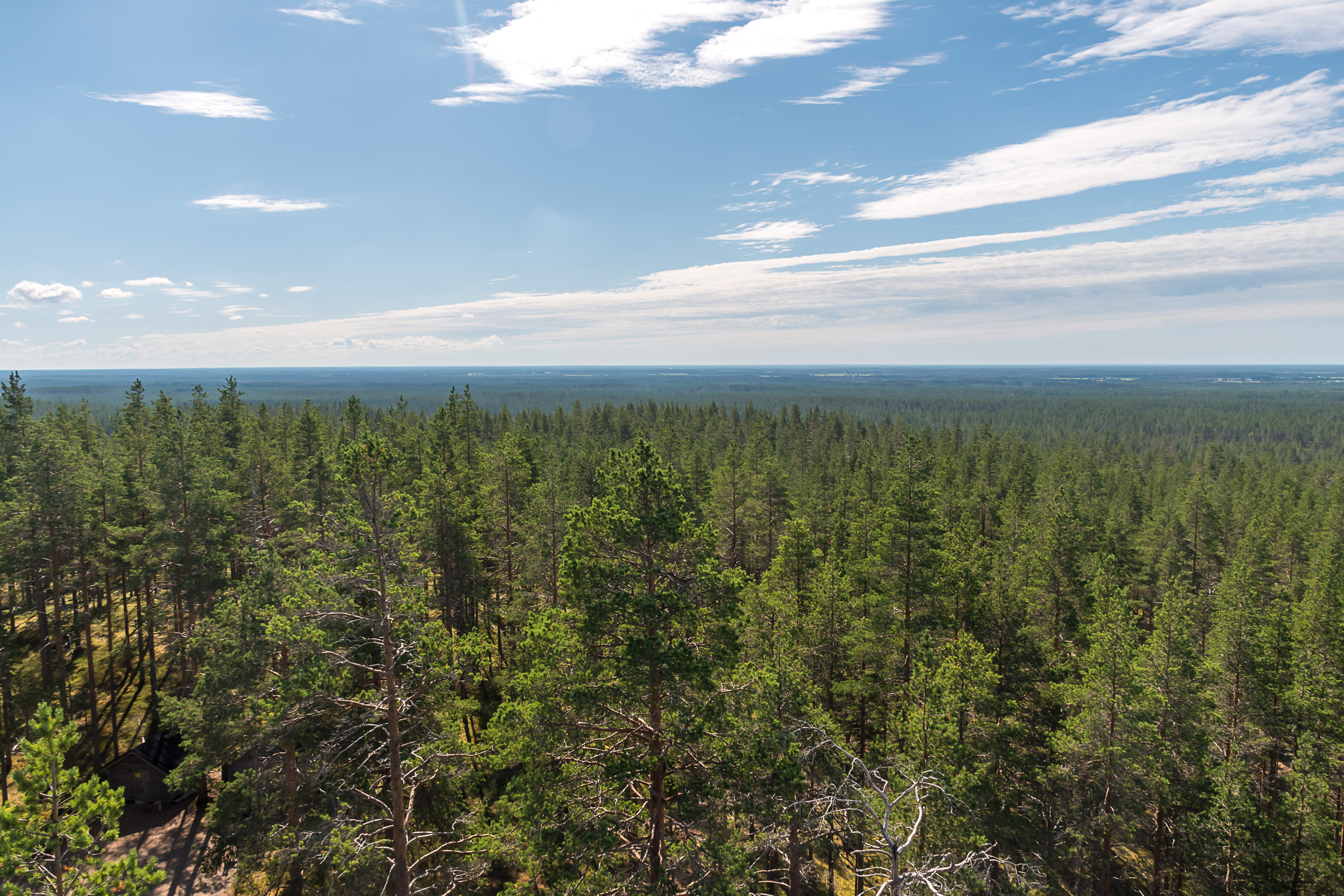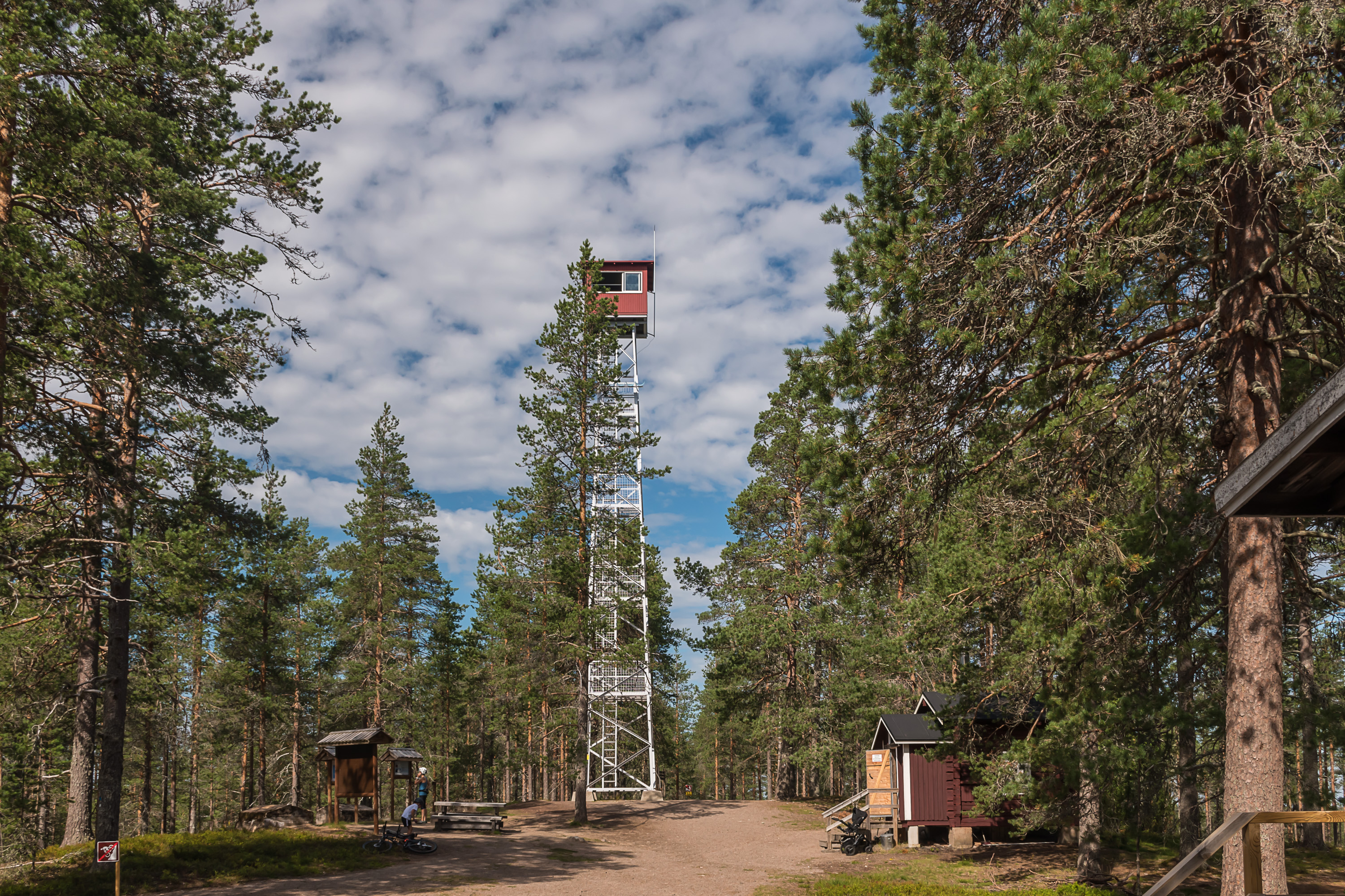 40. Одна из достопримечательностей тропы — бывшая вышка пожарных на холме Поокиваара (Pookivaara), самой высокой точке Рокуа, 194 м над уровнем моря и 50 м над окружающей местностью. Нетрудно догадаться, что растительность Рокуа в такую погоду, как, к примеру, на фото, может гореть как спичка. Раньше подобные леса регулярно горели с интервалом в 50-60 лет. Первая вышка, на которой дежурили для наблюдения за возможными лесными пожарами, была построена на этом месте в 1936, но нынешняя уже третья по счету. По назначению она использовалась до 1970-х. Подобных вышек в стране сохранилось достаточно много, но большинство заброшены и закрыты для посещения; эта же была отреставрирована в 2013 году, так что можно залезть. Справа видна избушка пожарных, которая открыта для ночевки. Подобную избушку я показывал, например, в посте про тропу Кархункиеррос, на горе Валтаваара (фото 81). Как и валтаваарская, эта избушка очень маленькая, всего два спальных места.