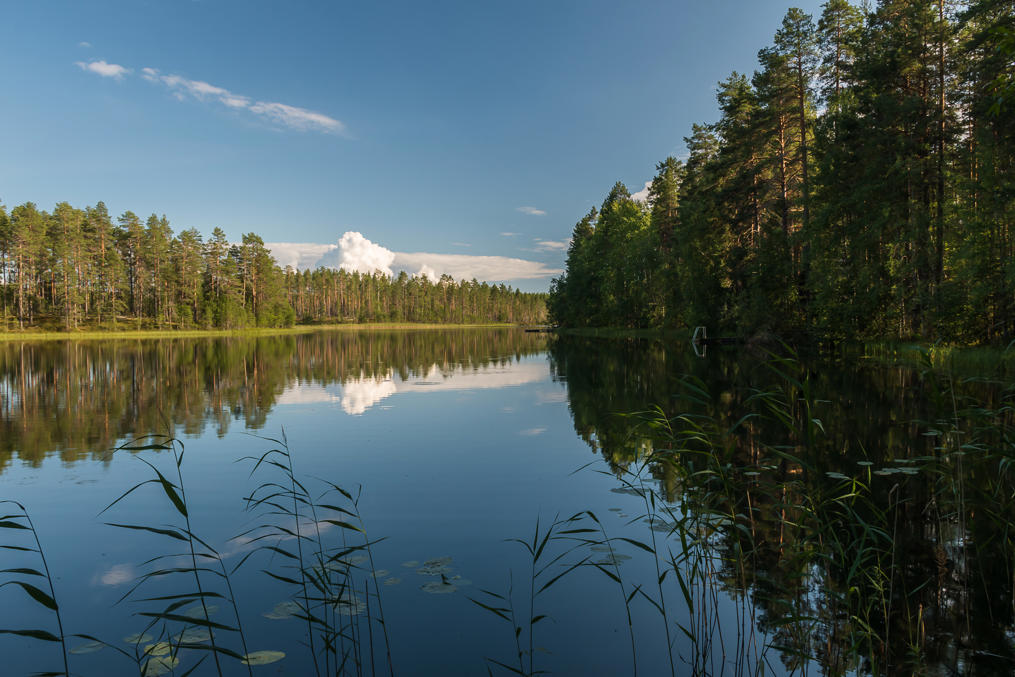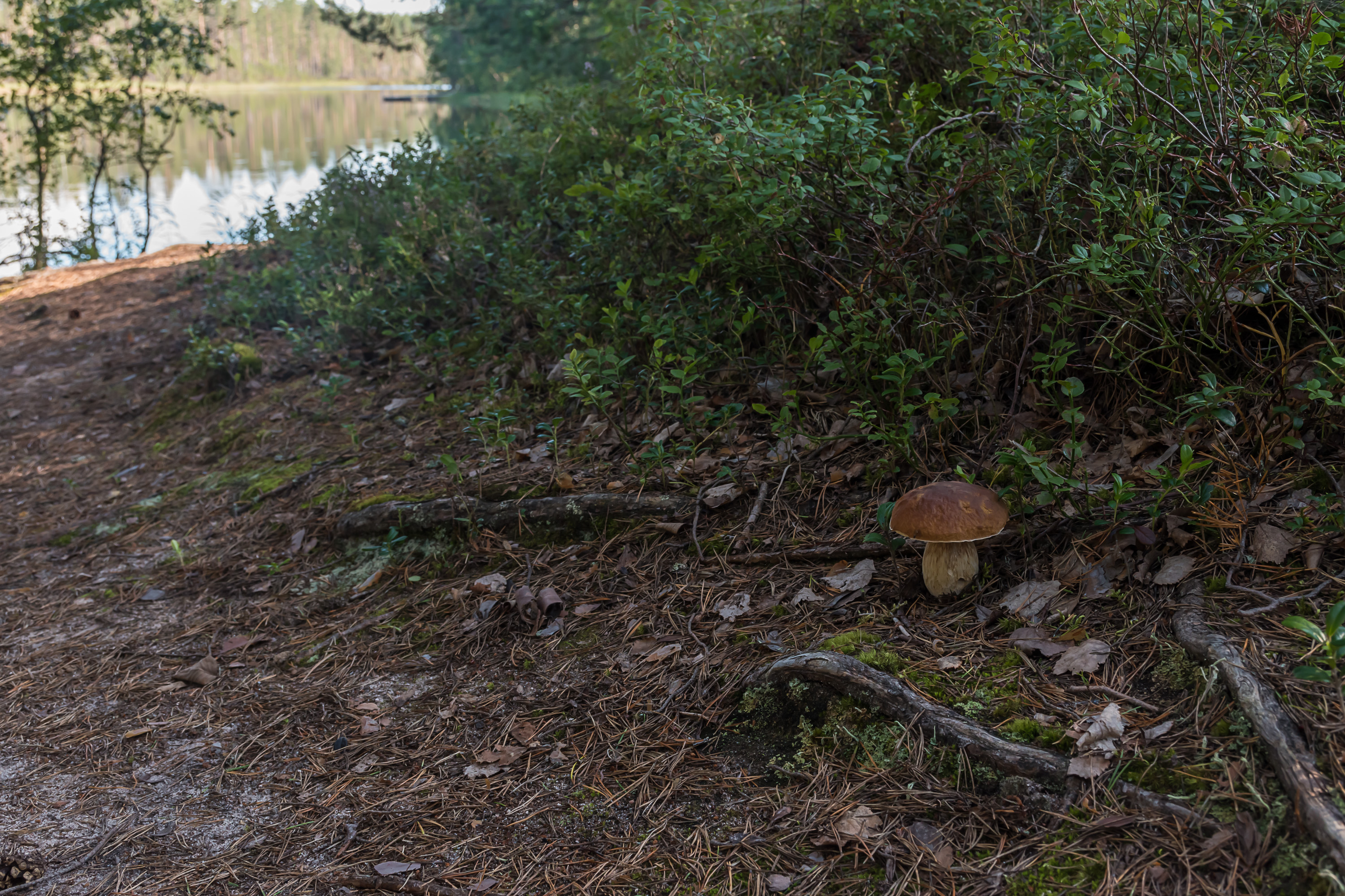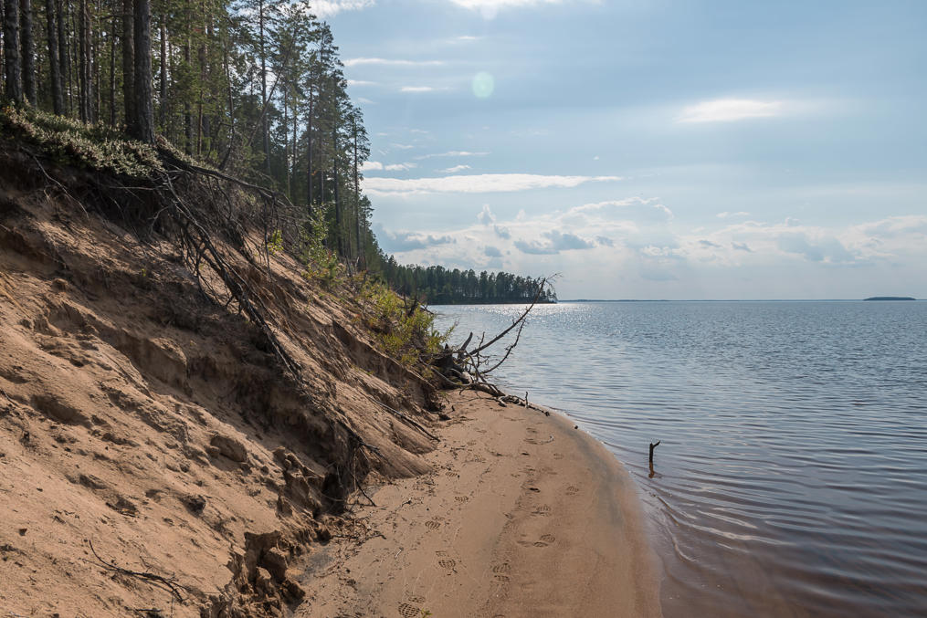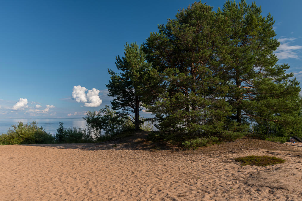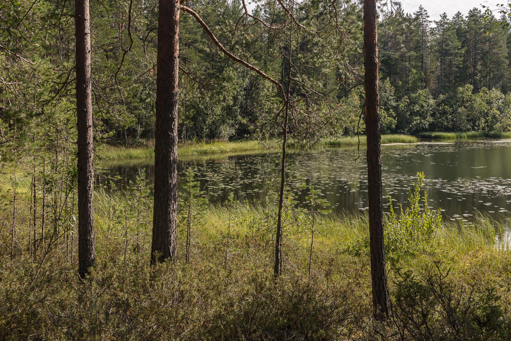 54. Ну а в рекреационной территории Оулуярви, основанной в 1993 году и имеющую площадь 14 кв. км (а считая озеро — 63 кв. км), нас встречает сосновый бор, растущий на продолжении на восток все того же эксера, к которому относится Рокуа. Здесь, правда, рельефа особого нет; здесь основной эскер не развеян ветрами на дюны, как в Рокуа, а сохранился более-менее целым (по нему как раз идет дорога на берег), а вокруг — песчаные равнины, намытые песком с эскера. Зато лесные озерца так же есть.
