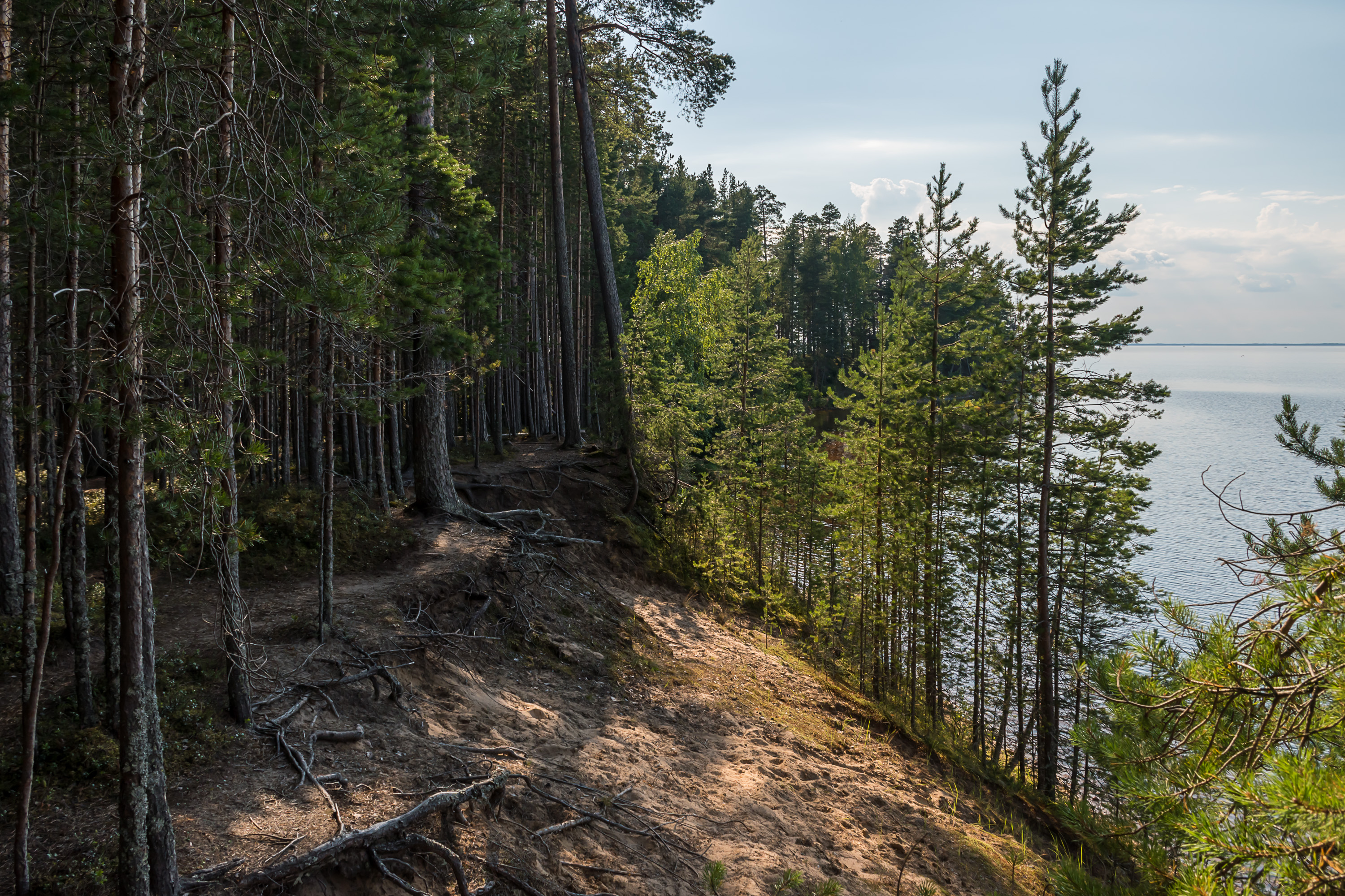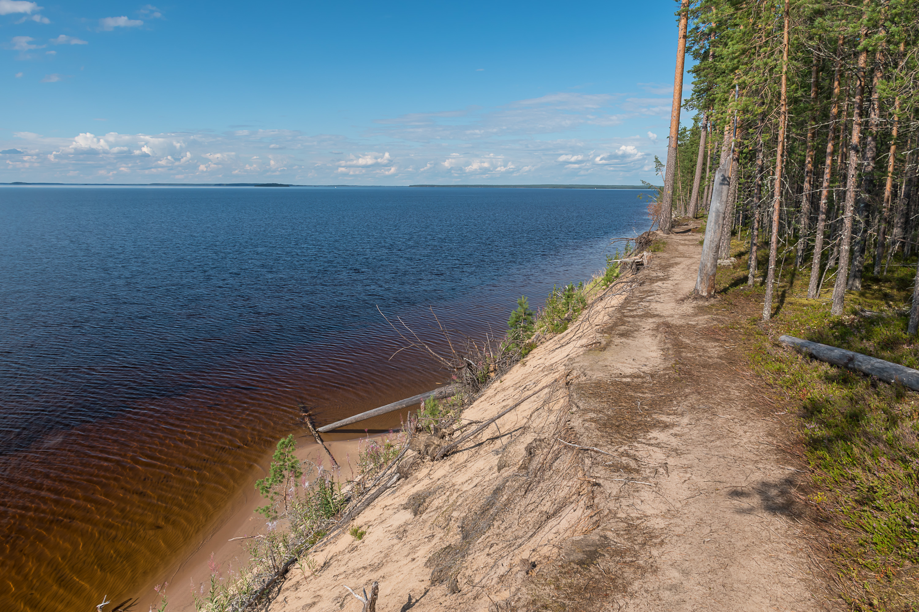 58. Местами обрывы делаются довольно высокими. Вода постоянно их подтачивает, и внизу видны стволы упавших сосен. Я не так давно писал про похожее место — нижнее течение реки Оуланкайоки в национальном парке Оуланка, у тропы Кархункиеррос (фото 12). Там, правда, даже еще повыше будет. В остальном подобные пейзажи в Финляндии крайне редки.