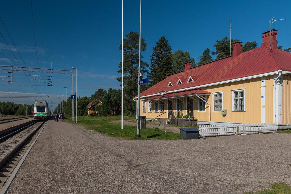 14. Небольшая железнодорожная станция Ваала, с которой мы и начали пост, расположена почти в центре села и стоит на железной дороге Оулу-Каяани, а точнее Оулу-Контиомяки (до узловой станции). Эта линия построена в 1930 году, и смыкает Главный и Савонский ходы на севере, в Оулу; и поезда Хельсинки-Оулу есть и по более короткому Главному ходу (Päärata), через Тампере-Сейняйоки-Кокколу, и по восточному Савонскому (Savon rata), через Коуволу-Миккели-Куопио-Каяани. На фото же остановился другой, коротенький совсем поезд, Куопио-Оулу-Рованиеми. Пассажирские поезда идут тут не очень быстро, 140 км/ч, и останавливаются во всех селах-муниципальных центрах. Всего поездов тут 3-4 пары в день.