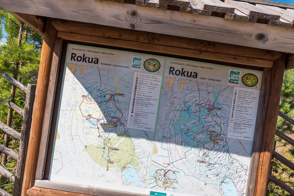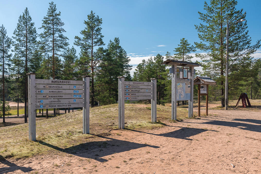 34. Помимо местных пеших маршрутов, Рокуа — а точнее именно отель Rokuanhovi — является отправной точкой для большого пешего Дегтярного маршрута (Tervareitistö). Этот маршрут длиной ровно 100 км проложен вниз по долине реки Оулуйоки, проходит через поселки Утаярви и Мухос, и заканчивается в местечке Санкиваара, уже практически на окраине большого города Оулу (в 2.5 км от остановки городского автобуса). Частично он проходит непосредственно вдоль реки Оулуйоки, но большей частью все же обычными лесами. На маршруте много навесов-лааву, а в Рокуа, Утаярви и Мухосе есть и гостиницы. Есть лыжный вариант маршрута чуть покороче.