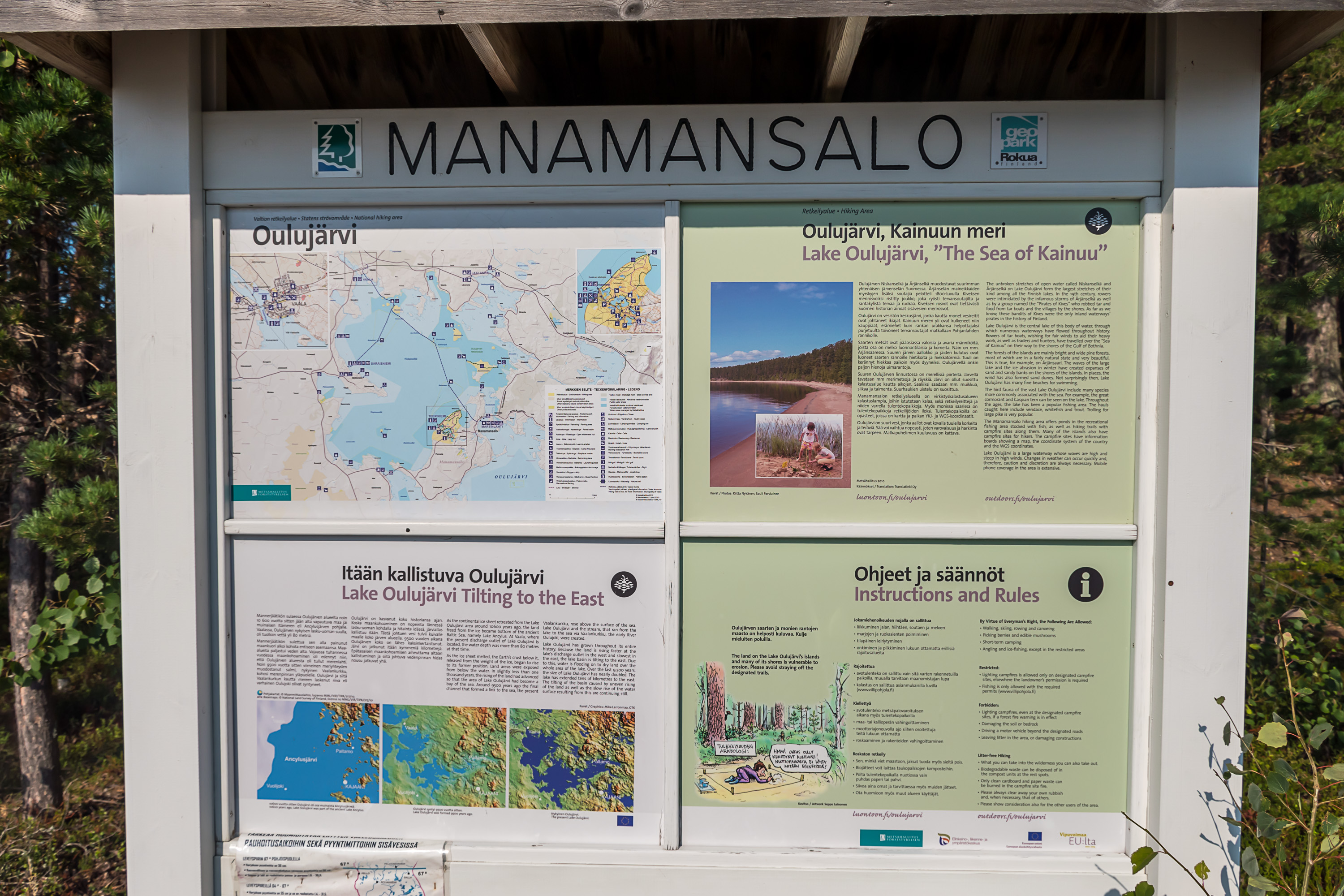 52. И последнее место, куда мы отправляемся на сегодня — рекреационная территория Оулуярви (Oulujärven retkeilyalue) на острове Манамансало (Manamansalo) на Оулуярви. Манамансало — большой остров, 76 кв. км площадью, самый большой на озере Оулуярви, и почти целиком отделяет от Оулуярви его западную часть, Нискаселья. Через северный пролив между Манамансало и берегом переброшен мост, а через южный, более широкий, ходит паром.