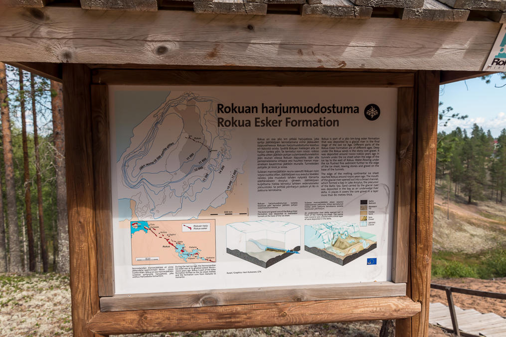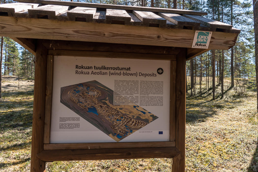 36. А на этом информационном щите как раз наглядно показано, как выглядит рельеф Рокуа в мелком масштабе, и объяснено, почему здесь именно такой лабиринт холмов и впадин, а не просто одна гряда: когда-то цельную песчаную — не моренную, как обычно (из более крупного гравия и щебня), а именно песчаную — гряду просто разметало ветром на бесчисленные гребни дюн. Почему именно песчаную? Долина Оулуйоки геологически существенно отличается от большей части Финляндии — еще до ледникового периода она была сложена осадочными породами, а не гранитом. Из них песок и получился.