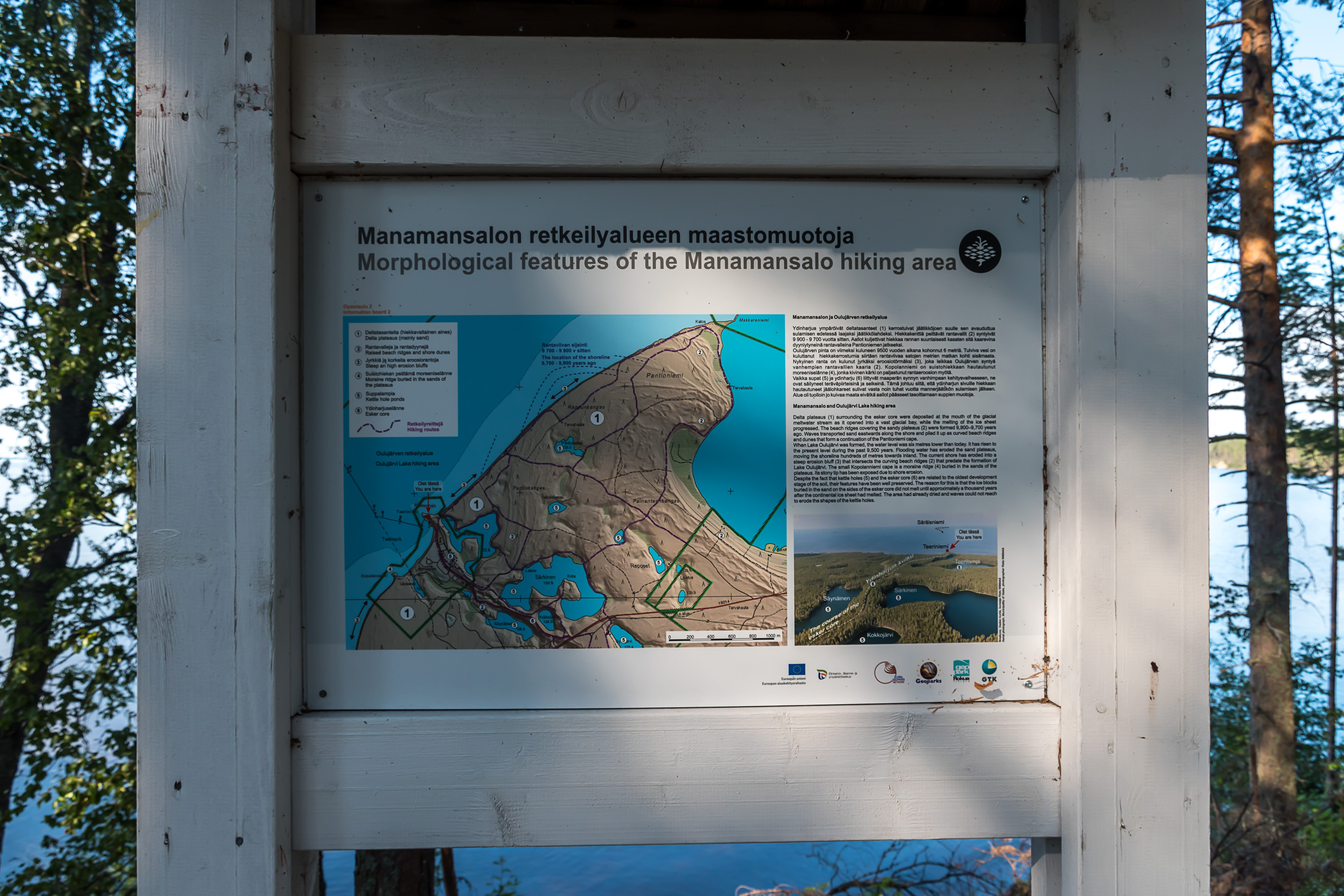 26. Мыс, собственно говоря, является частью длинной цепочки ледниковых гряд, тянущейся от острова Хайлуото в Ботническом заливе под Оулу на юго-восток-восток, через Оулуярви, до Иломантси у российской границы — на 360 км. Такая геологическая формация, именуемая эскерами или озами, а по-фински — харью (harju), для Финляндии исключительно типична, и на информационном щите показано, как они появились — там, где когда-то под ледником текла река, выточенный ей туннель при движении ледника за собой и оставил такой след из обломков горной породы (морены). В Фенноскандии ледник отступал в сторону Скандинавских гор (где много небольших ледников осталось и по сей день), и в Финляндии на этих широтах, соответственно, двигался скорее не с юга на север, а с востока на запад. В направлении его движения протянулась и цепочка эскеров, показанная на карте на этом информационном щите.