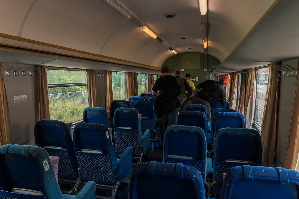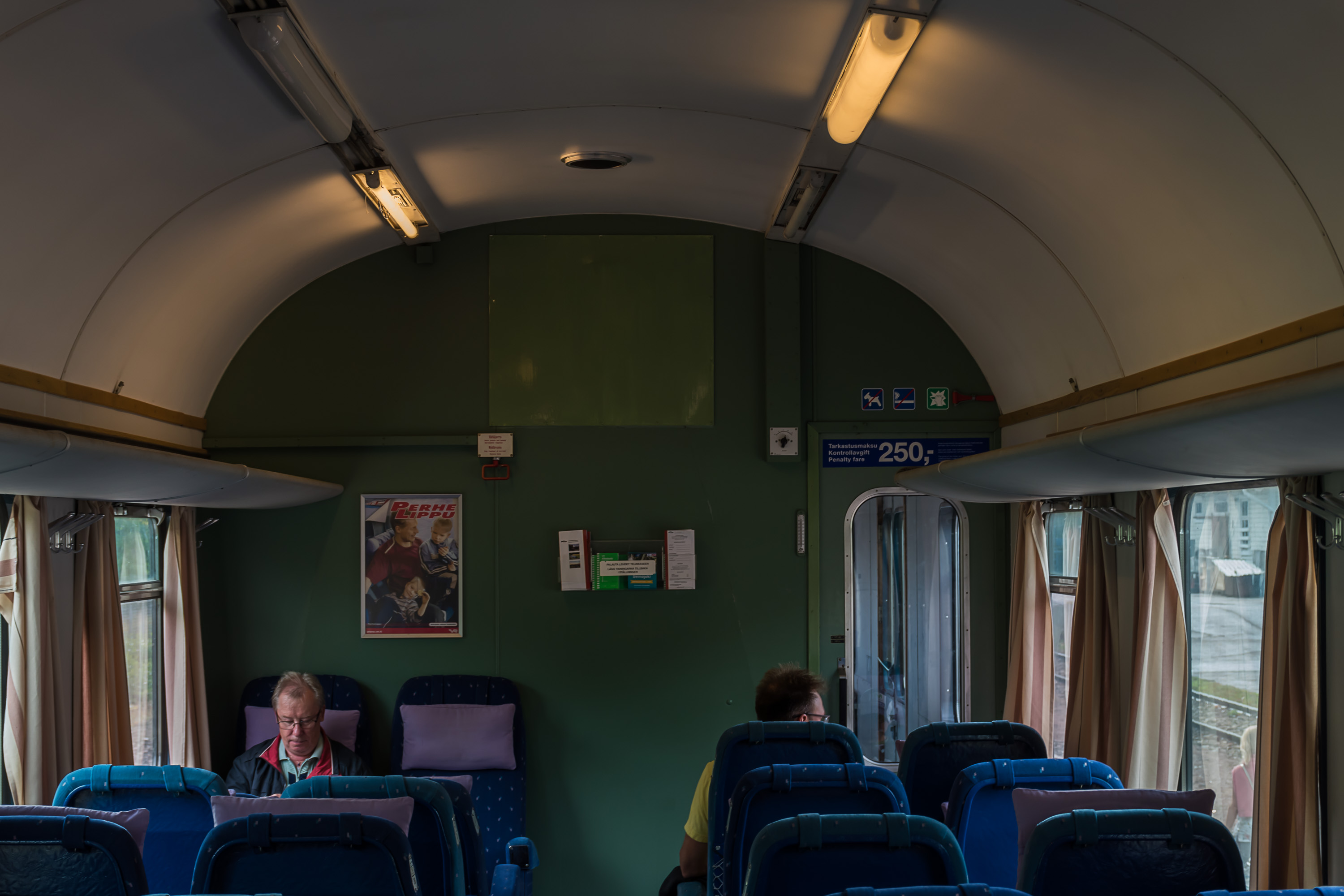 А "синие" вагоны были в 1970-2010-х (отдельные еще используются в ночных поездах и в служебном движении). Уже отдельные элементы интерьера похожи на современные финские поезда. Но штраф за безбилетный проезд еще в марках, а не евро :)