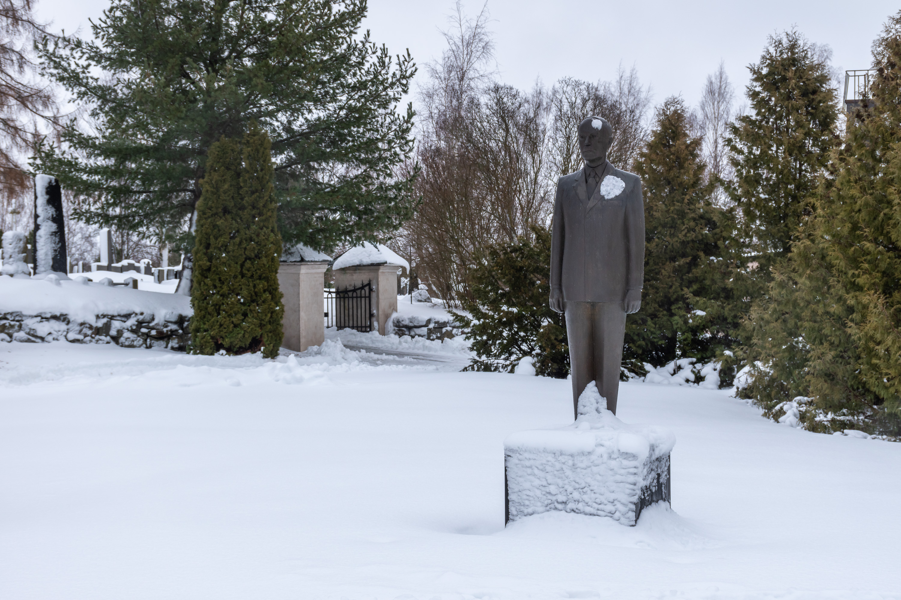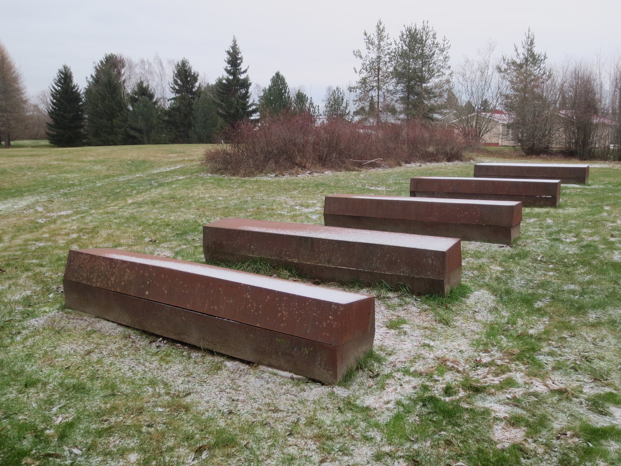Где-то рядом есть скульптура в форме гробов (это не лавочки, это скульптура в форме гробов, я изучил вопрос!), но я в Хуйттинене в феврале 2022 был и под снегом гробы, стало быть, не заметил, так что вот из википедии фотка.