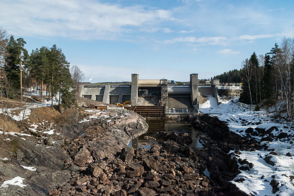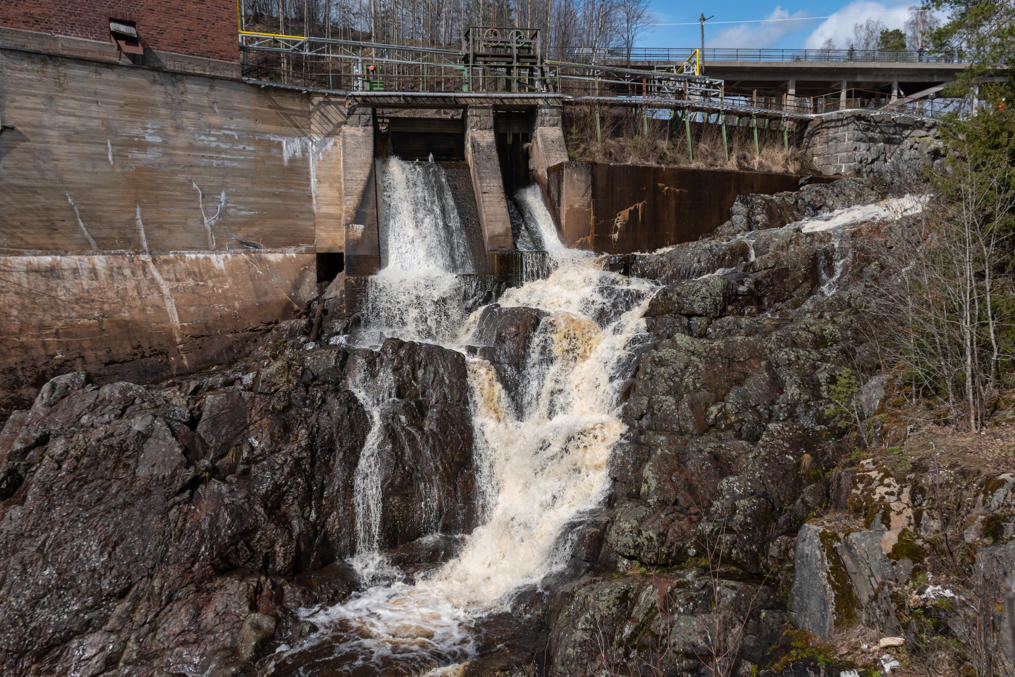 Водосброс на плотине Кюрёскоски (Kyröskoski) в одноименном поселке, в Хямеэнкюрё, в 40 км к северо-западу от Тампере, в сторону Ваасы.