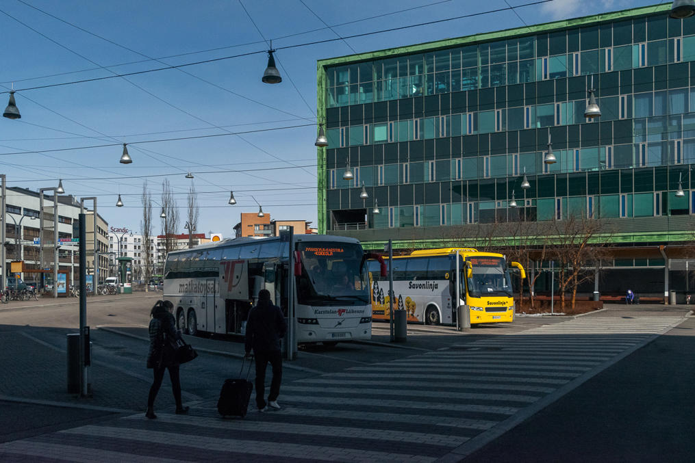 Автовокзалы (linja-autoasema) во многих городах сейчас для удобства пересадки совмещены с железнодорожными вокзалами, и называются в таком случае matkakeskus. Но нередко автобусы могут отправляться от ж/д вокзала или центральной площади города (тори) даже в случаях, когда в городе есть отдельный автовокзал. Это как раз особенно характерно для рейсов, ориентированных в основном на туристов.