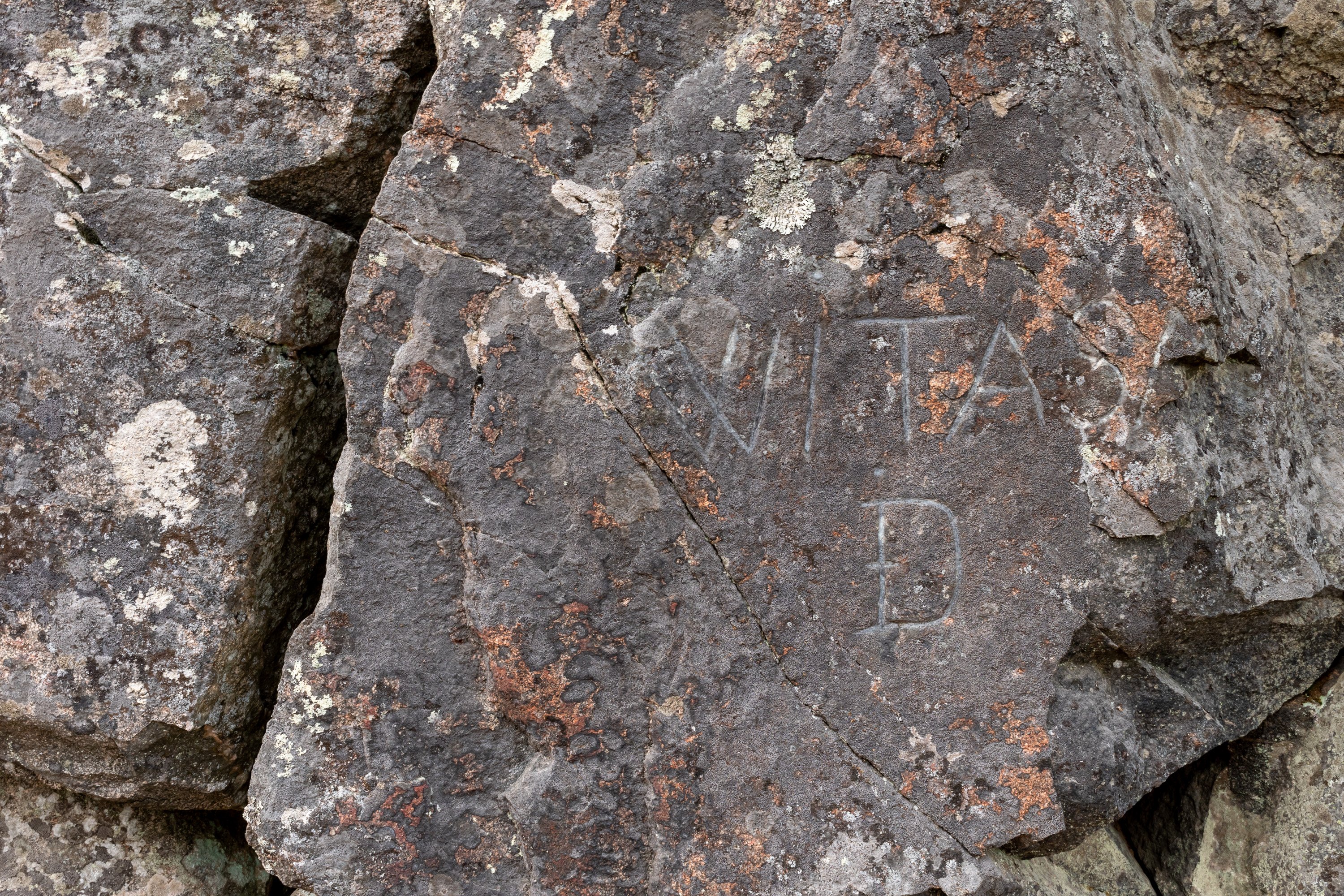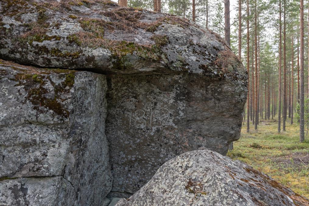 И тут вот у нас крупный валун, на котором выбиты: отчетливо видная корона, год 1819, и с разных сторон названия