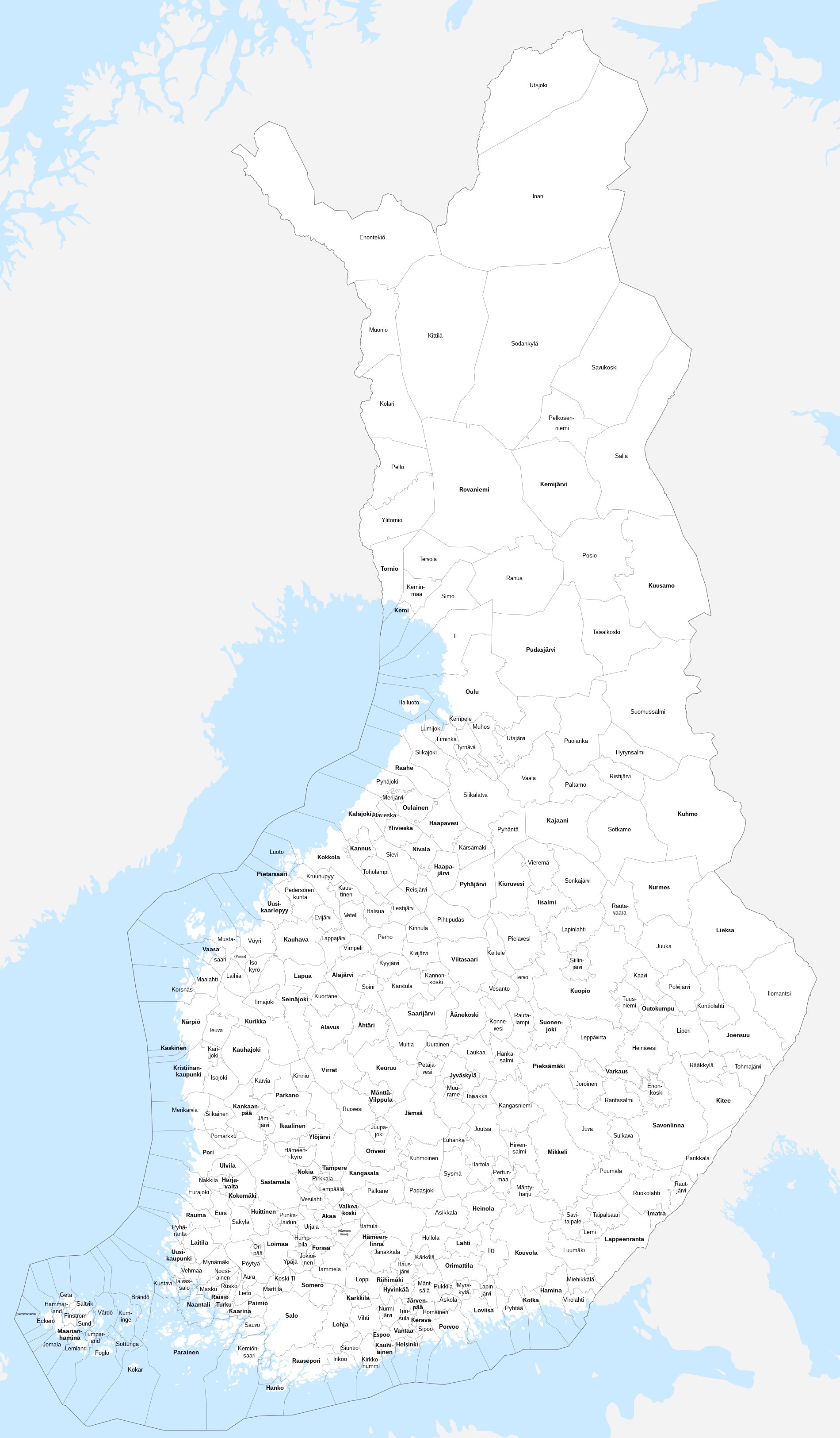 Больше всего муниципалитетов было в 1941, 601. ~50 было утрачено в войну, а с 1960-х мелкие муниципалитеты стали объединять обратно. Даже Лохтая, простиравшейся когда-то сюда от Ботнического залива, больше нет, слилась с городом Коккола. На сегодня (2023-2024) муниципалитетов 309.