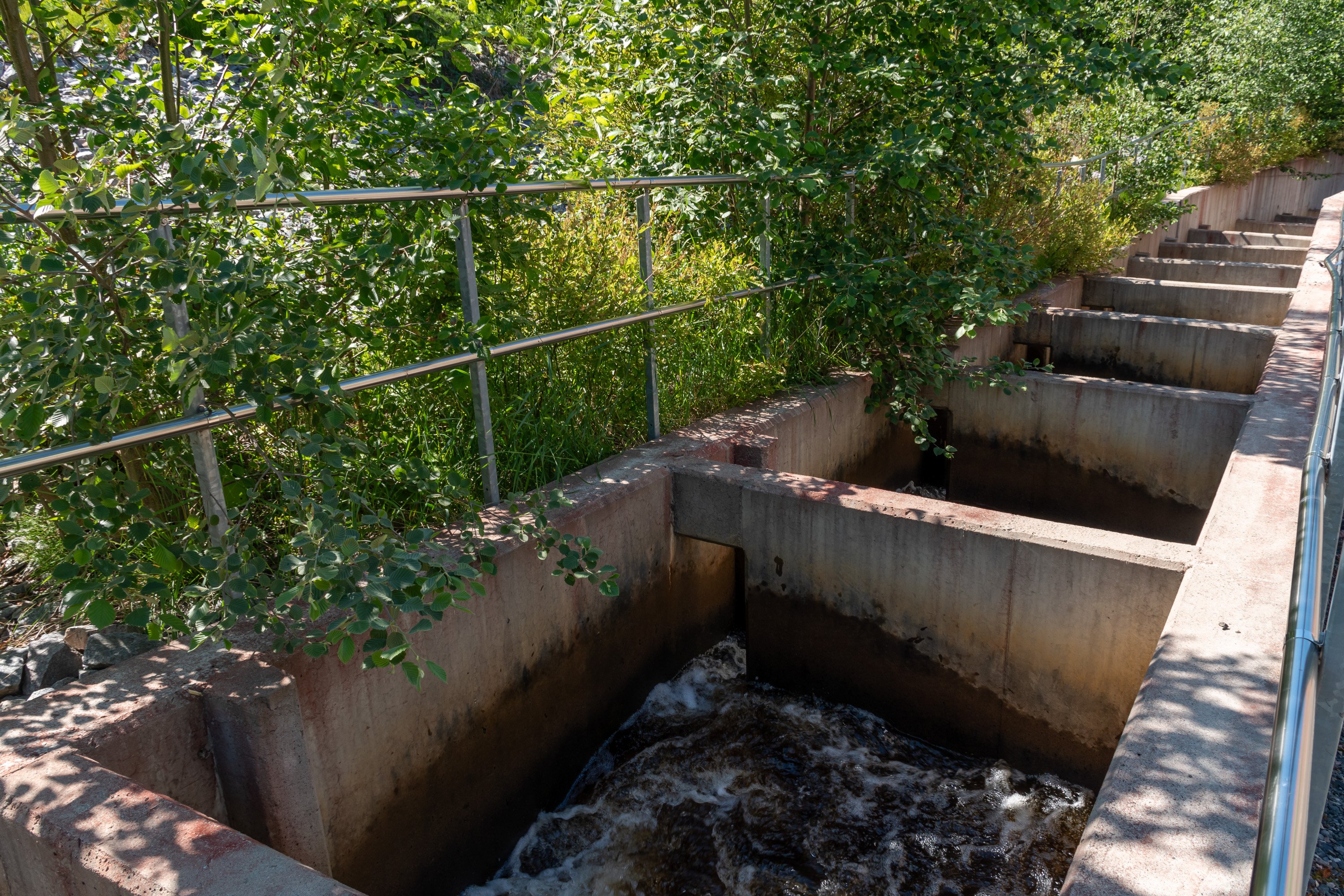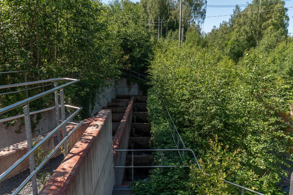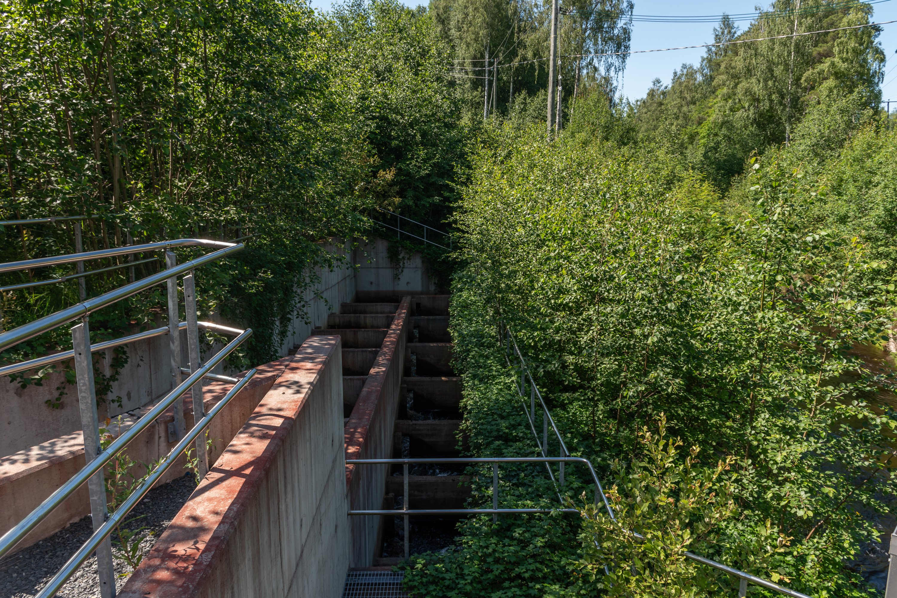 19. Самое позднее дополнение к плотине — рыбоход, который в 2014 году ее хозяев обязал построить суд. Он позволяет кумже подниматься дальше в реку мимо плотины. К сожалению, пока что глупая кумжа почти не догадывается им пользоваться, гадают, что с этим делать теперь.