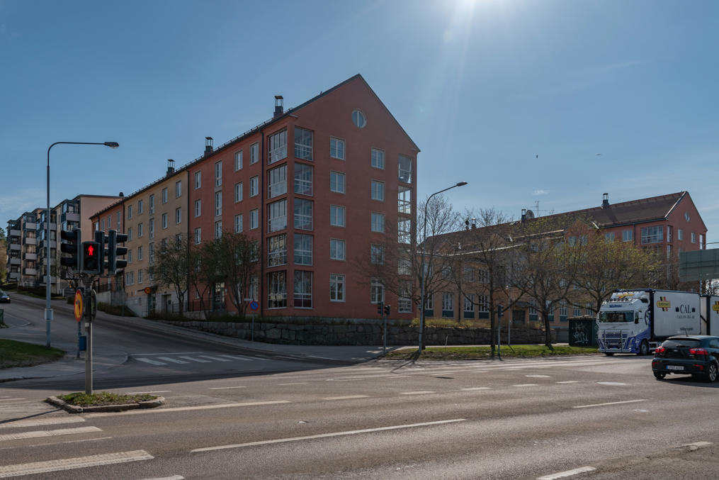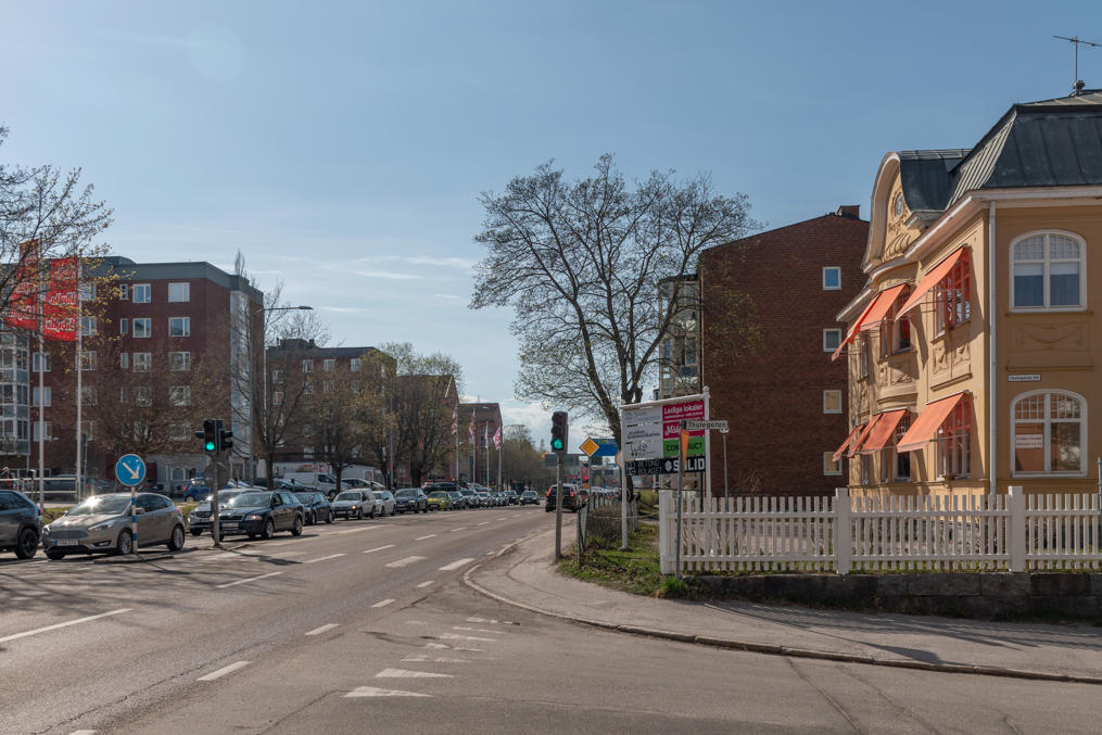 27. А вот следующая улица, Бергсгатан (Bergsgatan, Горная улица) совершенно не тихая — здесь совсем рядом с центром проходит Европейская трасса E14, Сундсвалль-Эстерсунд-Тронхейм. Как и железная дорога, эта тразитная трасса просто проложена почти через центр, без всяких попыток обойти и избежать пересечений с уличной сетью. Пробки в часы пик, как видно, солидные, и их усугубляют переезды на ж/д на перпендикулярных улицах. Да и пешеходам не очень, зеленый свет больше минуты можно ждать. Хотя на этой улице расположено основное скопление многоэтажек в Сёдермальме.