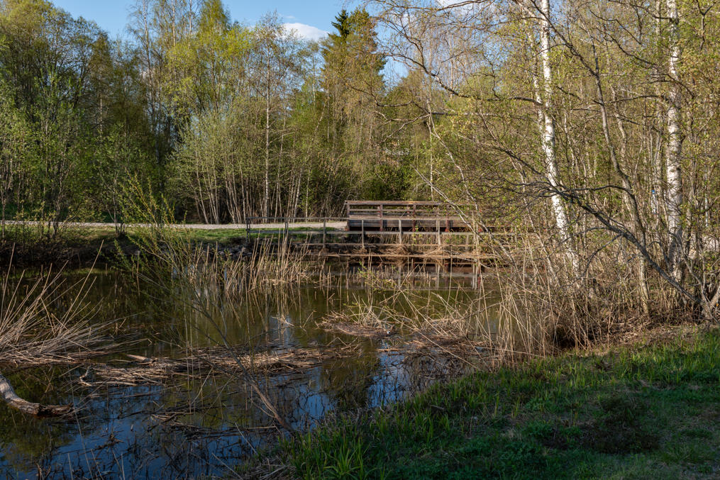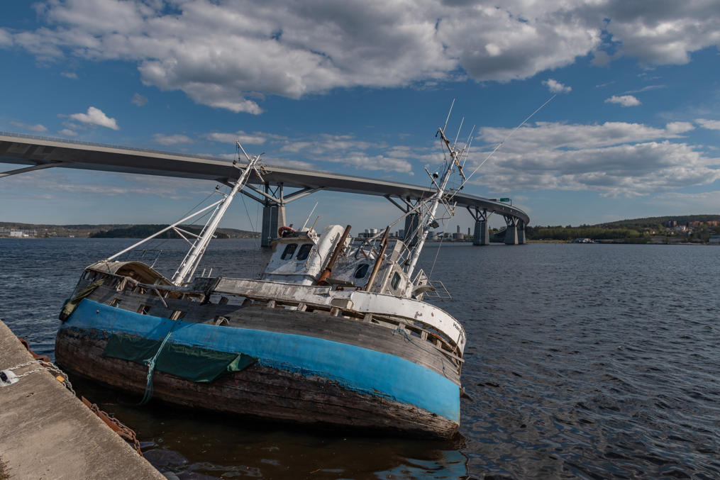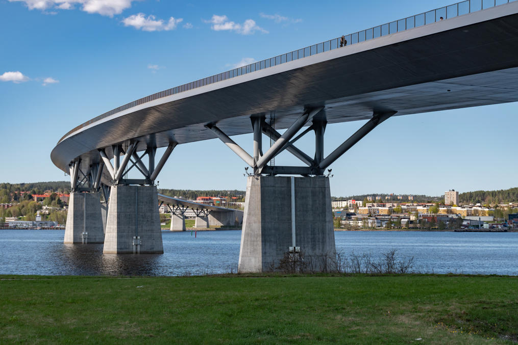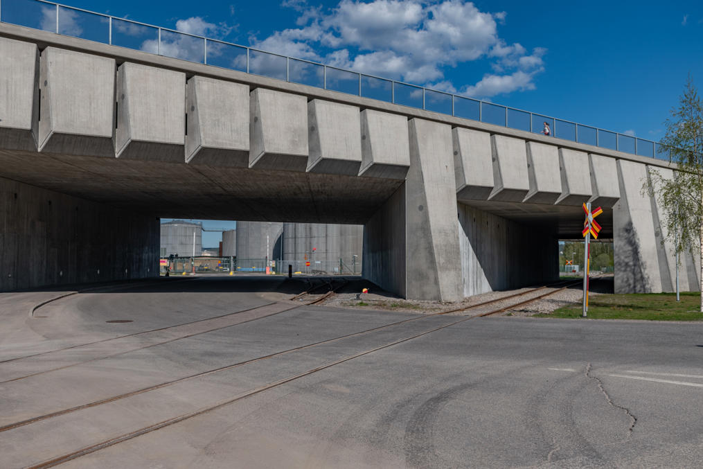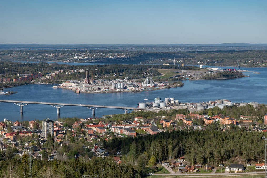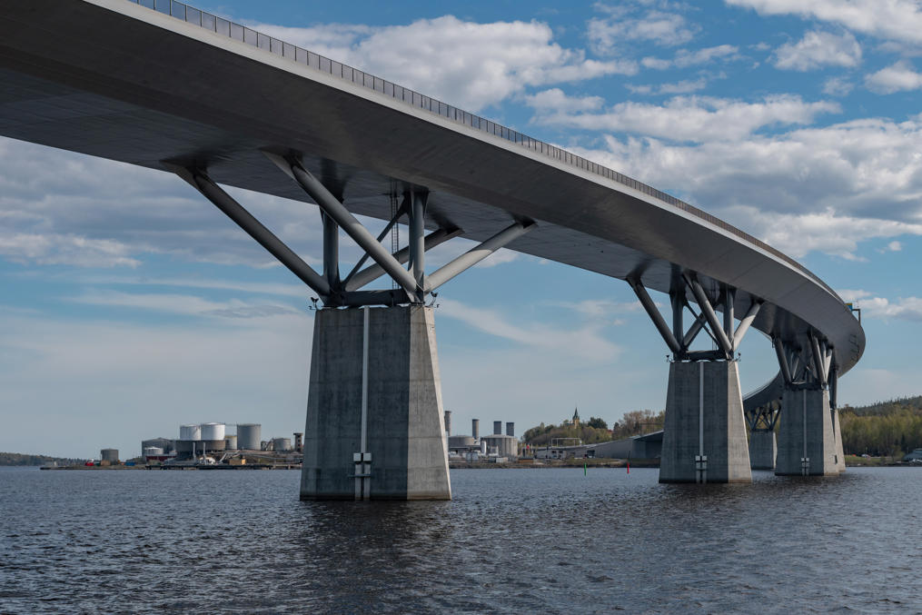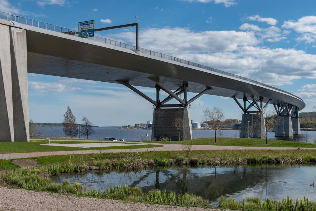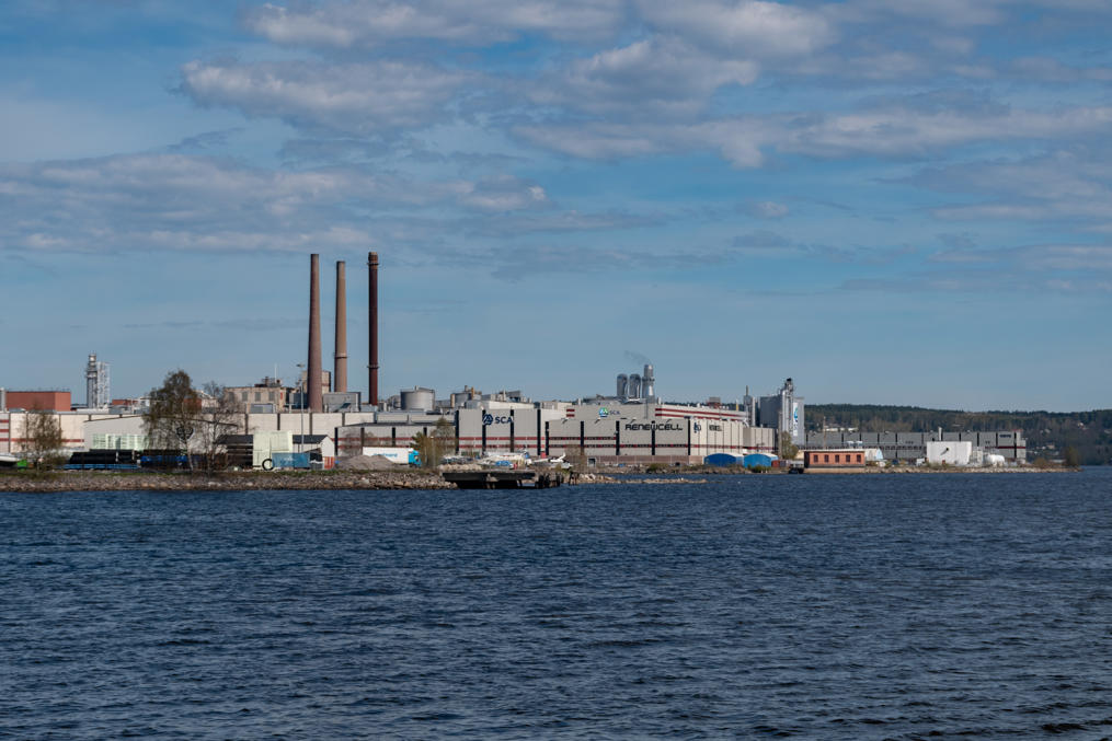 9. Из-под моста хорошо виден целлюлозный комбинат Ортвикен (Ortviken) компании SCA, находящийся в паре километров отсюда. Изначально это был бумажный комбинат, действовавший в 1957-2021. В связи с падением мирового спроса на бумагу он был закрыт, как и многие другие бумажные комбинаты Швеции и Финляндии, зато на его месте построен комбинат т. н. химической термомеханической массы (CMTP), разновидности целлюлозы, и действует с 2023.