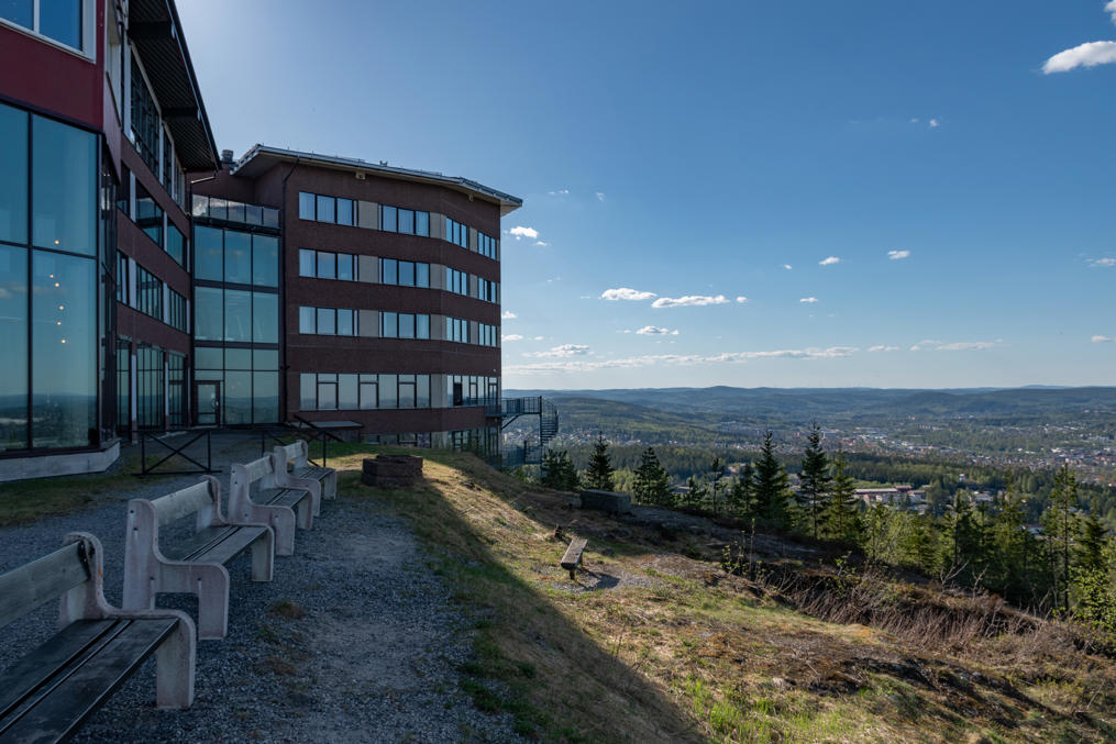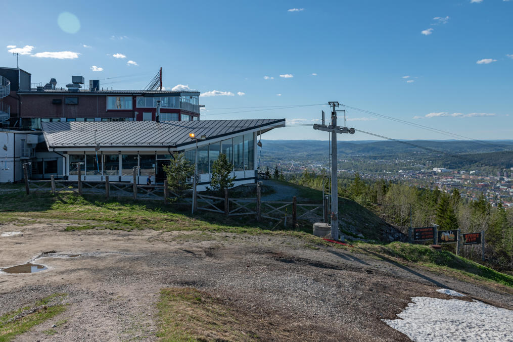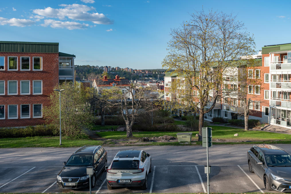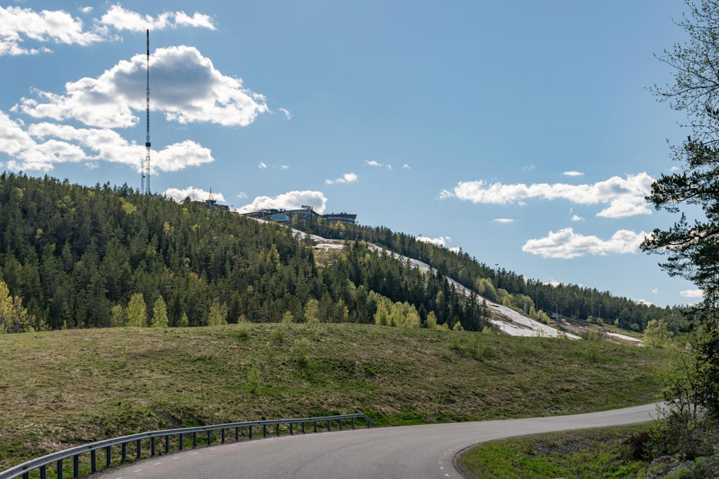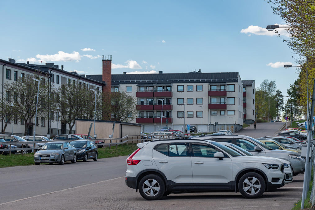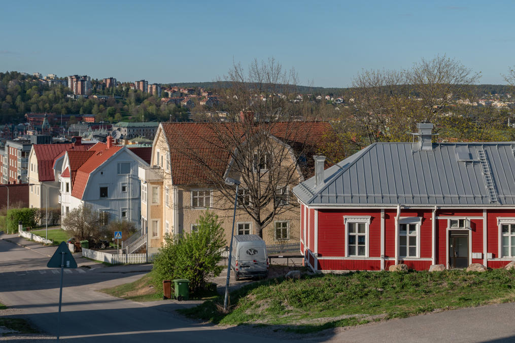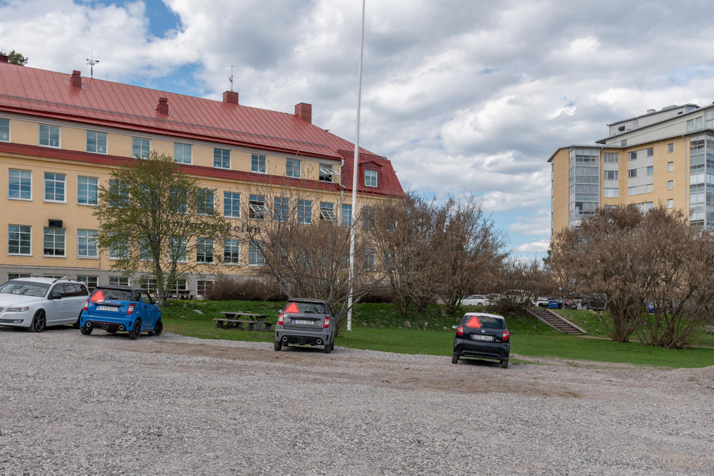 1. К востоку от Северной горы Норра-Бергет, между ней и автомагистралью E4, располагается тихий район Хага (Haga, швед. Пастбище). У дороги на гору стоит частная школа Mimerskolan. На парковке видны машины старшеклассников — с красными треугольниками "медленное транспортное средство" — потому что на самом деле это так называемые A-тракторы.