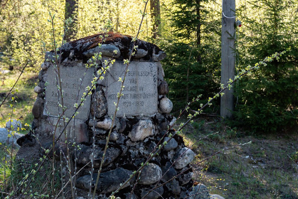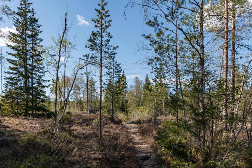 42. В одном месте, под ЛЭП, обнаружился интересный артефакт. В Швеции нередко встречаются такие капитальные каменные указатели, с расстояниями куда-либо или на каких-либо границах; видимо, когда-то эта тропинка была вполне официальной дорожкой. И на указателе, к тому же, упоминается трамвай (spårvägen) — одно из направлений на нем к трамвайной остановке! А трамвай, как мы помним, в Сундсвалле был закрыт еще в 1952. Долговечный указатель, конечно, еще много веков будет стоять как памятник тому трамваю.