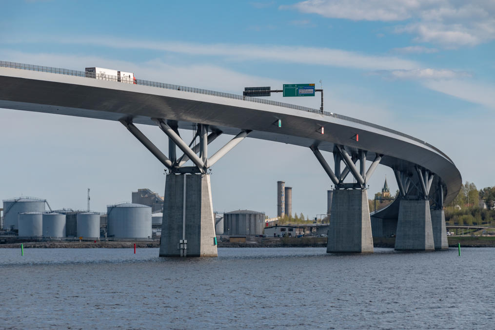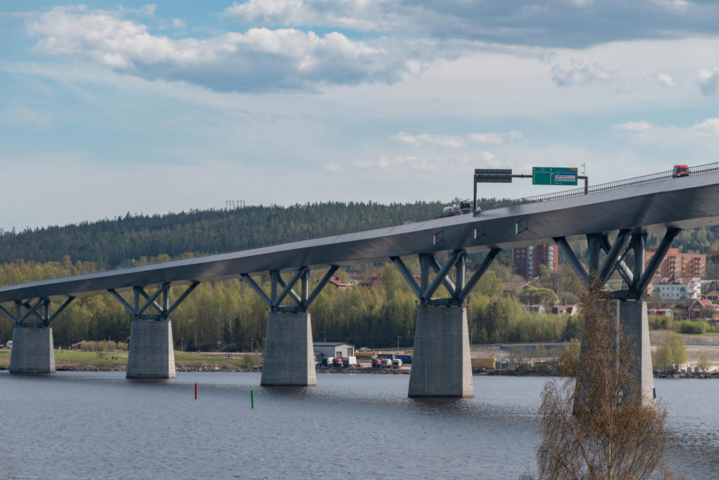 6. И как раз с этого путепровода хорошо видно, как трасса E4 уходит на Сундсвалльский мост (Sundsvallsbron). Мост, несущий 2+2 полосы и велопешеходную дорожку, в этом ракурсе плохо видную, имеет общую длину 2109 м и построен в 2014 году — до этого, как уже говорились, все ездили через центр Сундсвалля, и пробки, наверное, были еще в десять раз хуже, чем сейчас. Мост является платным, о чем говорит значок справа от номера E4 на указателе — за проезд с легковой машины берут 9 крон. В Швеции всего несколько платных мостов, а именно на данный момент три; это юридически отдельный от платного въезда в город вид платежа, т. н. инфраструктурный (infrastrukturavgifter); платный въезд в город в Швеции есть в Стокгольме и Гётеборге, и юридически является вообще налогом. Как и на всех остальных платных дорогах и въездах в города в Швеции и Норвегии оплата работает автоматически, а в частности для зарегистрированных в Финляндии машин счет придет по почте через какое-то, достаточно значительное, время. Я через сам мост так ни разу и не проехал, находясь в центре Сундсвалля (через центр проезд бесплатный), так что показать, как выглядит счет, не смогу.