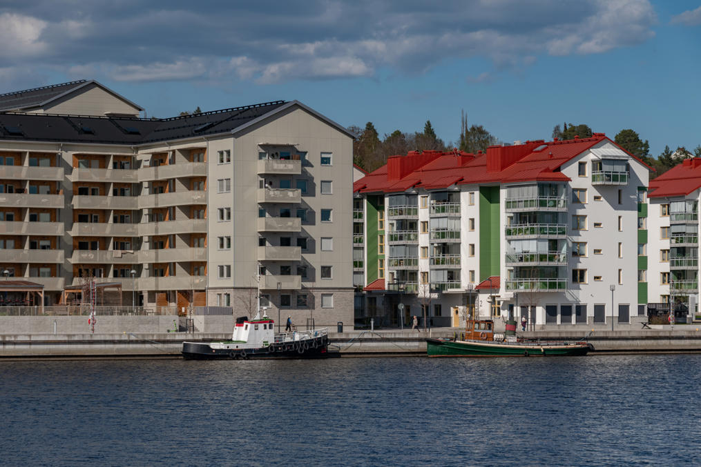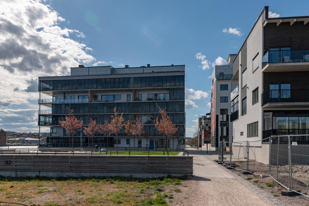14. За небольшой промзоной начинается идущий почти до центра новый жилой район — Северная пристань, Норра-Кайен (Norra kajen). Тут видно, что он еще не полностью достроен. Как несложно догадаться, до относительно недавних пор здесь располагался порт, и этот его район назывался Хеффнеровой пристанью (Heffernskajen), в честь лесопилки Пера Фредрика Хеффнера (Per Fredrik Heffner, 1788-1873), действовавшей тут до 1933. Процесс застройки набережной был небыстрый; начали планировать в 2000-х, потом, как водится, обжаловали да судились, в итоге начали строить в 2014 и первые дома начали заселять в 2016.