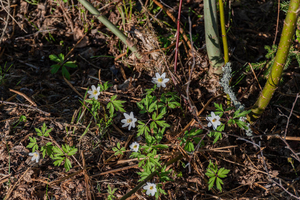 47. Я с горы спустился в западном направлении, по лыжнями, на которых в лощинах еще сохранялось немного снега. Больше всего в местных лесах в это время года, конечно, ветреницы — местами весь лес в белых звездочках. В Финляндии так бывает обычно только в южных лесах, ближе к Финскому заливу — на более северных широтах ветреница растет, но не так массово.