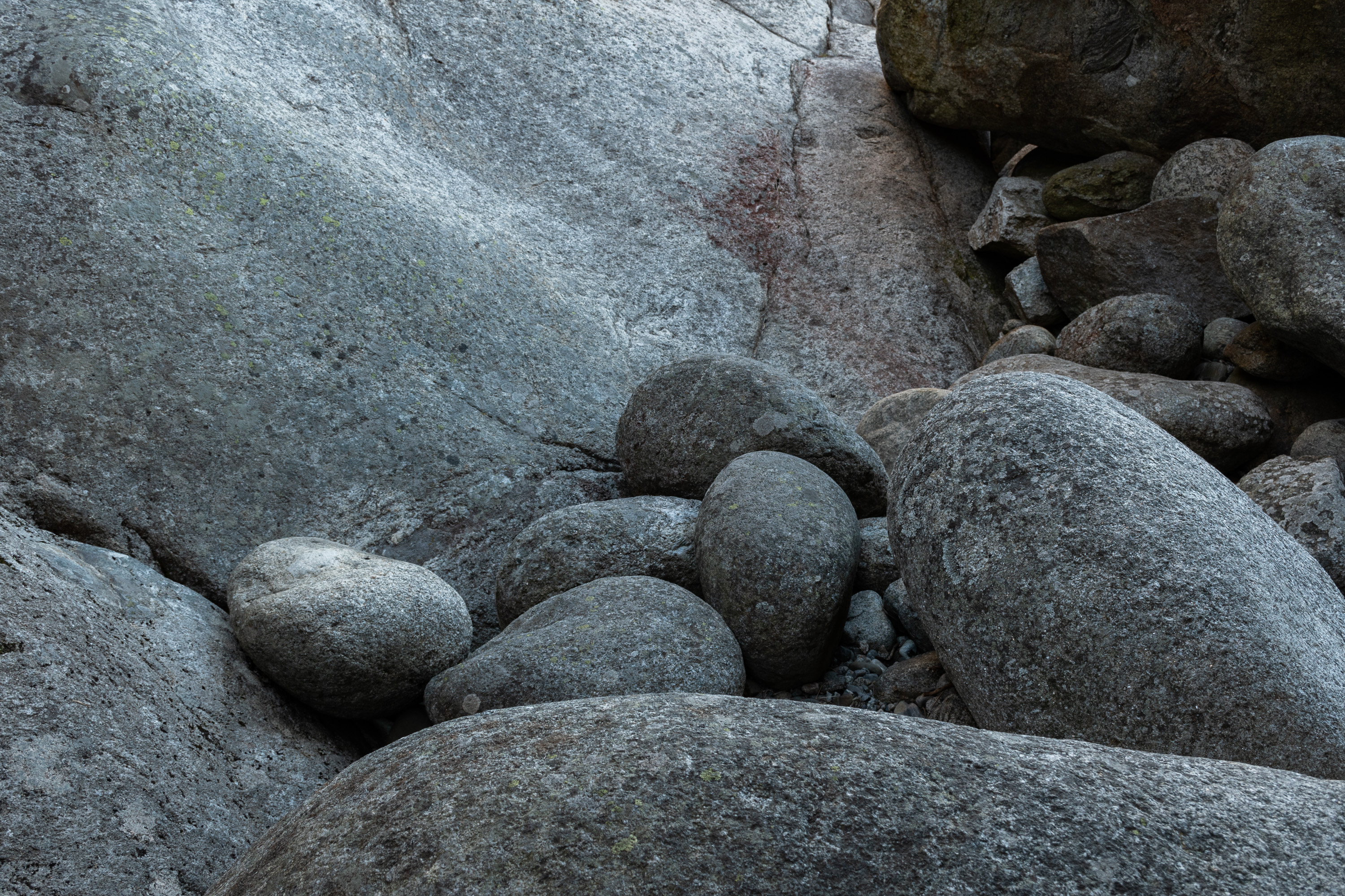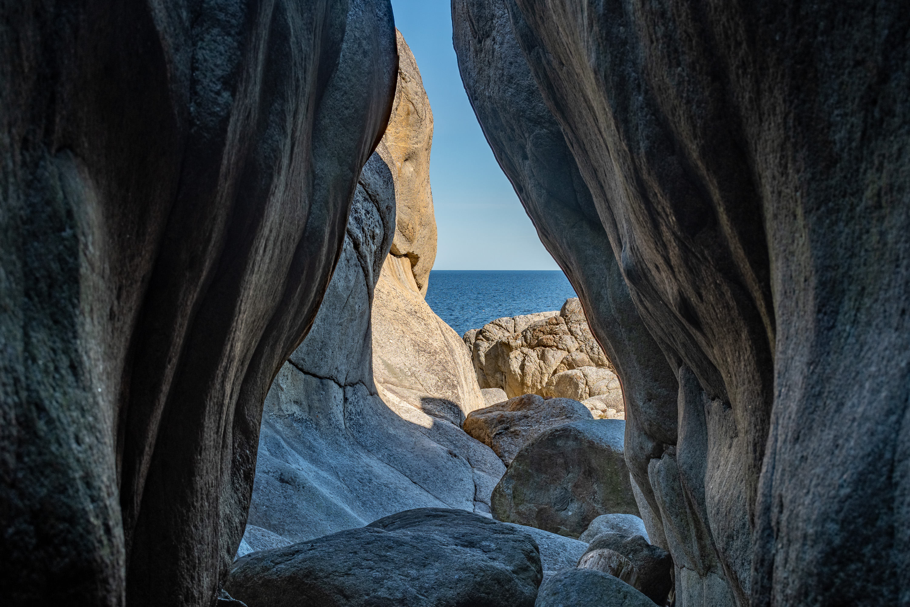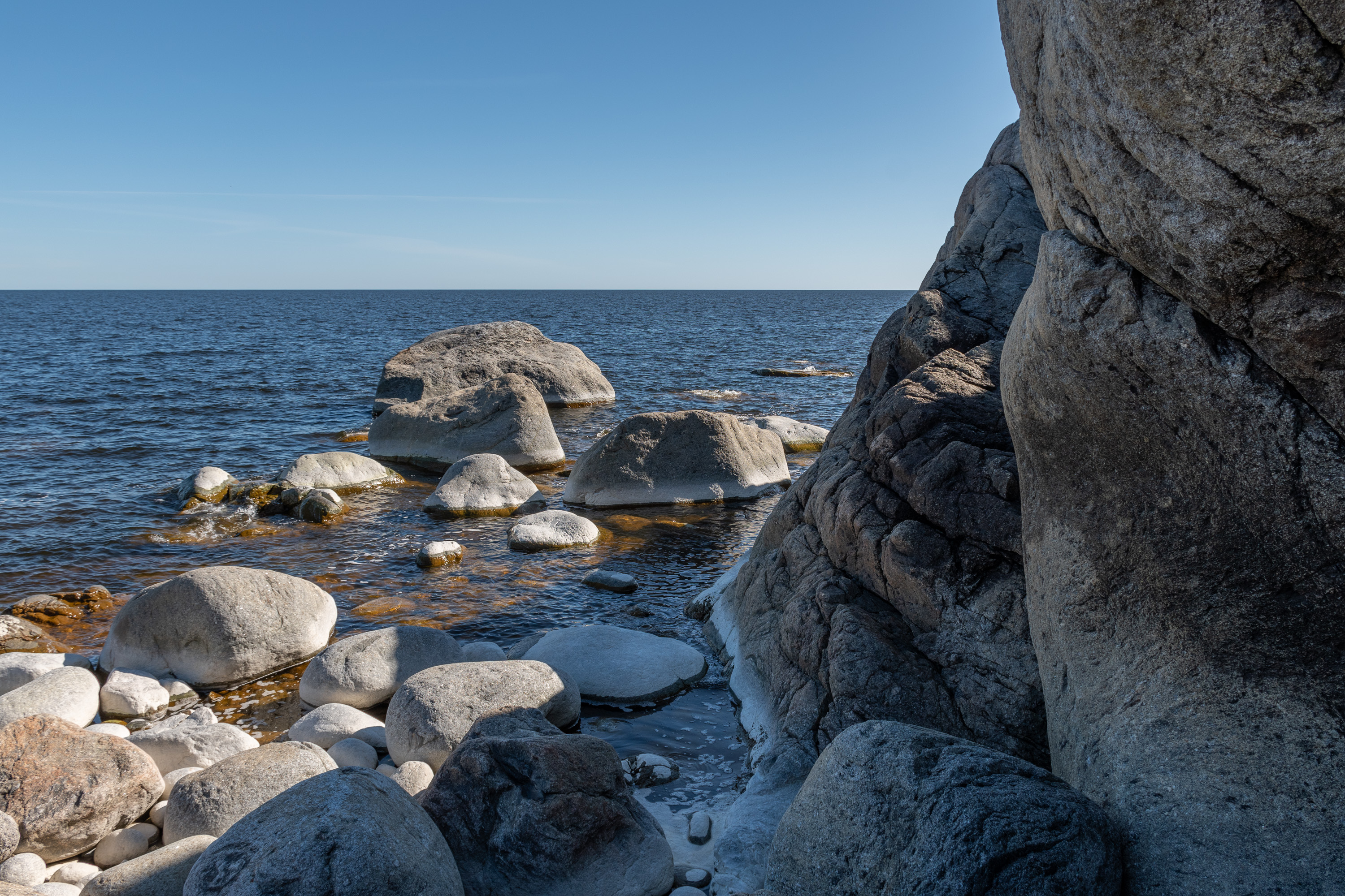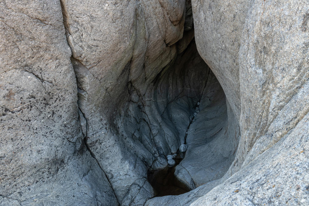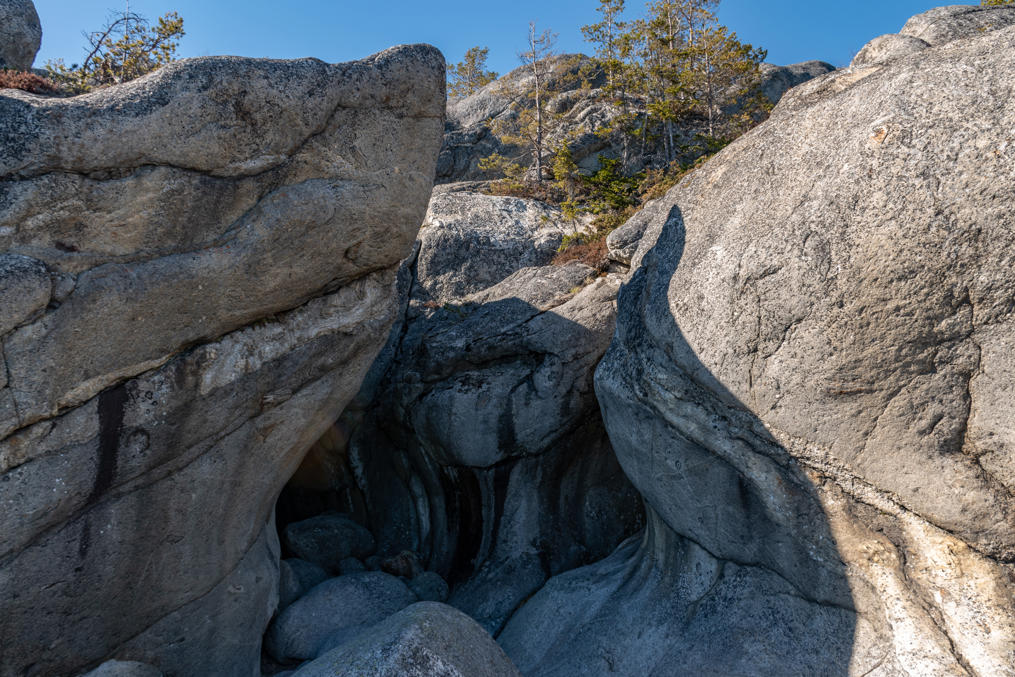 Стены пещер и лежащие в них камни окатаны, как крупная галька. Пещеры, конечно, были изначально подводными, но из-за подъема земной коры в районе Высокого Берега со скоростью 8 мм в год теперь на суше.