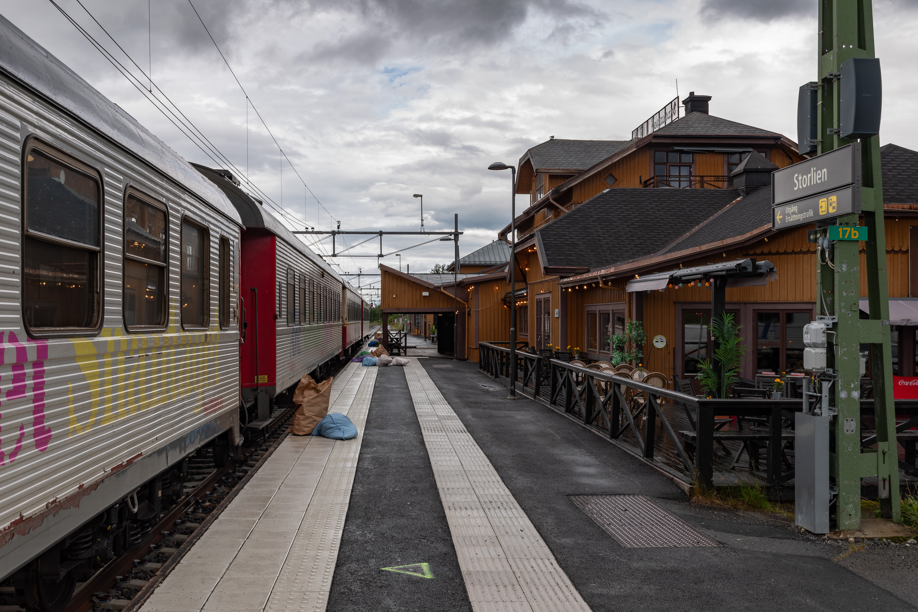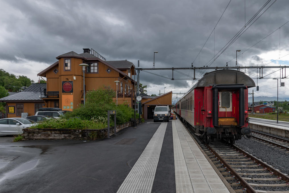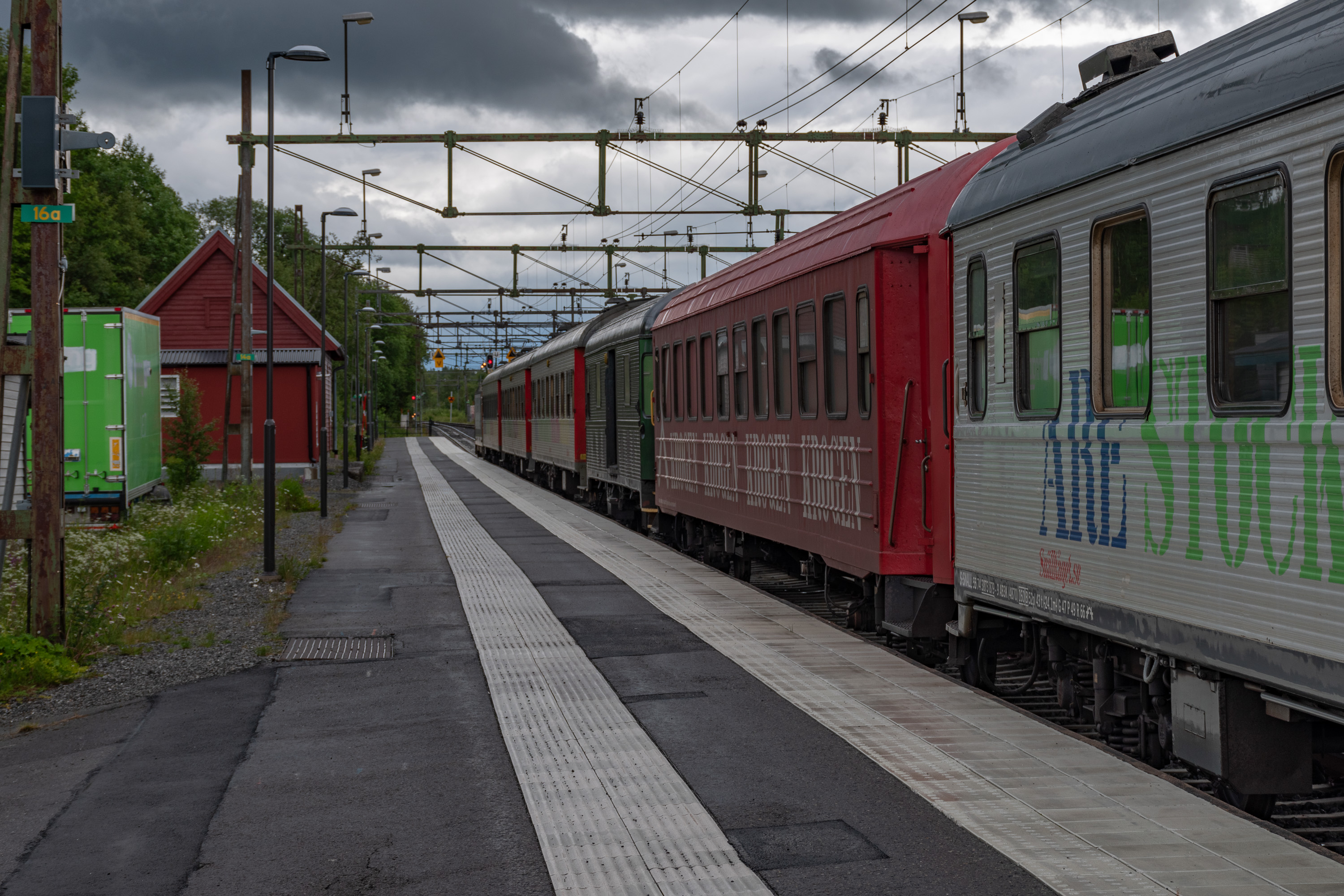 Железная дорога же построена в 1886 году, во времена, когда Норвегия еще принадлежала Швеции. На станции стоял состав спального поезда Стурлиен-Стокгольм-Мальмё компании Snälltåget, проводники белье как раз выгружали.