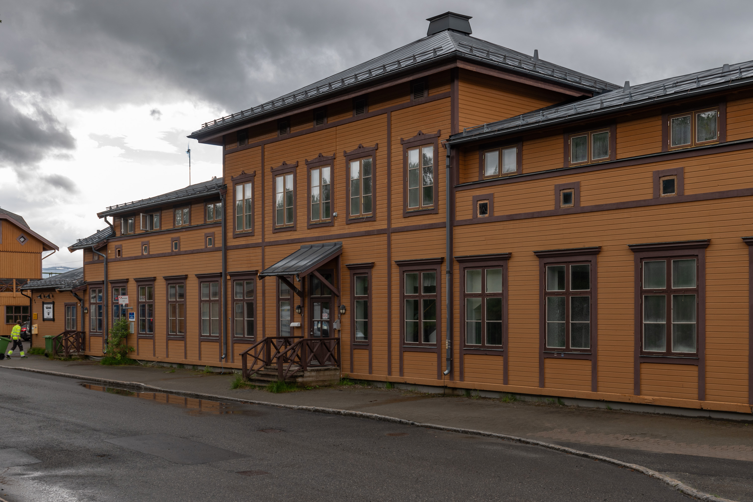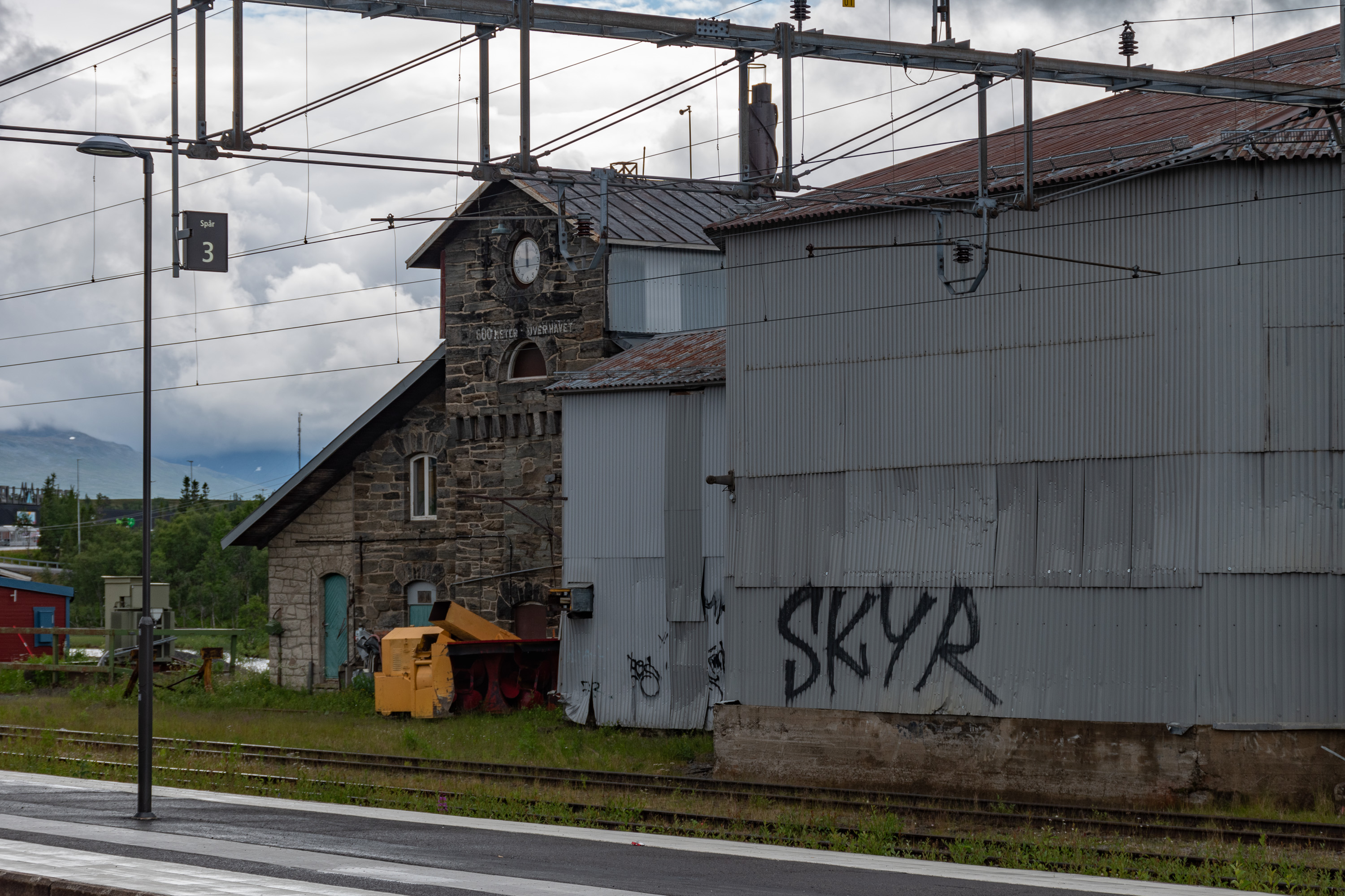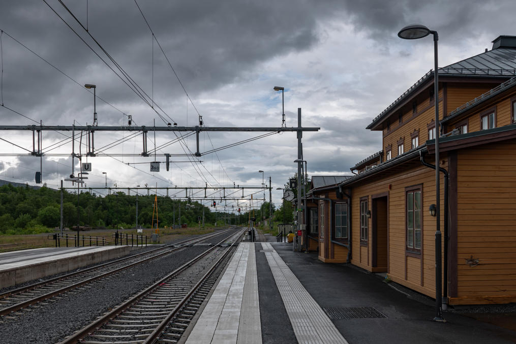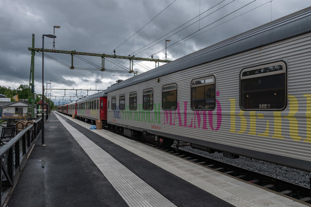 Железная дорога же построена в 1886 году, во времена, когда Норвегия еще принадлежала Швеции. На станции стоял состав спального поезда Стурлиен-Стокгольм-Мальмё компании Snälltåget, проводники белье как раз выгружали.