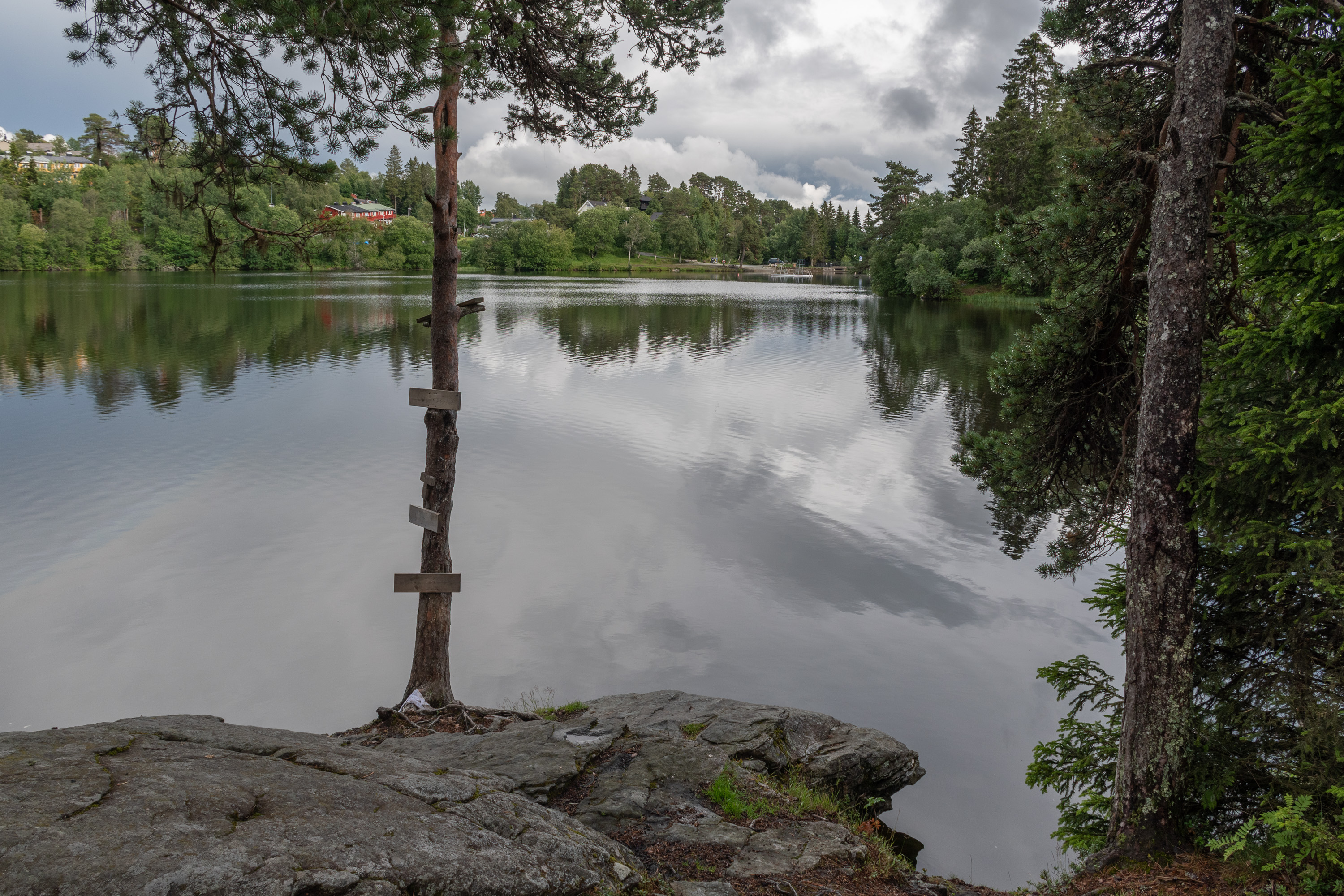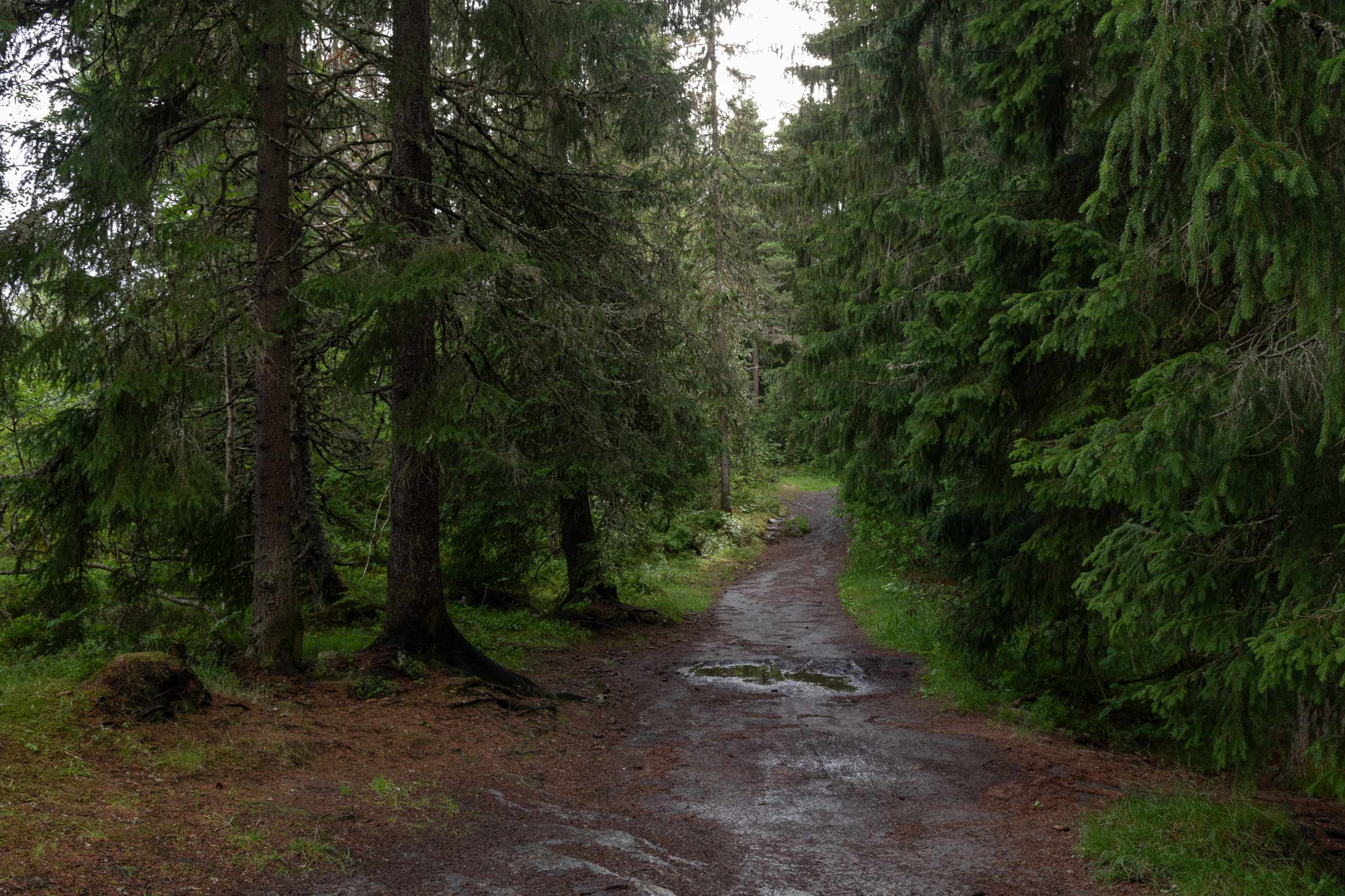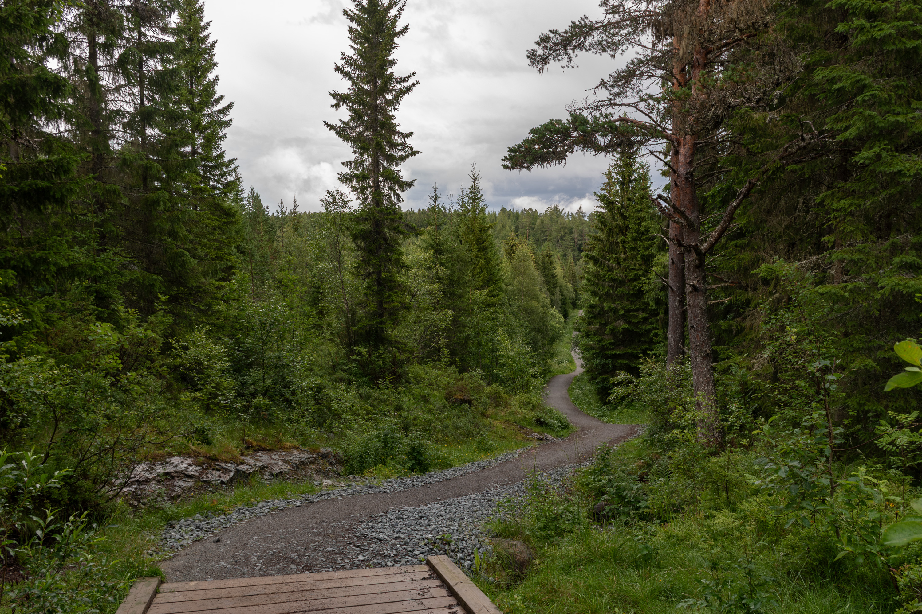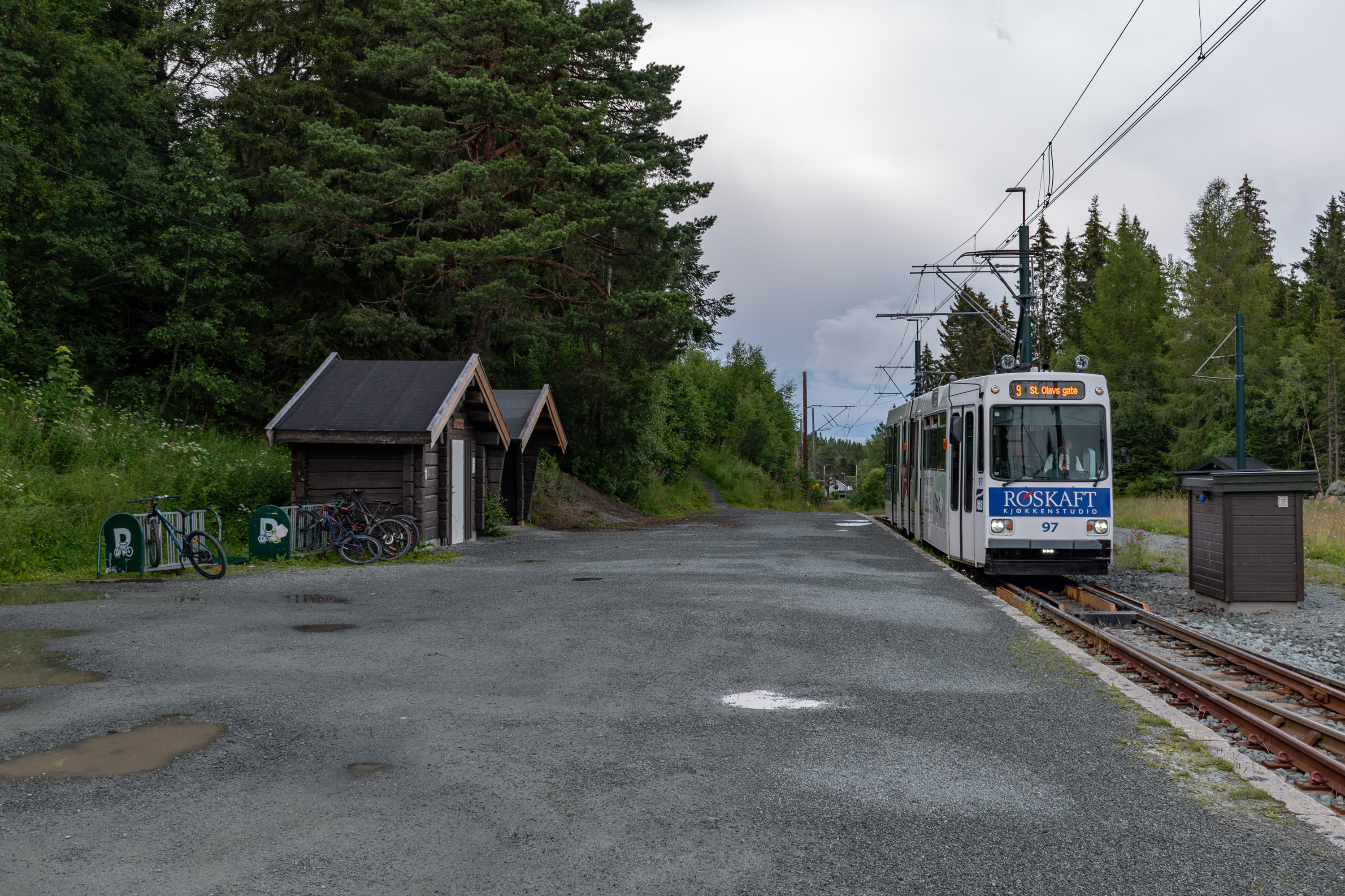 18. Ну и конечная, кольцо Лиан (Lian) совсем в лесу. Путь один, но есть тупичок. 234 м над уровнем моря — солидно трамвай забирается! До горы Грокаллен (Gråkallen, 552 м), в честь которой линия и названа, остается несколько километров пешком — тоже не успел прогуляться