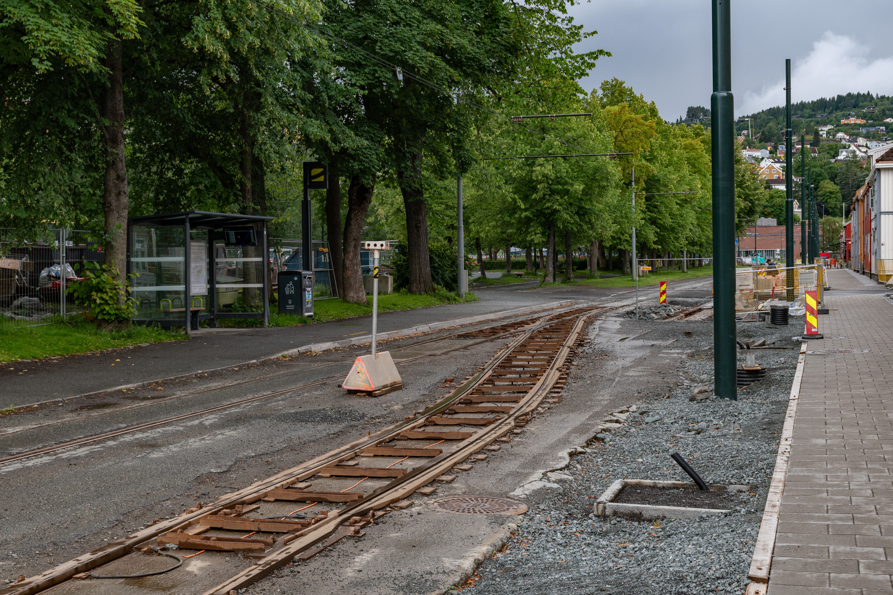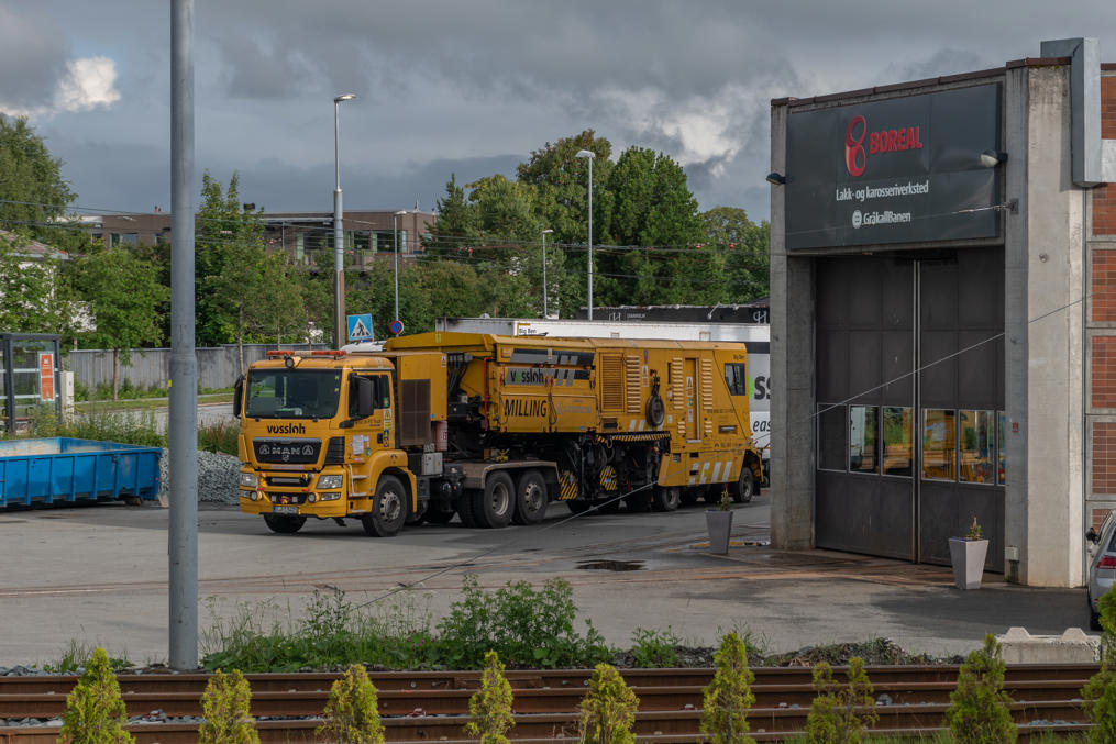 13. Дальше депо, трамвайный музей и промежуточное кольцо Мункволль (Munkvoll). У депо стоит вроде бы рельсошлифовальная машина.