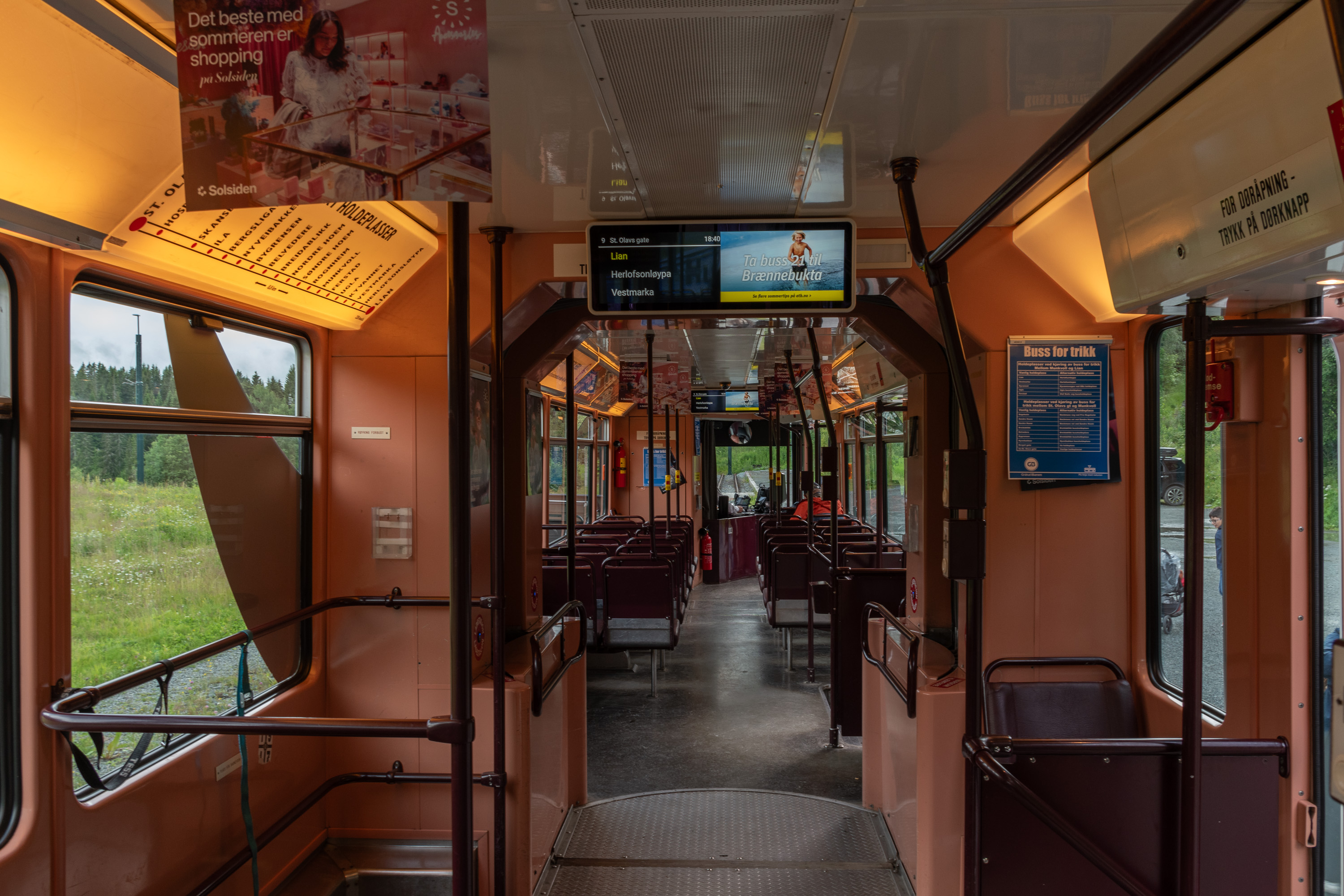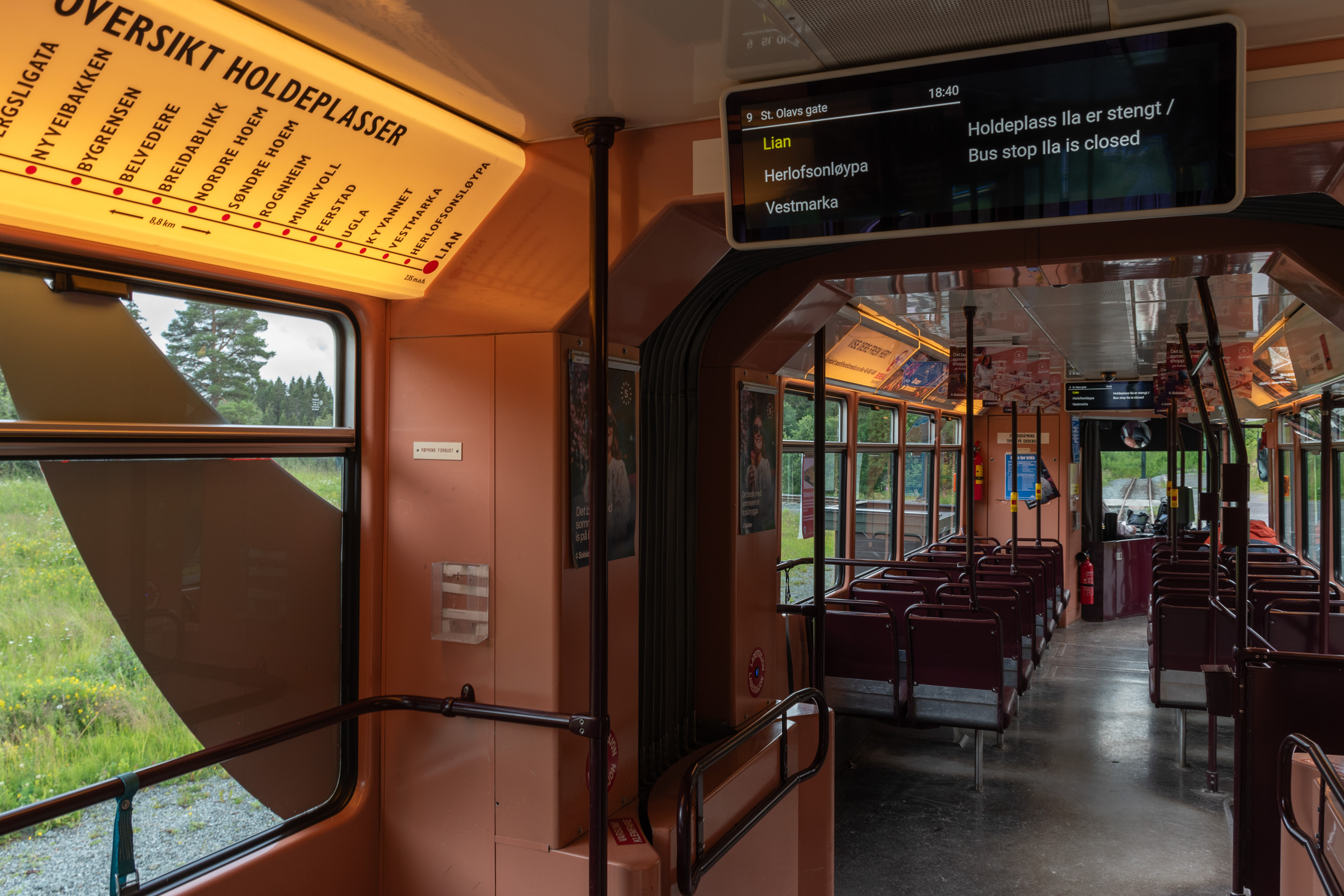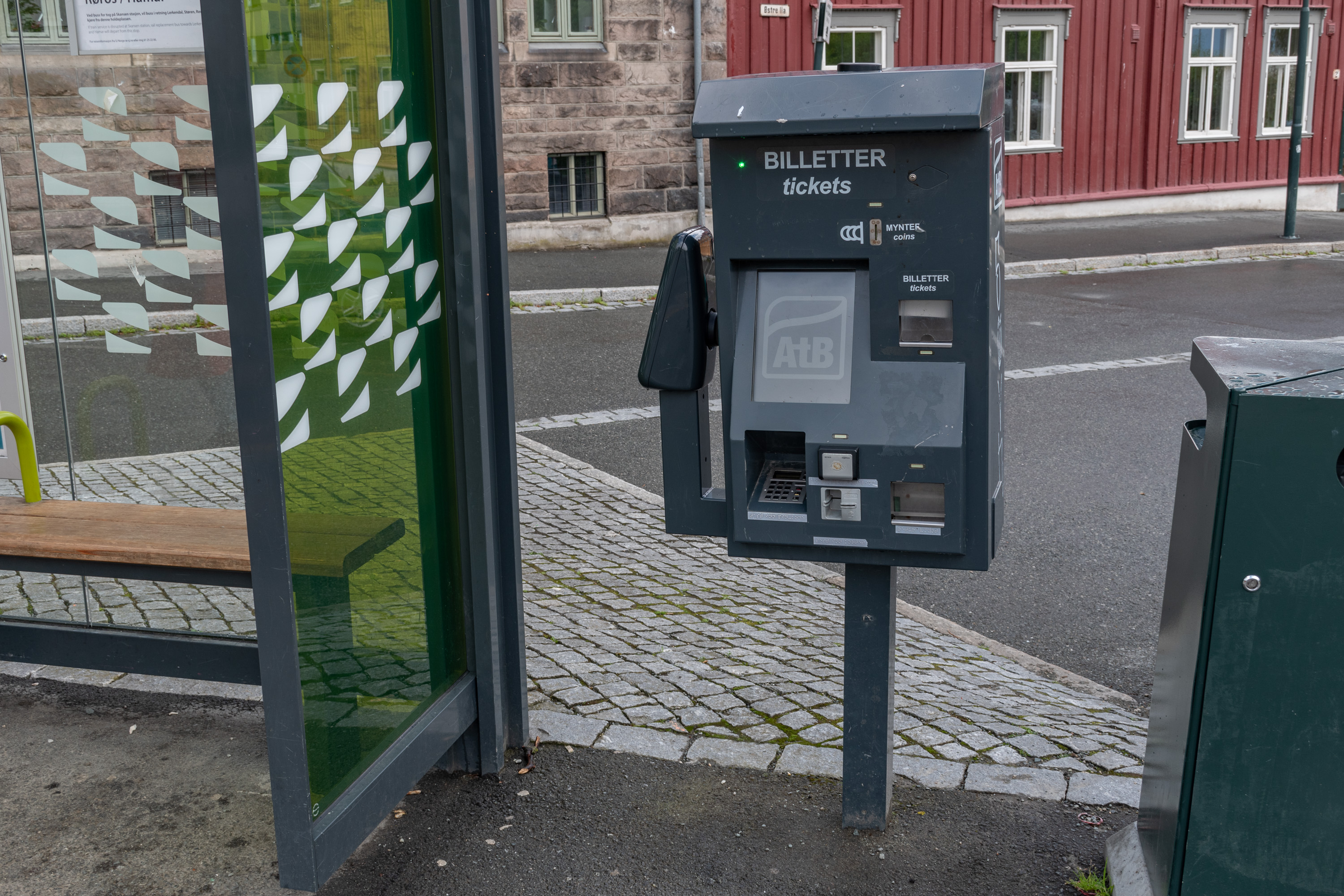 6. Что касается билетов, то трамвай интегрирован с остальным транспортом (автобусами и теплоходами через фьорд), разовый билет в зоне A, включающей весь город с трамваем и 45-90 мин пересадок, стоит 43 кроны (~3.69 евро сейчас). Туристу удобнее всего купить через приложение (AtB). Можно купить у водителя за наличные, но сильно дороже (да я и не помню, когда в последний раз наличные кроны в руках держал); на нескольких трамвайных и автобусных остановках есть автоматы, но я только один видел. Вход не только в трамвай, но и в городские автобусы (которые я тоже поснимал, горчично-зеленые) через все двери, и показывать водителю или валидировать купленный через приложение билет не надо, что очень удобно, конечно. Но водителю трамвая надо тоже рукой махать, чтоб остановился, как автобусу :)