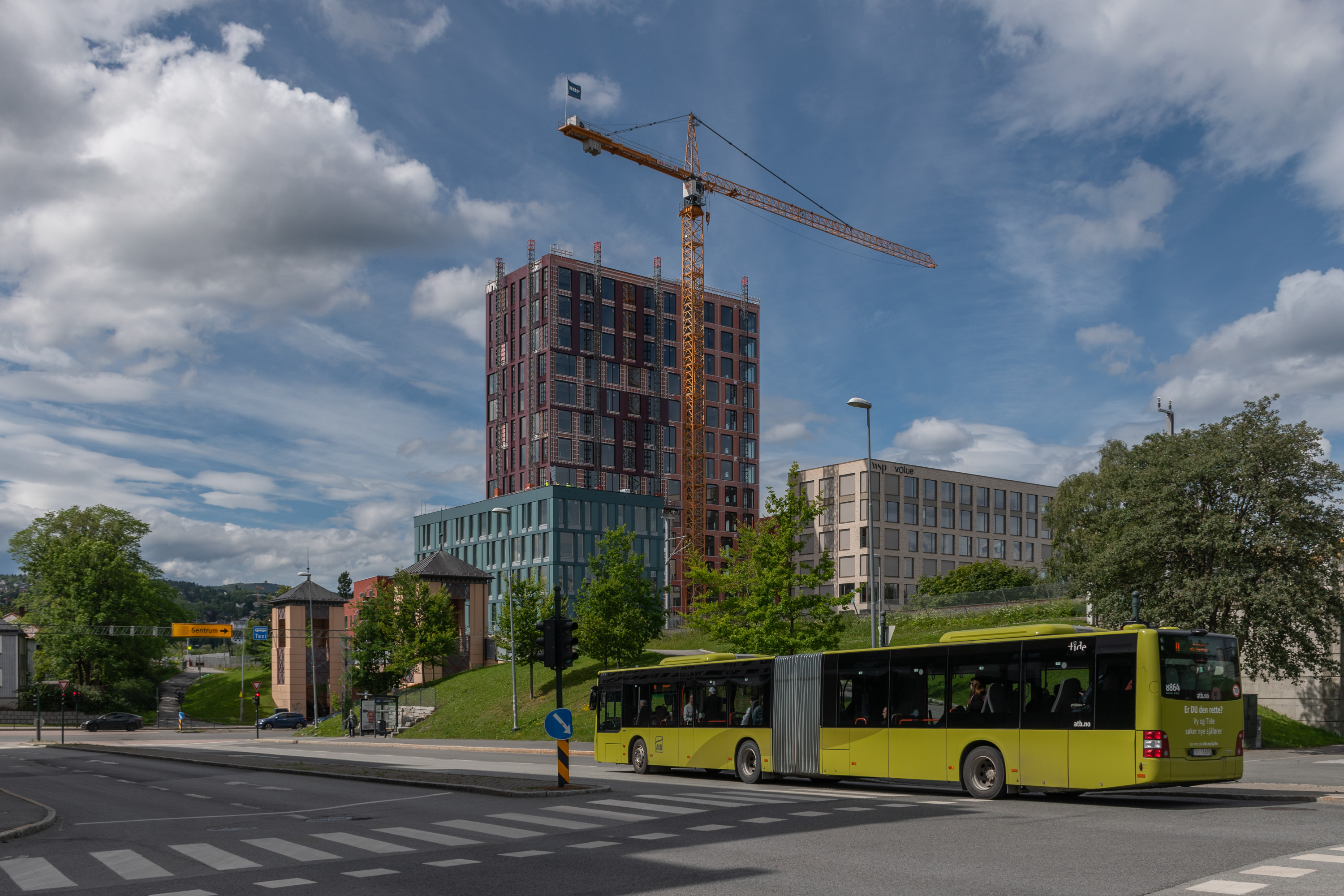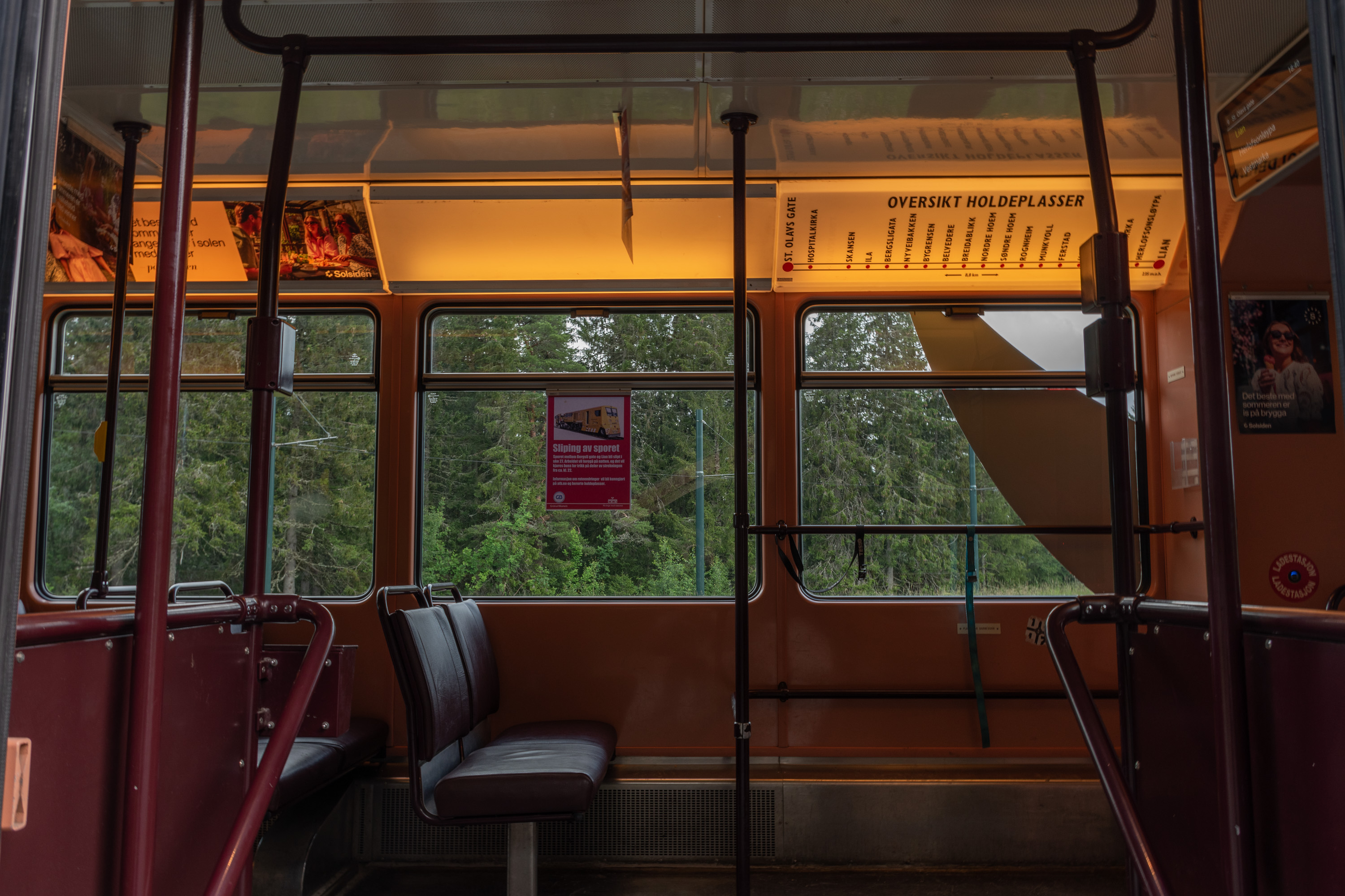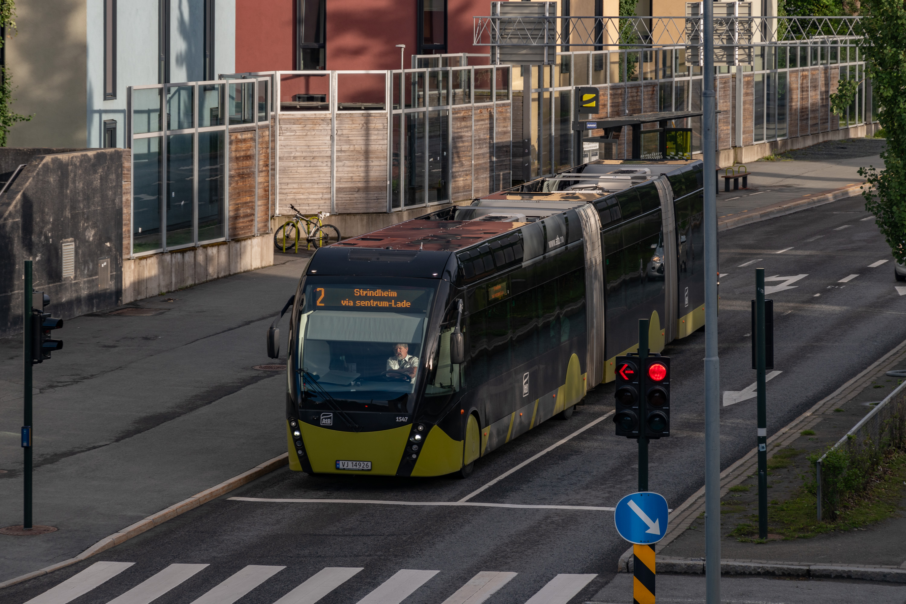 6. Что касается билетов, то трамвай интегрирован с остальным транспортом (автобусами и теплоходами через фьорд), разовый билет в зоне A, включающей весь город с трамваем и 45-90 мин пересадок, стоит 43 кроны (~3.69 евро сейчас). Туристу удобнее всего купить через приложение (AtB). Можно купить у водителя за наличные, но сильно дороже (да я и не помню, когда в последний раз наличные кроны в руках держал); на нескольких трамвайных и автобусных остановках есть автоматы, но я только один видел. Вход не только в трамвай, но и в городские автобусы (которые я тоже поснимал, горчично-зеленые) через все двери, и показывать водителю или валидировать купленный через приложение билет не надо, что очень удобно, конечно. Но водителю трамвая надо тоже рукой махать, чтоб остановился, как автобусу :)