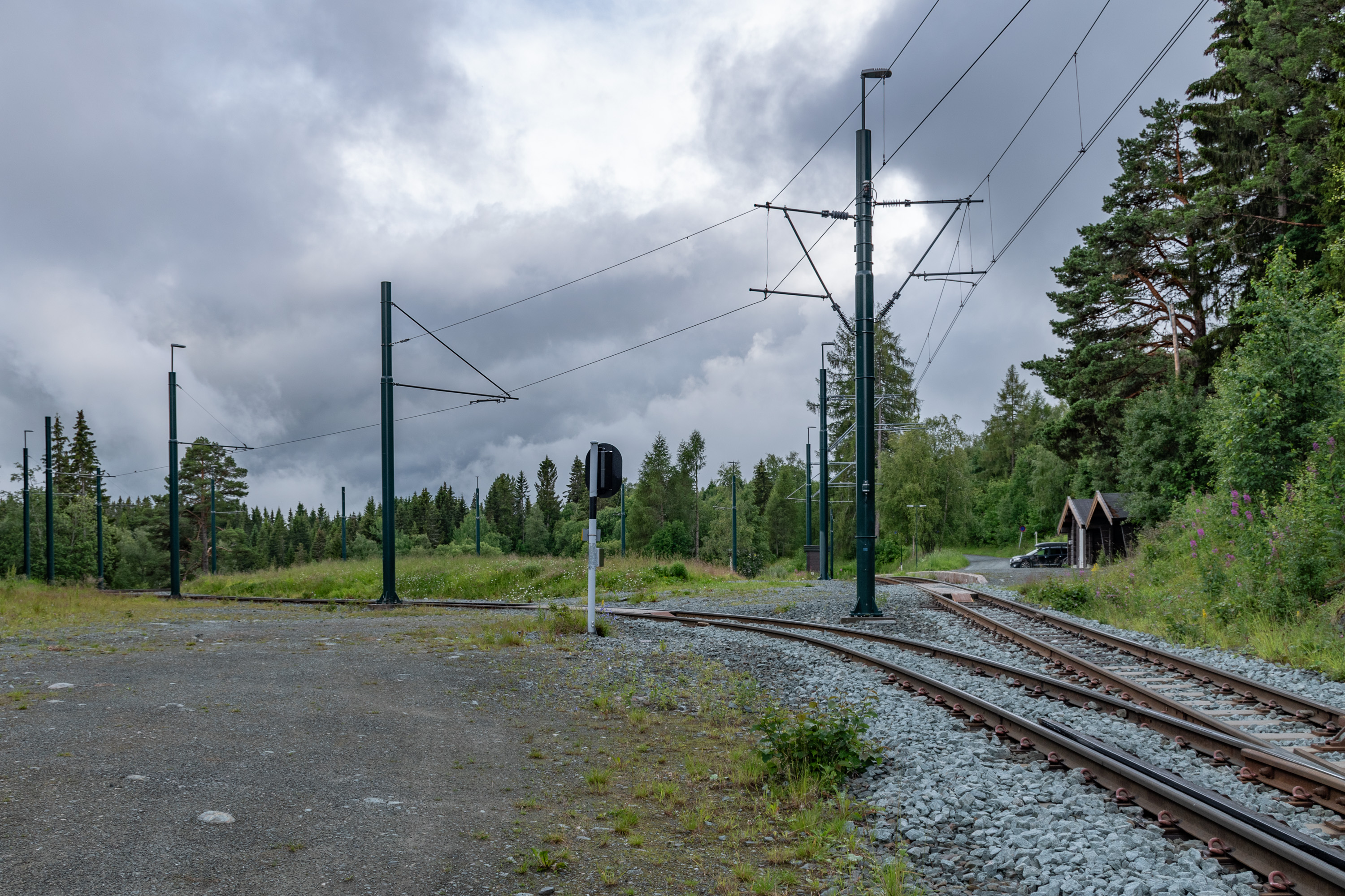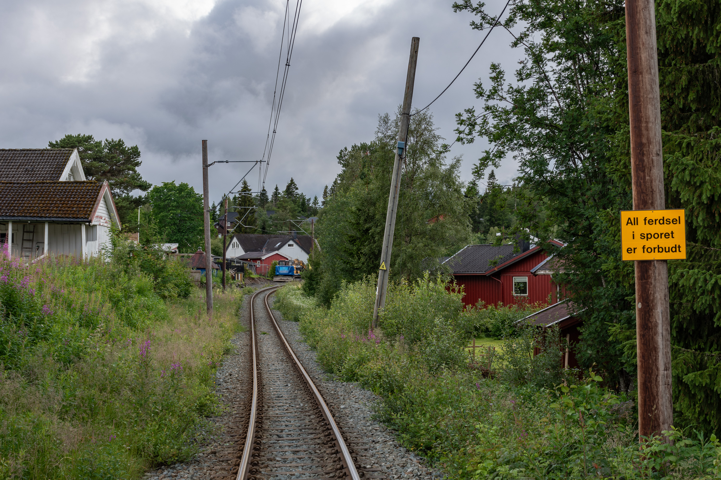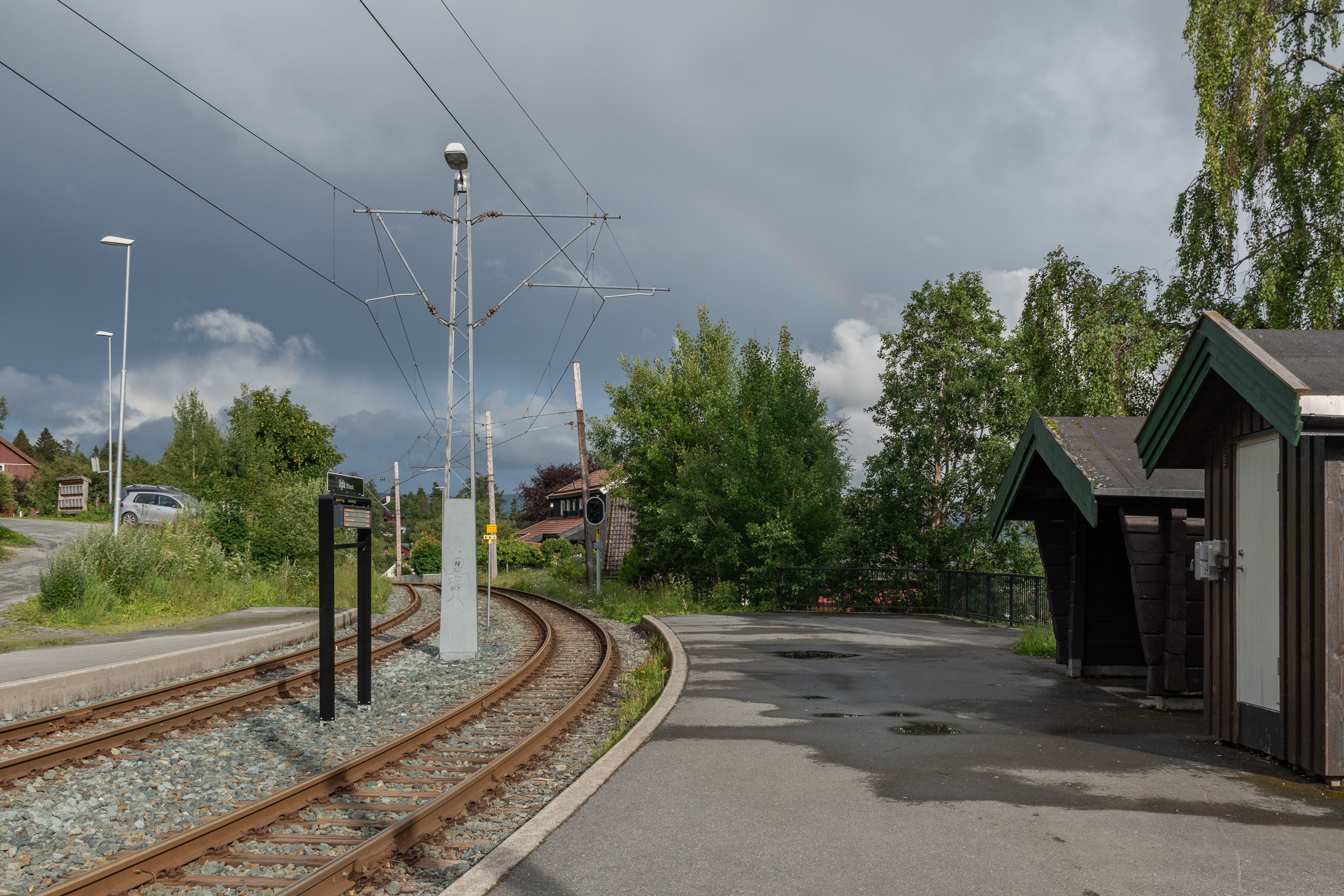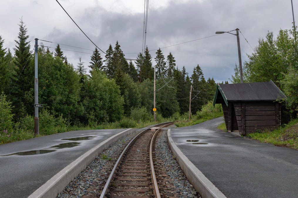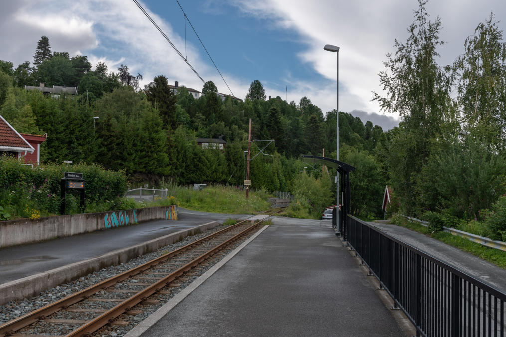 15. За Мункволлем начинаются совсем пригороды, перегоны местами идут практически через лес, а большинство остановочных павильонов — деревянные навесы, напоминающие финские лааву для привалов в лесу. На остановках всех подписана высота над уровнем моря. Вдоль линии установлены светофоры железнодорожного облика, но по крайней мере когда я снимал, все они были выключены.