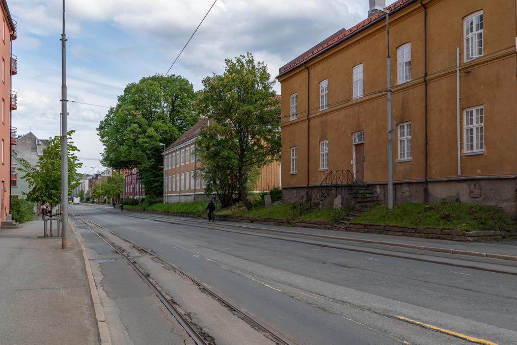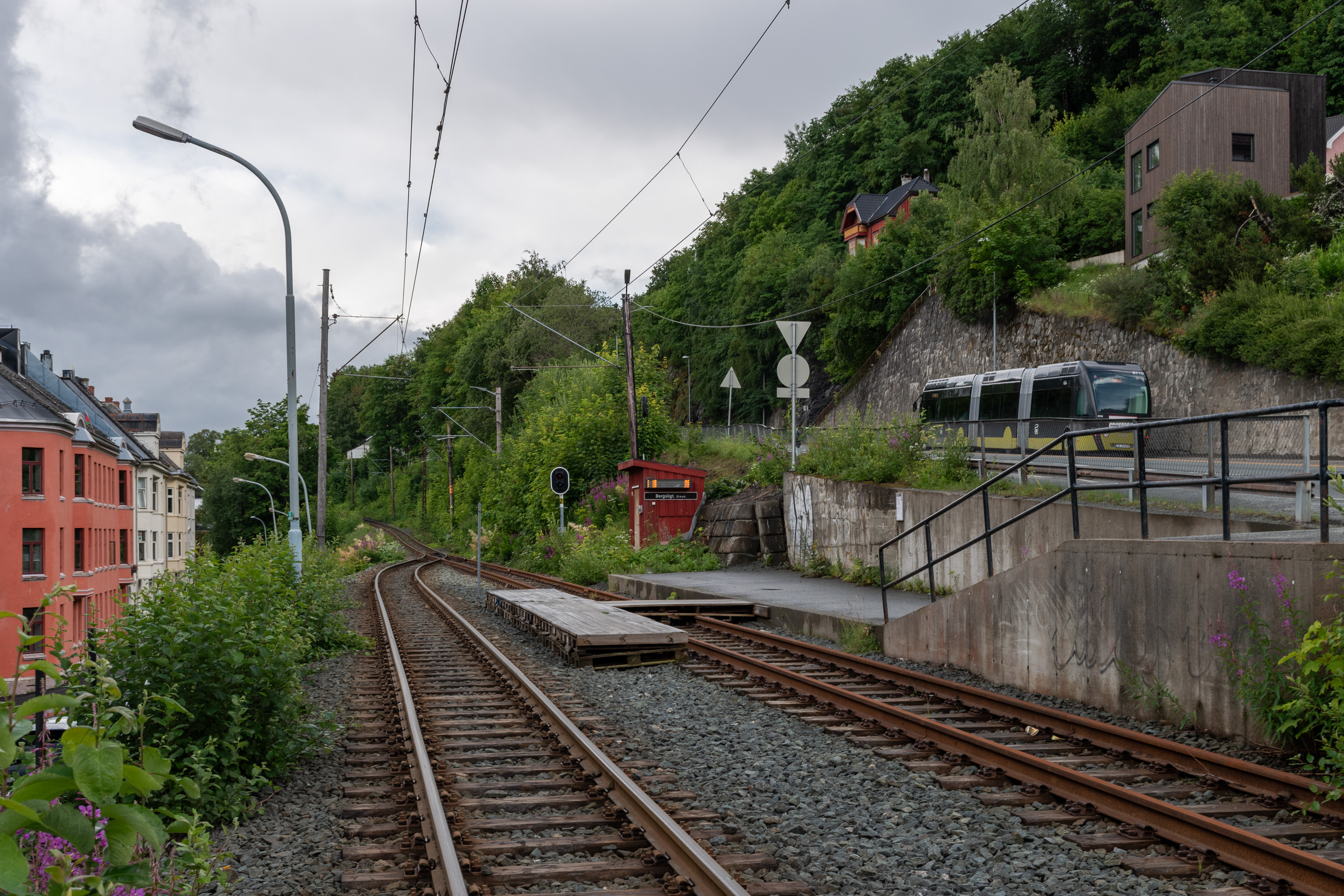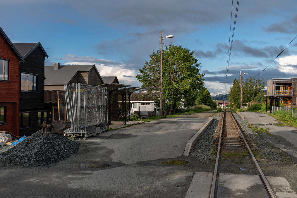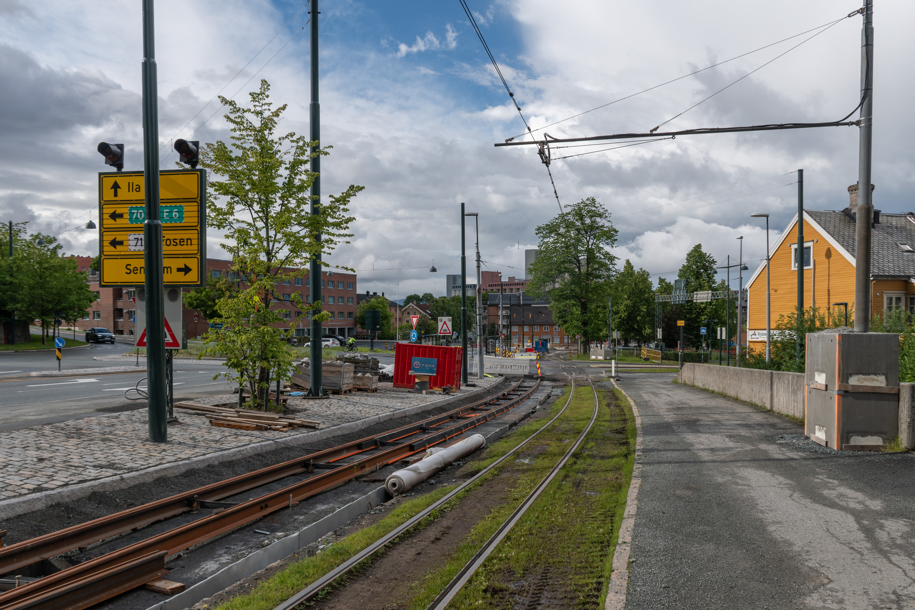 11. С линии на этом участке открываются неплохие виды на город (я снимал не из самого трамвая, а с близлежащих улиц, гуляя вдоль линии, но все же); разбирать, что отсюда видно, смысла особого нет, слишком много всего. Вдалеке виден и Тронхейм-фьорд. Далее линия заворачивает на запад в холмы.