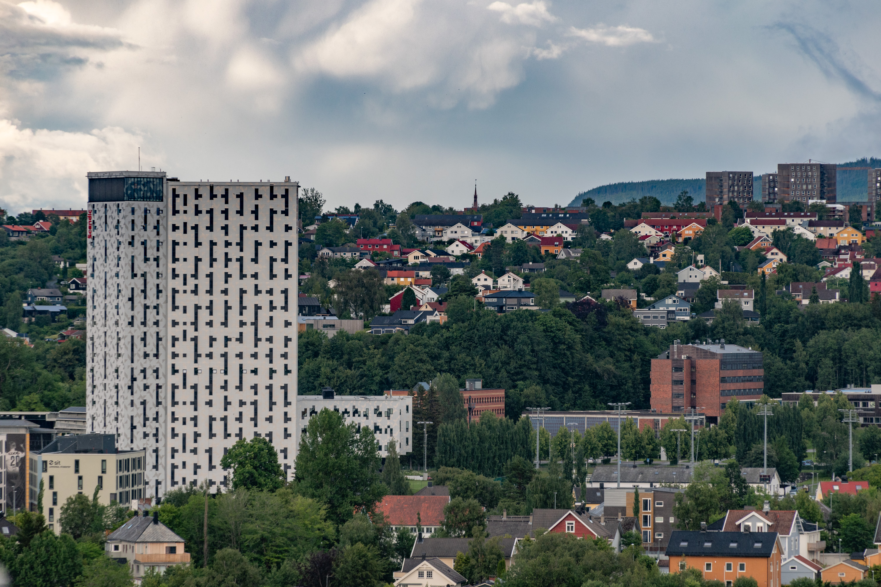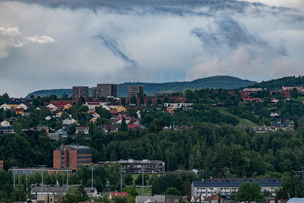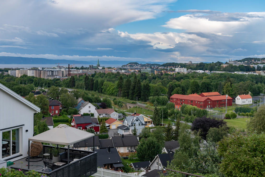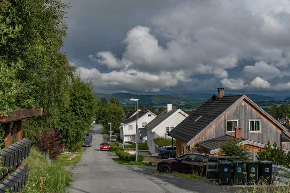 11. С линии на этом участке открываются неплохие виды на город (я снимал не из самого трамвая, а с близлежащих улиц, гуляя вдоль линии, но все же); разбирать, что отсюда видно, смысла особого нет, слишком много всего. Вдалеке виден и Тронхейм-фьорд. Далее линия заворачивает на запад в холмы.