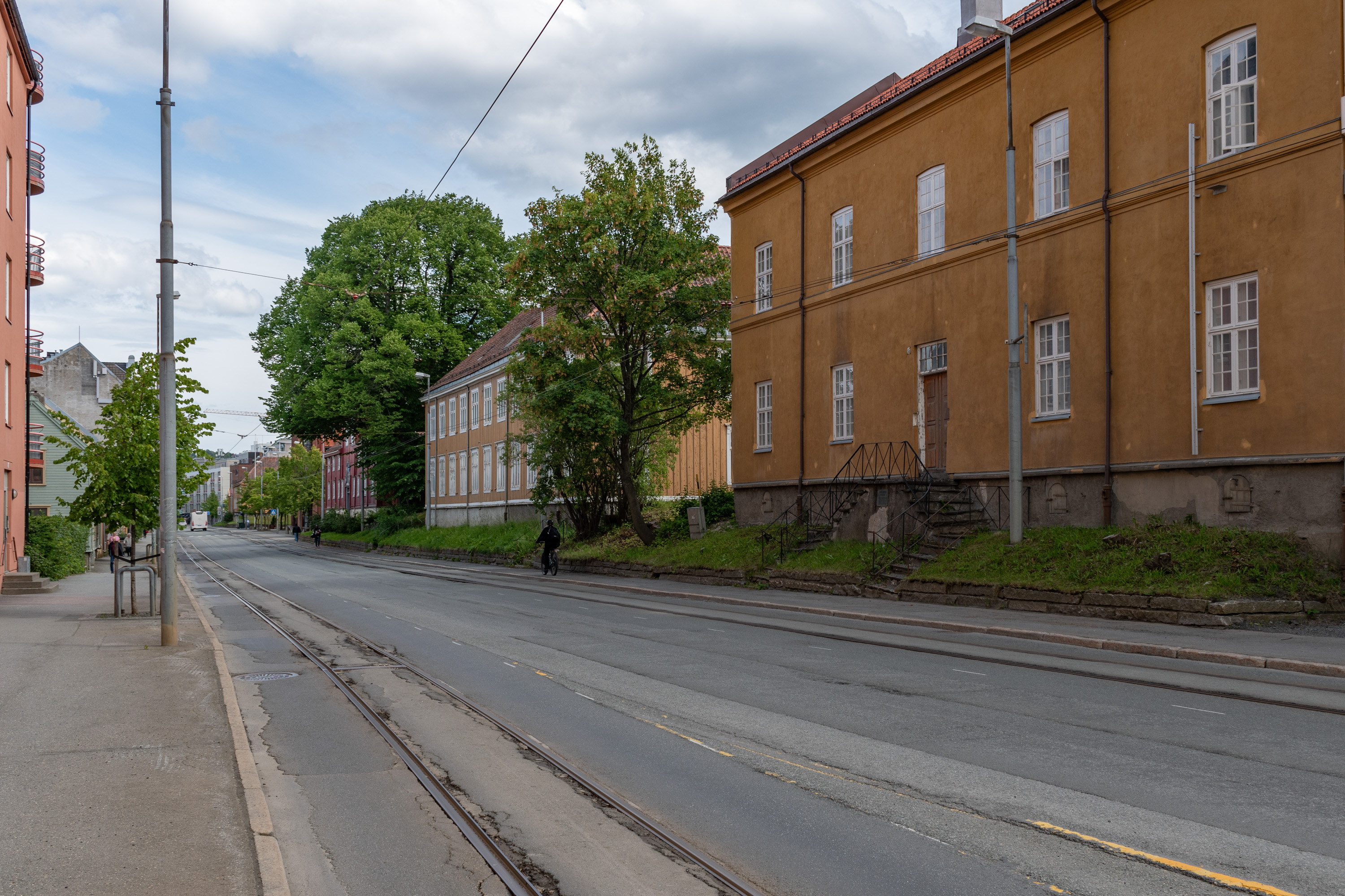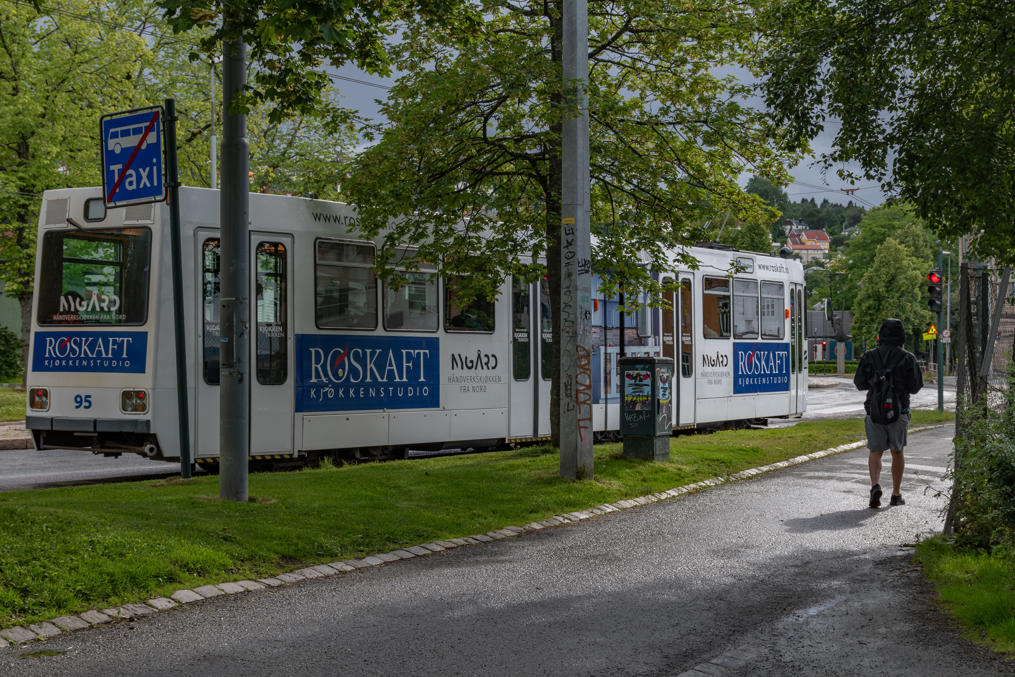 5. Линия длиной около 9 км выглядит весьма архаичной, конечно. 40-летние трамваи высокопольные и односторонние — на конечных разворотные петли. Номер маршрута сейчас 9, хотя много лет был 1. Ходят в одной рекламе, магазина кухонь Røskaft, причем на моих старых фото от 2017 уже была эта реклама.