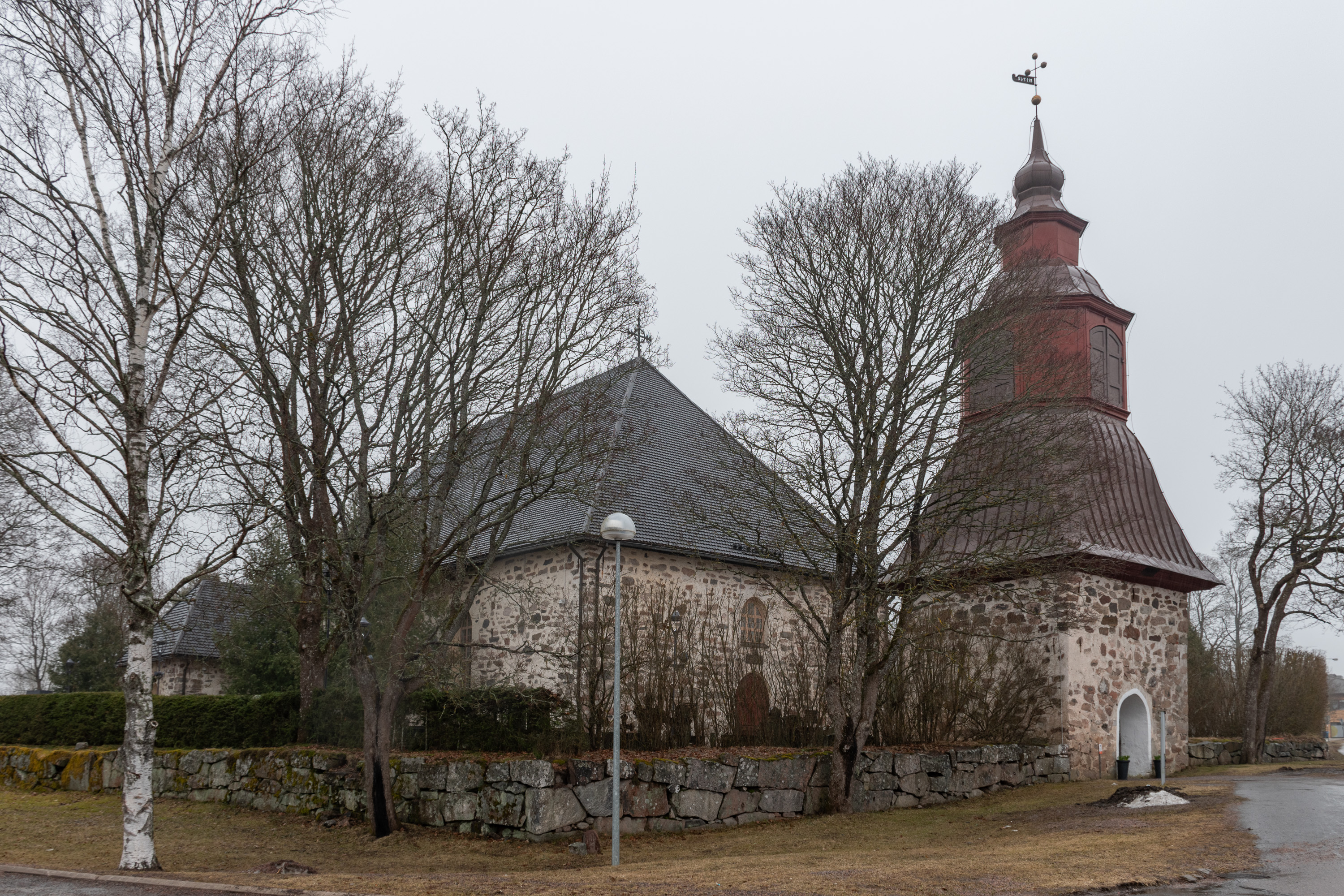Церковь Пииккиё (Piikkiö), в поселке восточнее Турку и Каарины. Хоть и из грубого "серого камня", но не средневековая, а 1755 года. Камень, собственно, на нее как раз с руин замка Куусисто и тащили. Колокольня прикольно стоит на крутой скале. До этого церкви тут были с 14 в.