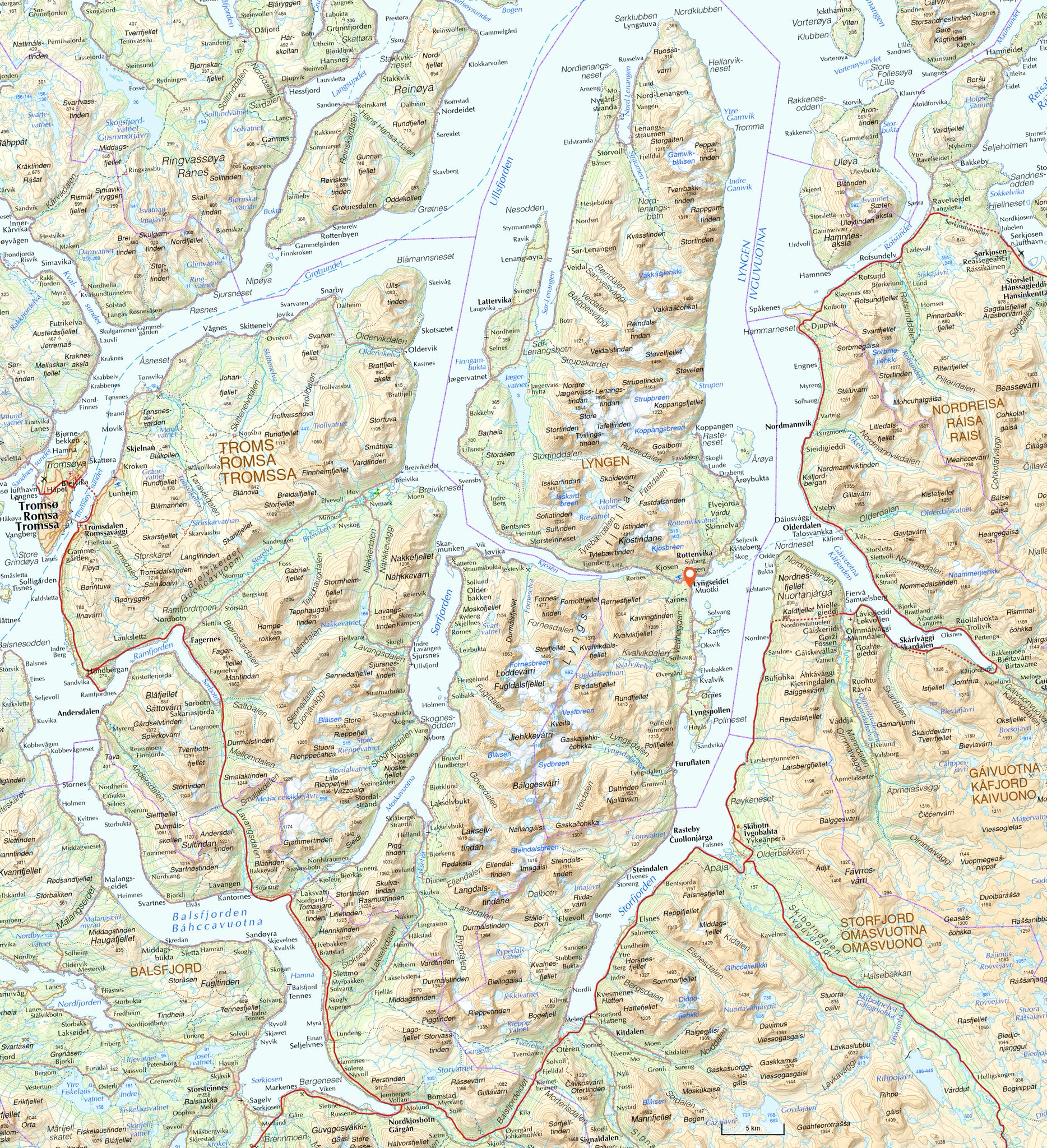 Если кто-то едет на восток из Тромсё, то путь через Люнген с двумя паромами через обрамляющие его фьорды будет значительно короче, чем по суше.