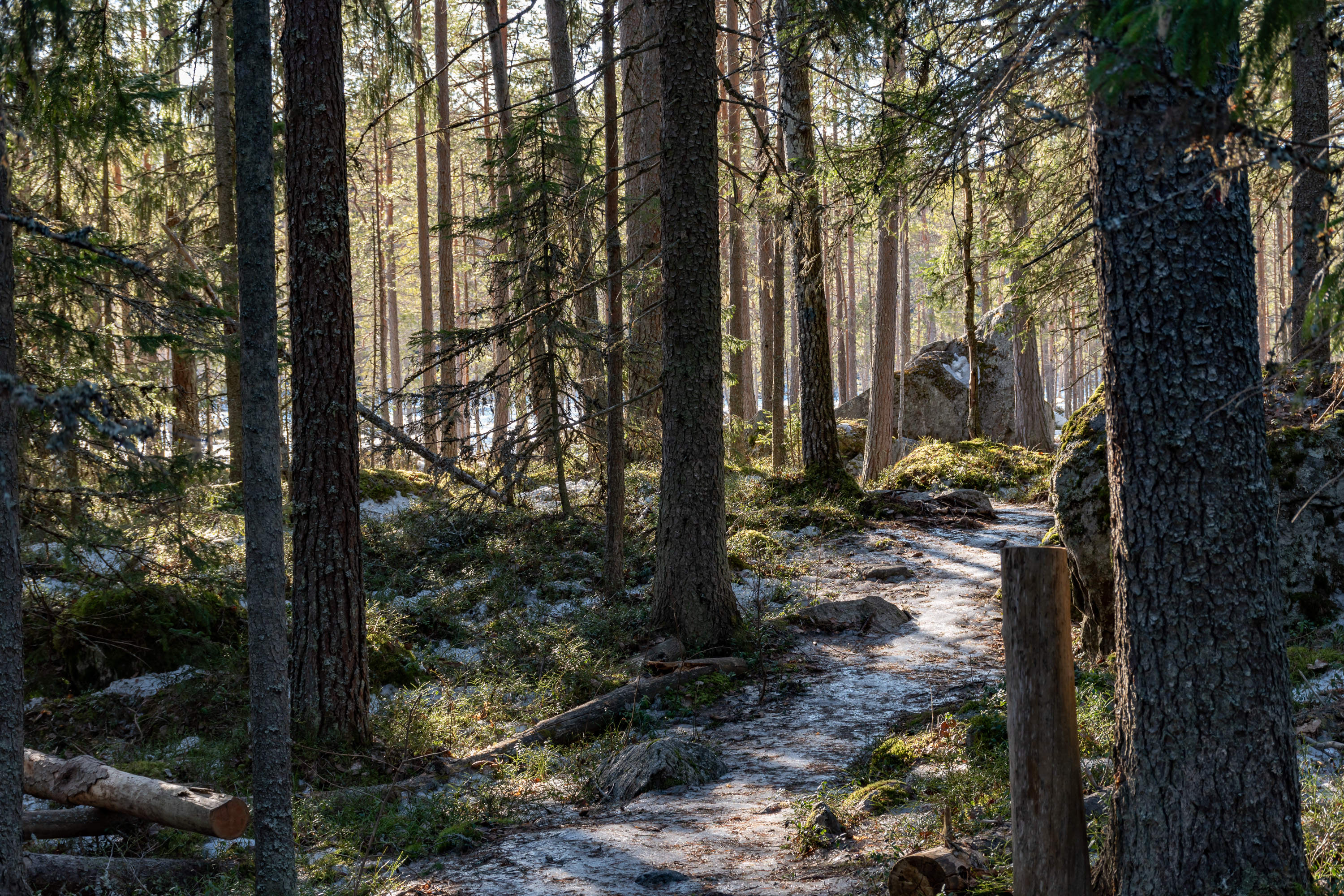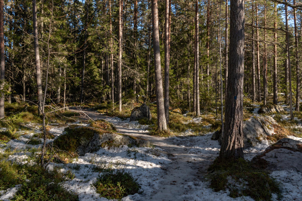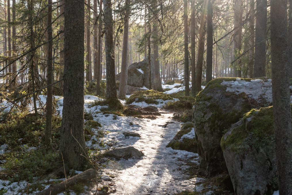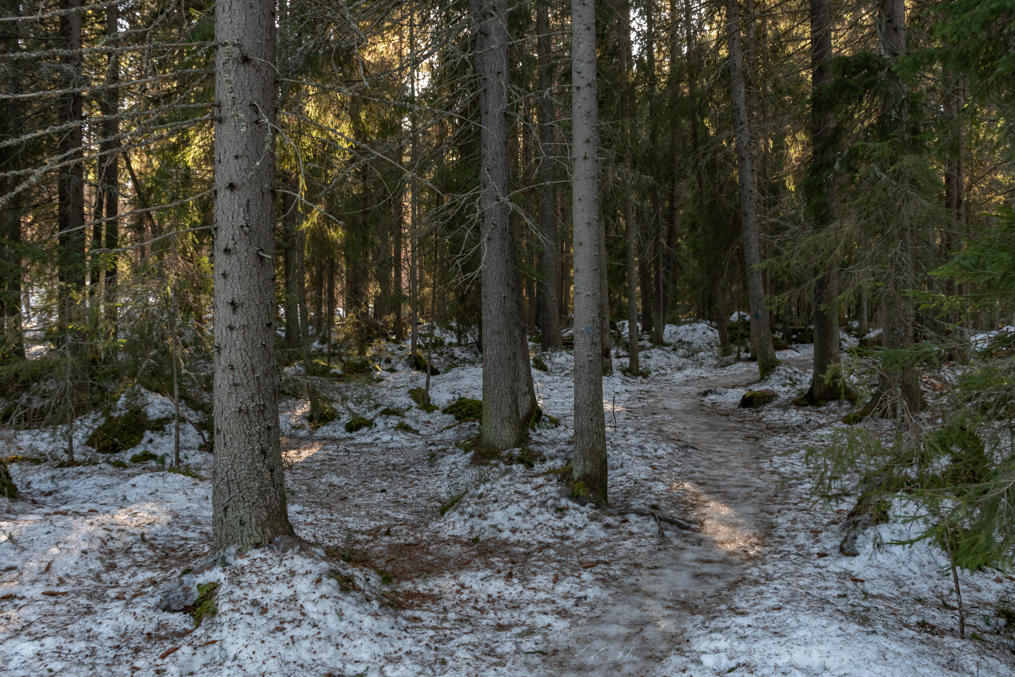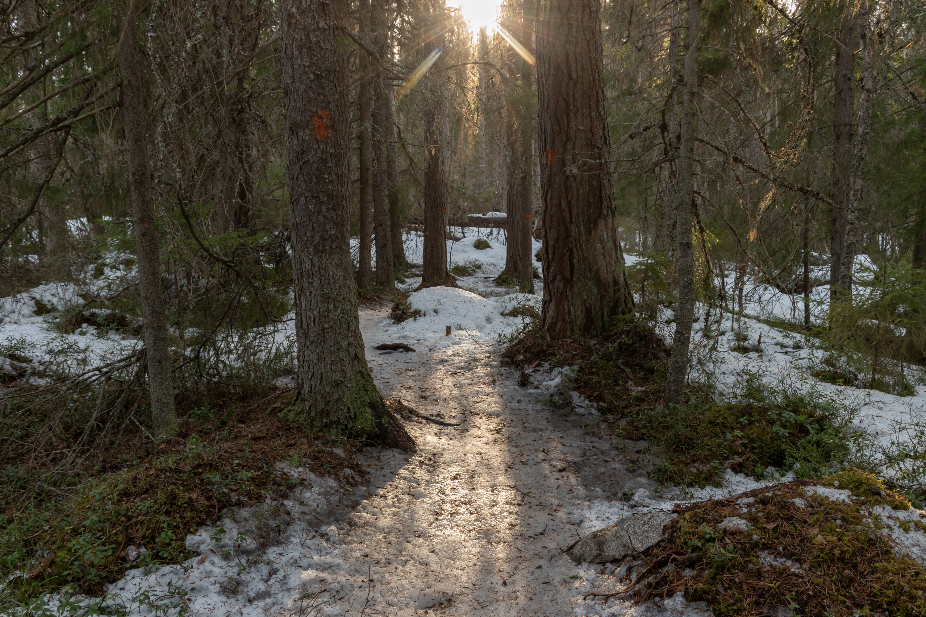 Впрочем, в Эйен я езжу каждую весну, весной там красиво. Вот прошлогодние фото — апрель 2023. Снега и тогда было все еще много, а без шипов ботинках на тропинки лучше не соваться, но все равно в лесу весна радует куда больше, чем в городе. Эйен — это участок старого леса по дороге из Ваасы на входящее в его черту село Сундом (Sundom).