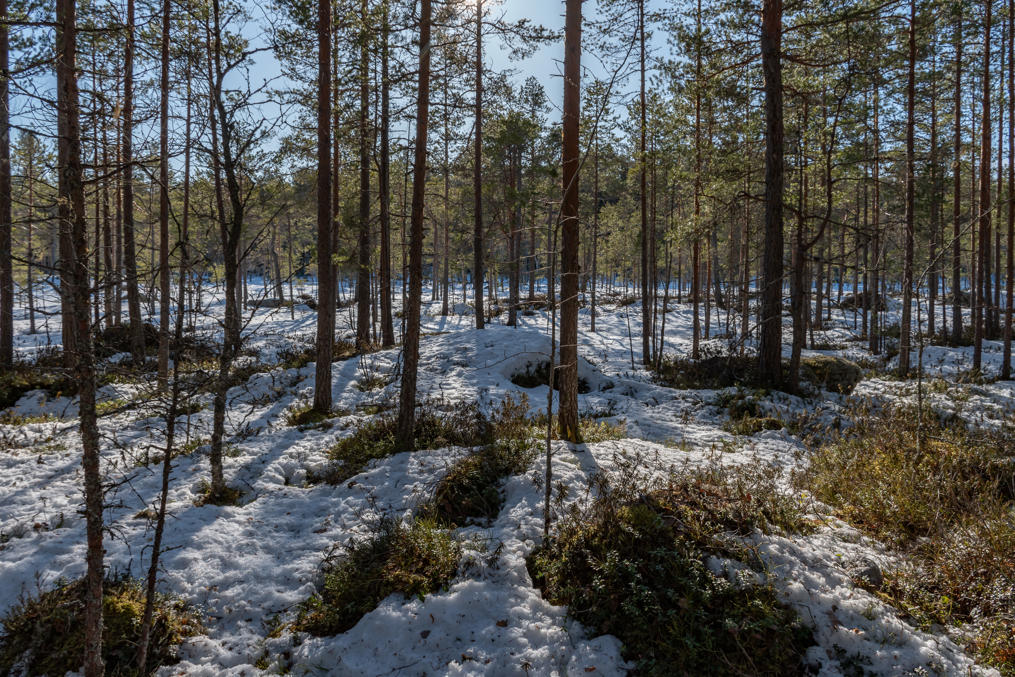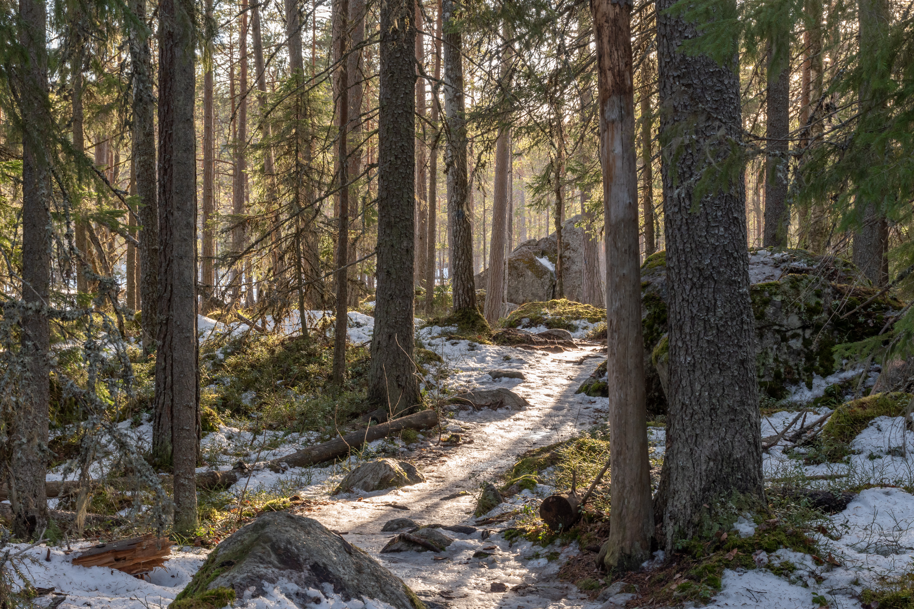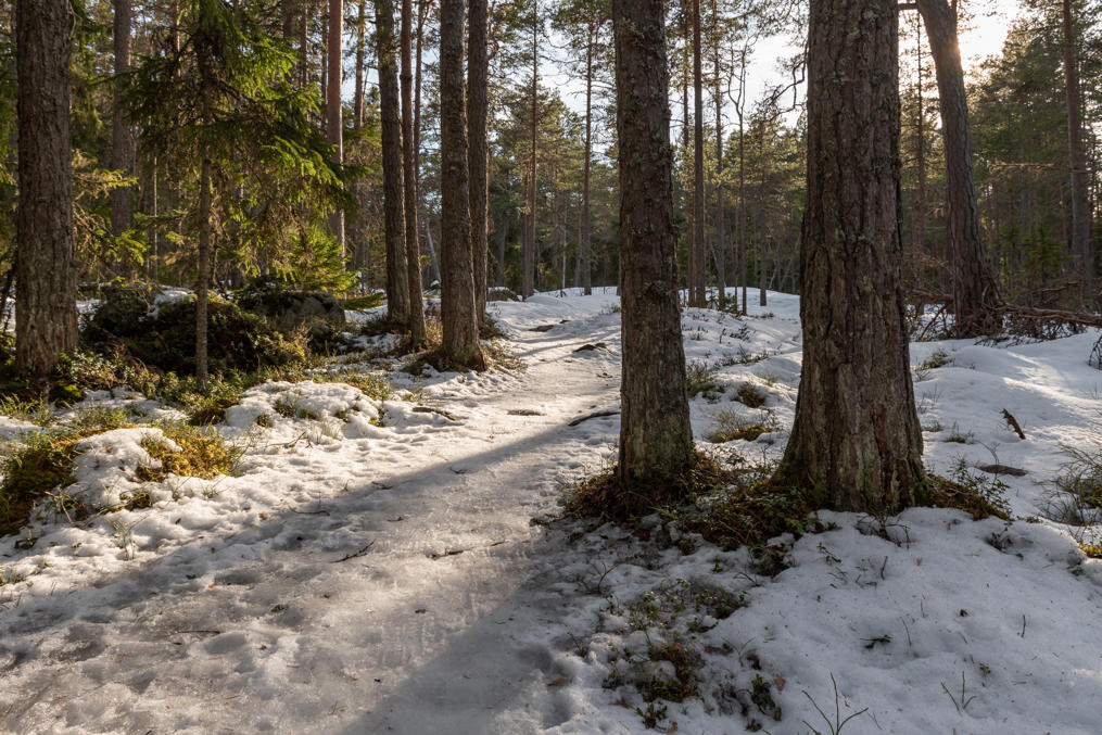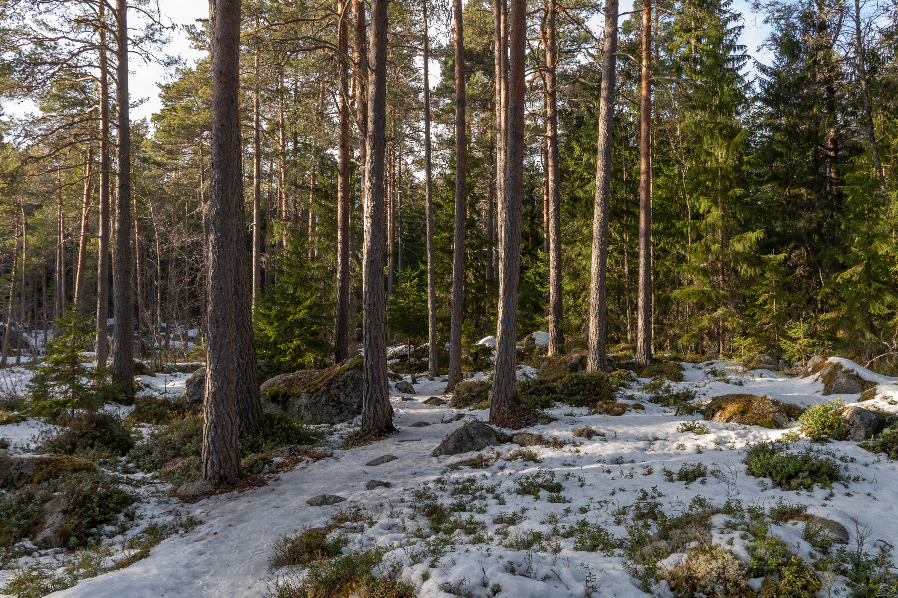 Впрочем, в Эйен я езжу каждую весну, весной там красиво. Вот прошлогодние фото — апрель 2023. Снега и тогда было все еще много, а без шипов ботинках на тропинки лучше не соваться, но все равно в лесу весна радует куда больше, чем в городе. Эйен — это участок старого леса по дороге из Ваасы на входящее в его черту село Сундом (Sundom).