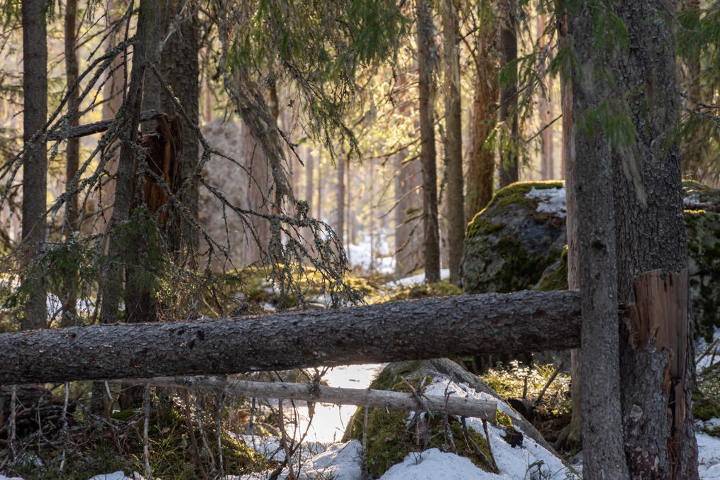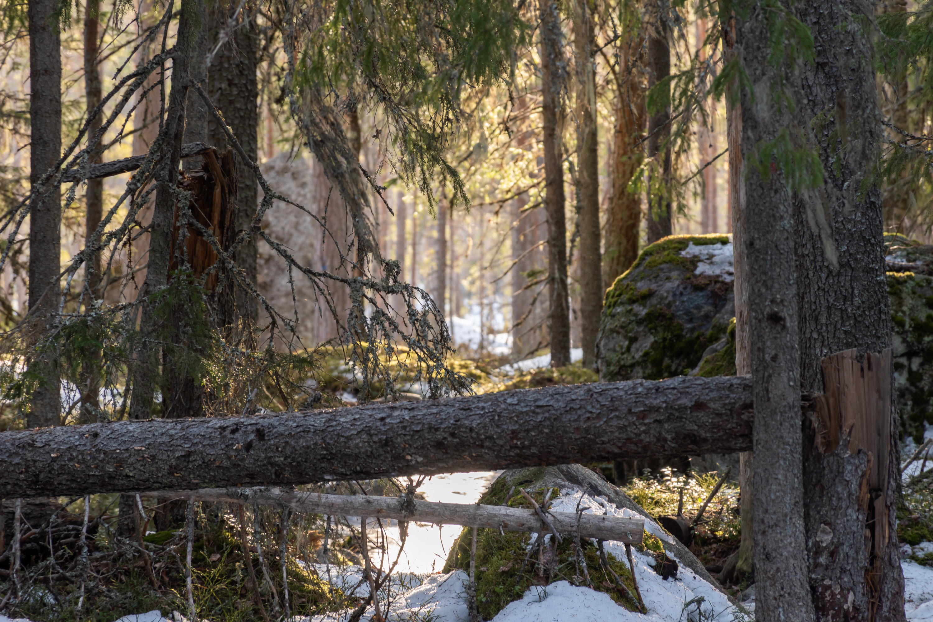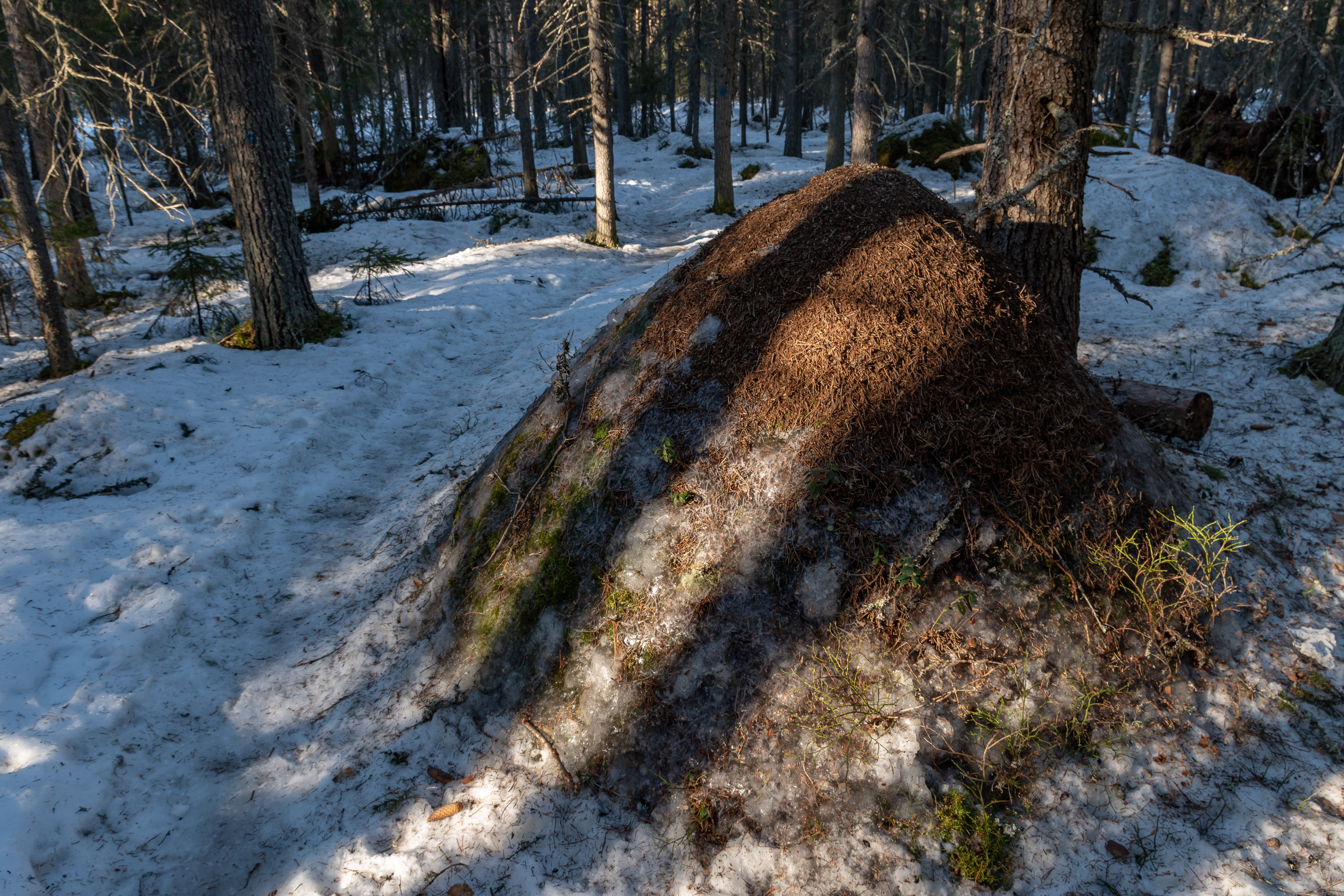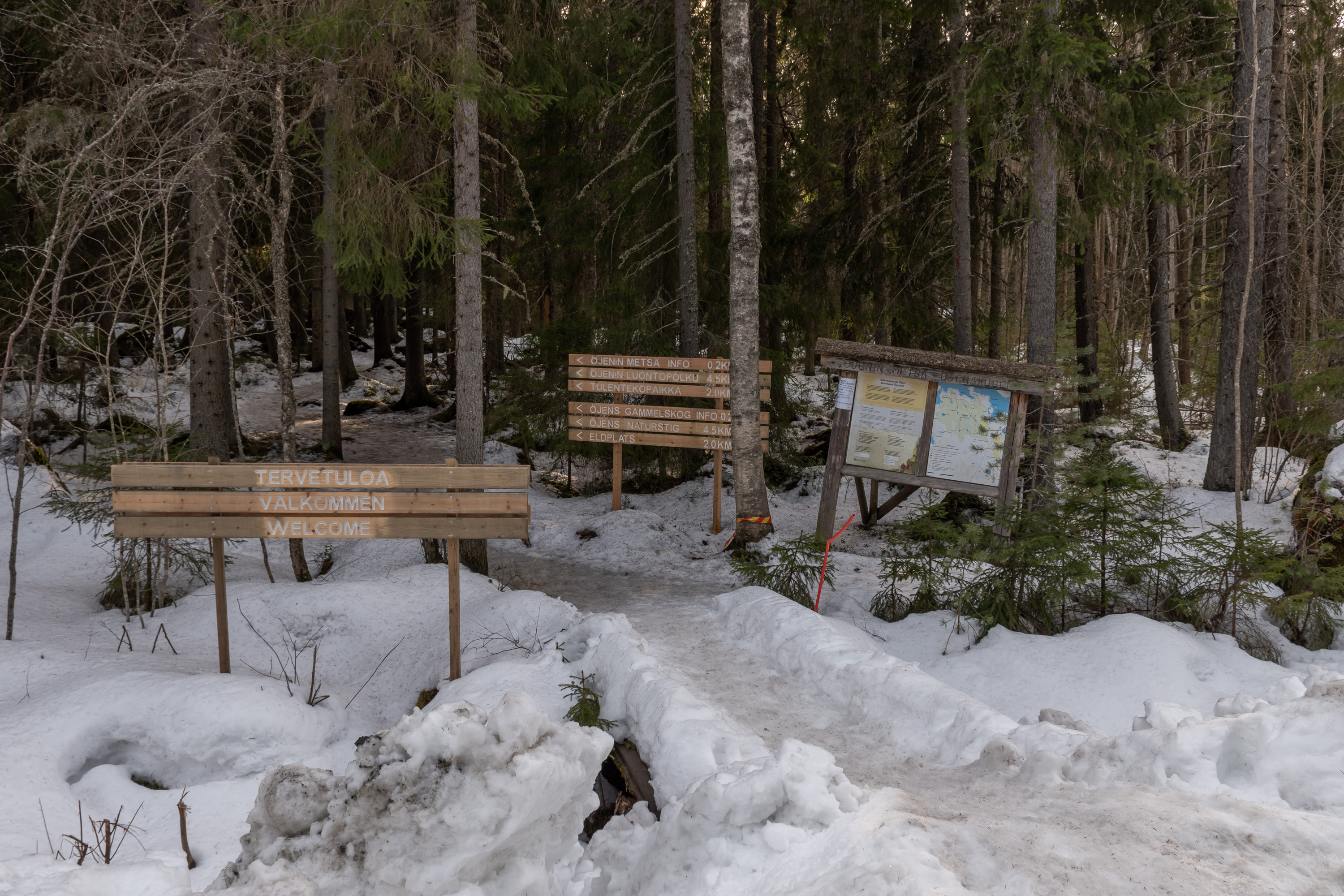 Впрочем, в Эйен я езжу каждую весну, весной там красиво. Вот прошлогодние фото — апрель 2023. Снега и тогда было все еще много, а без шипов ботинках на тропинки лучше не соваться, но все равно в лесу весна радует куда больше, чем в городе. Эйен — это участок старого леса по дороге из Ваасы на входящее в его черту село Сундом (Sundom).