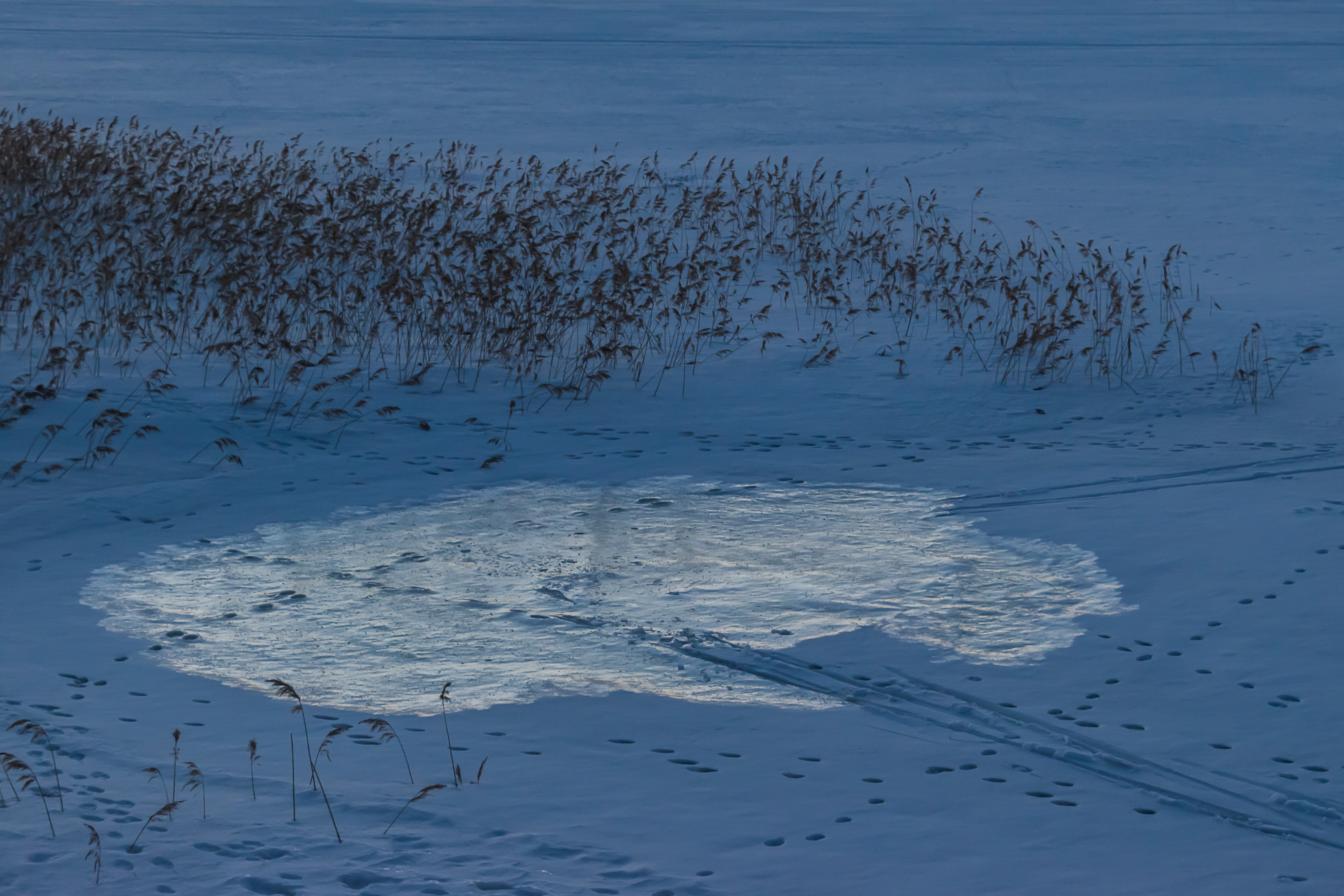 Лед прочерчивают как следы снегоходов, так и целые ледовые дороги. На фото 30 марта, но лед в это время еще вполне безопасен, особенно в холодные зимы, каковой была зима 2017-2018