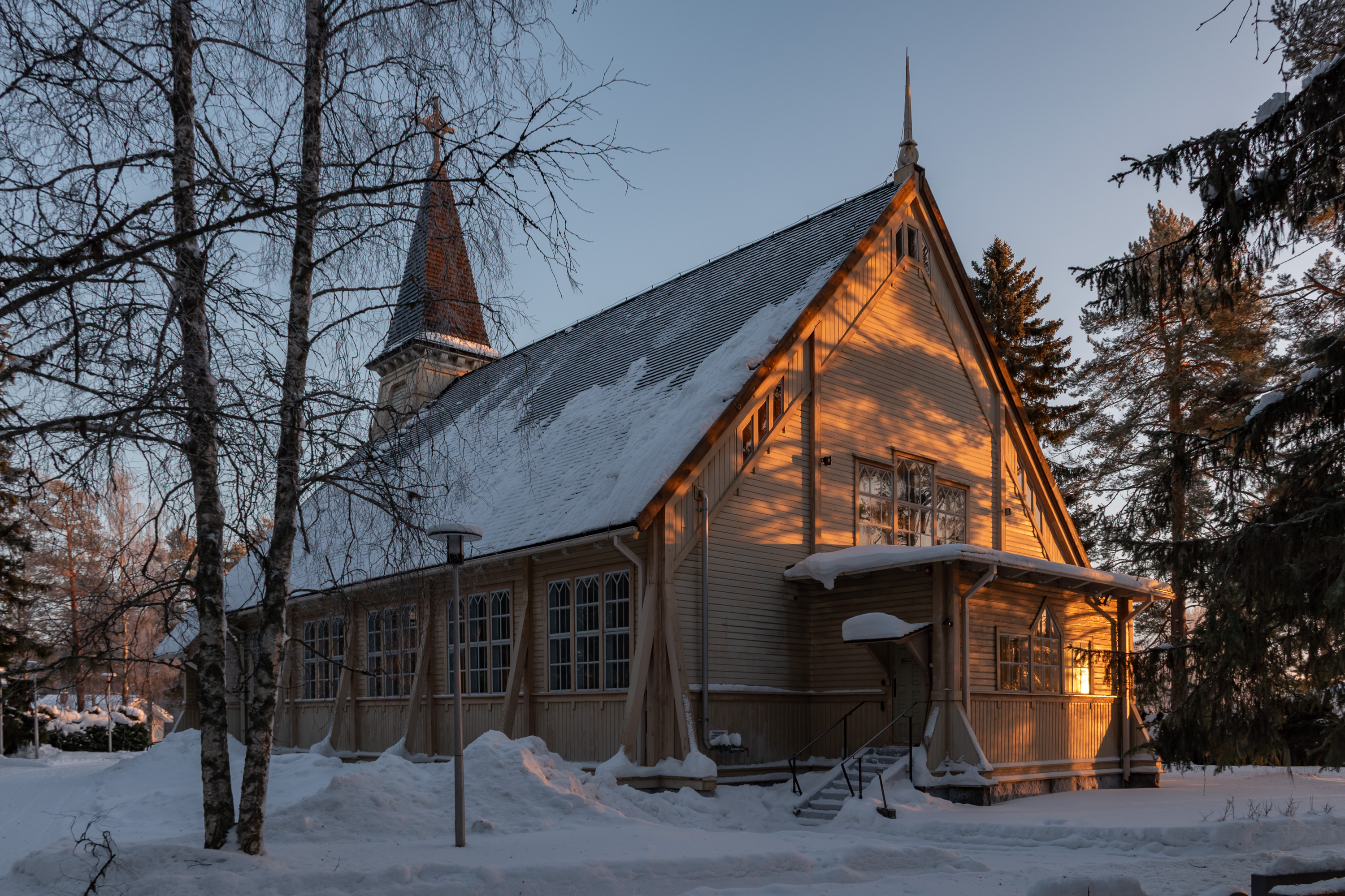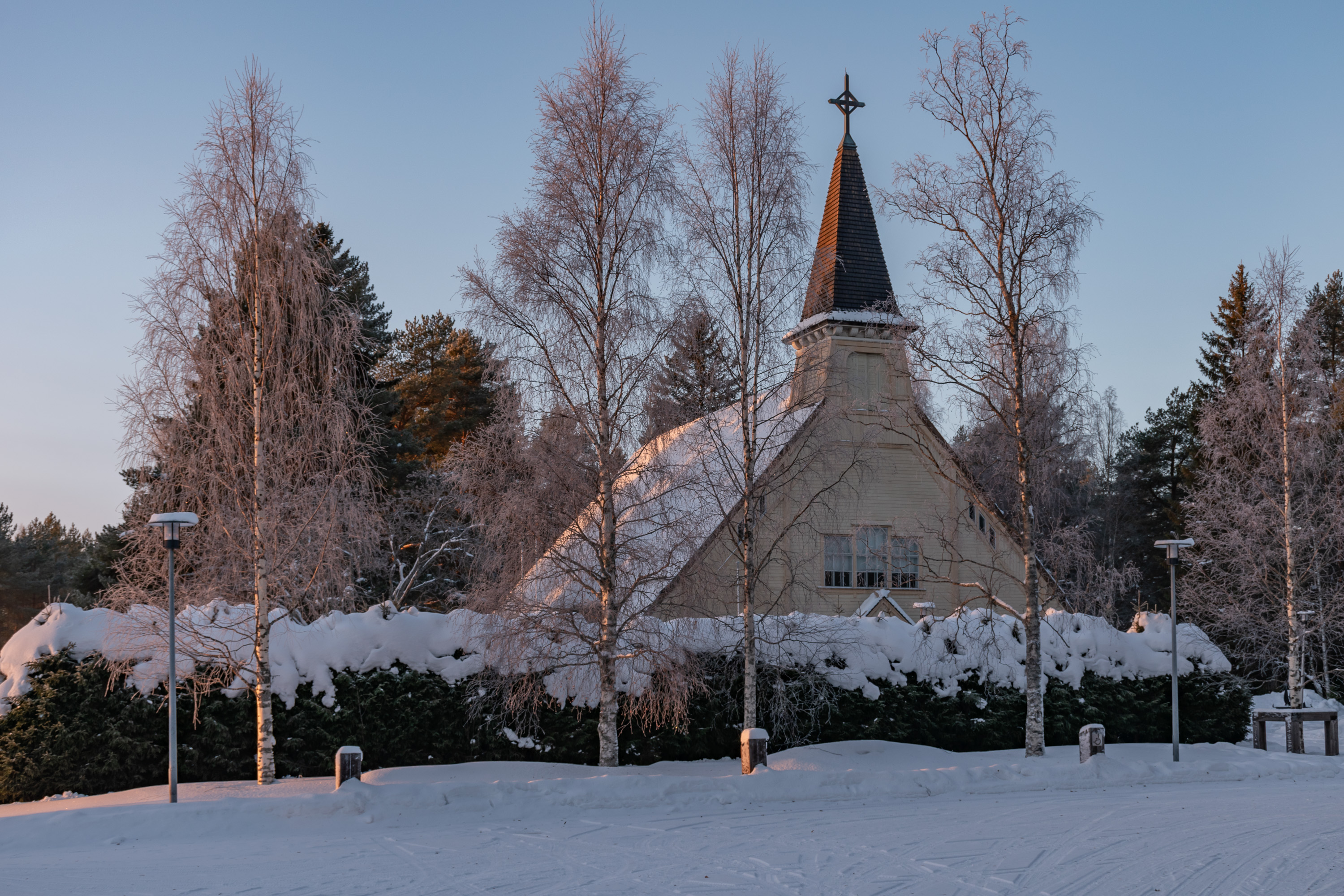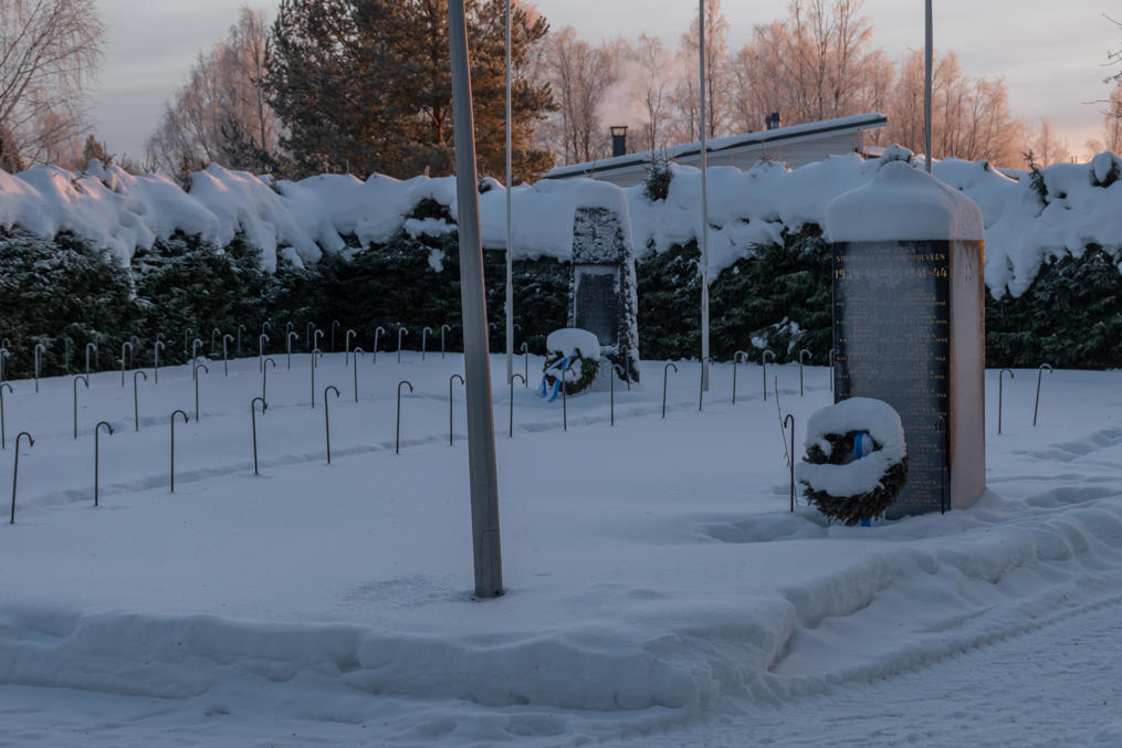И чуть в стороне деревянная церковь 1909 года. Традиционное воинское кладбище перед церковью примечательно тем, что доля погибшего во Вторую мировую войну населения Пюхянтя была выше всех муниципалитетов страны (98 человек, около 5%).