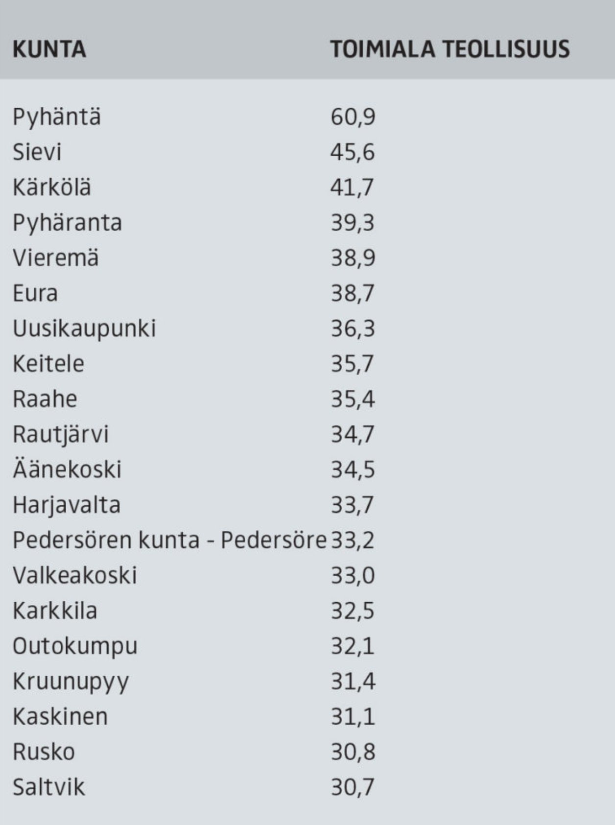 В каком смысле самый промышленный? В статистике есть простое разделение по рабочим местам: сельское хозяйство (и прочий первичный сектор), промышленность и сфера услуг. Услуги сейчас почти везде доминируют, конечно. А вот по доли промышленности лидируют не крупные города, а мелкие муниципалитеты, в которых по каким-то причинам разместились один или несколько относительно крупных заводов. И вот в Пюхянтя доля рабочих мест в промышленности была 60-63% (источник Kuntalehti, 2018).