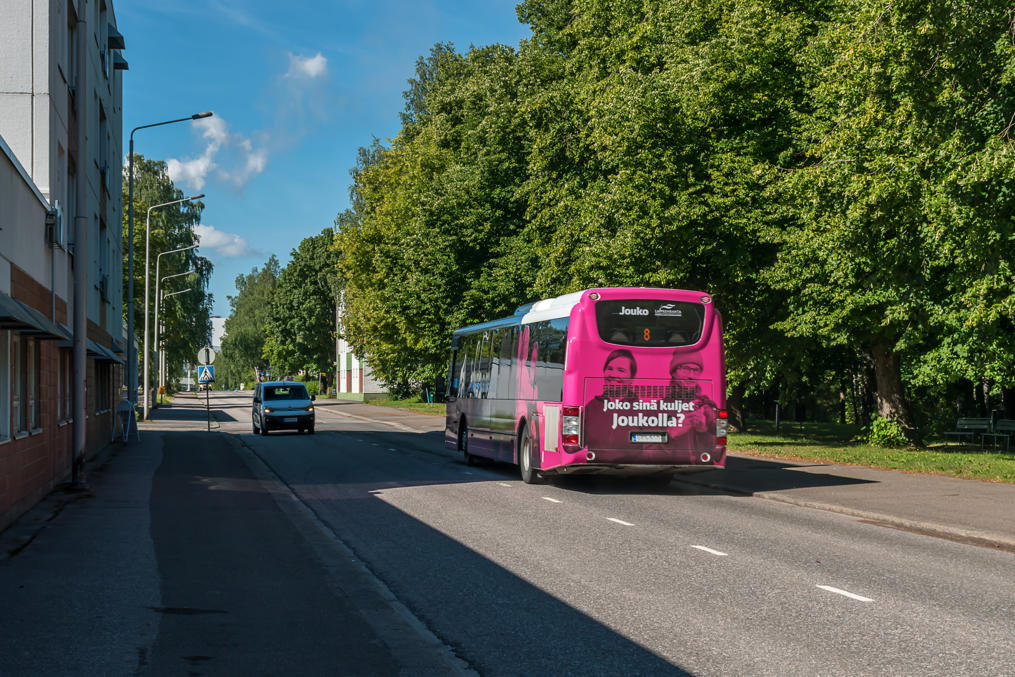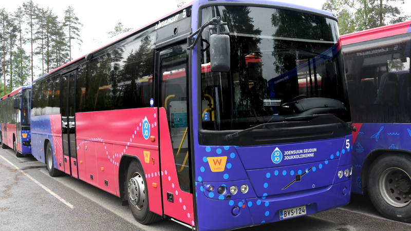 Йоэнсуу: JOJO (Joensuun joukkoliikenne, Общественный транспорт Йоэнсуу). Когда я был последний раз, почти 4 года назад, большинство, если не все, были без какой-либо собственной окраски. Сейчас вроде сине-розовые, последнее фото с их сайта.