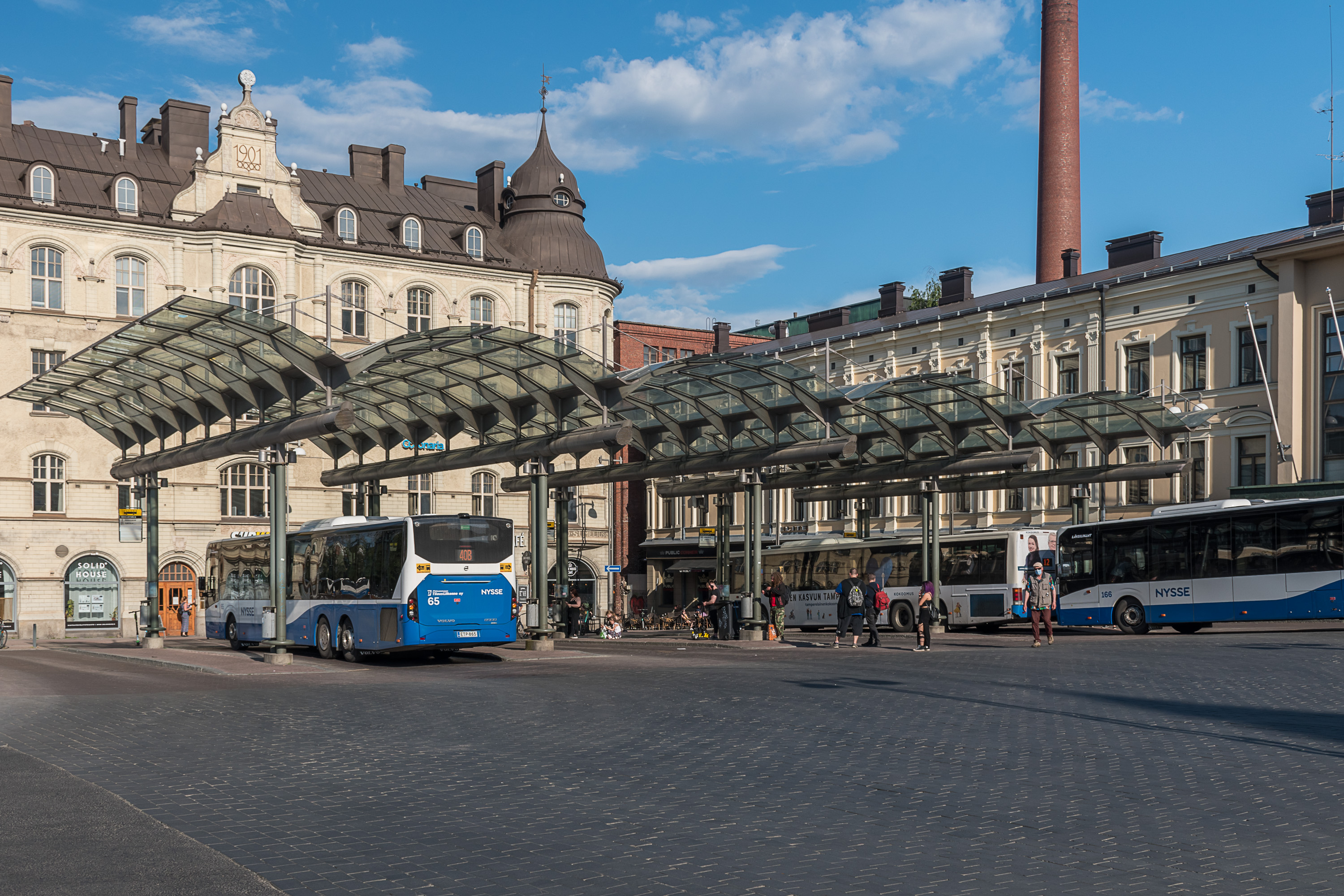 Тампере (пойдем сверху вниз по размеру города): Nysse, от фразы Nysse tule! (Nyt se tulee!, "Вот он едет!", на местном говоре). Тоже сине-белые автобусы. В систему также входят трамваи и частично электрички.