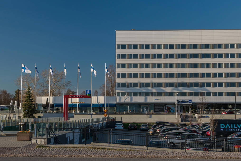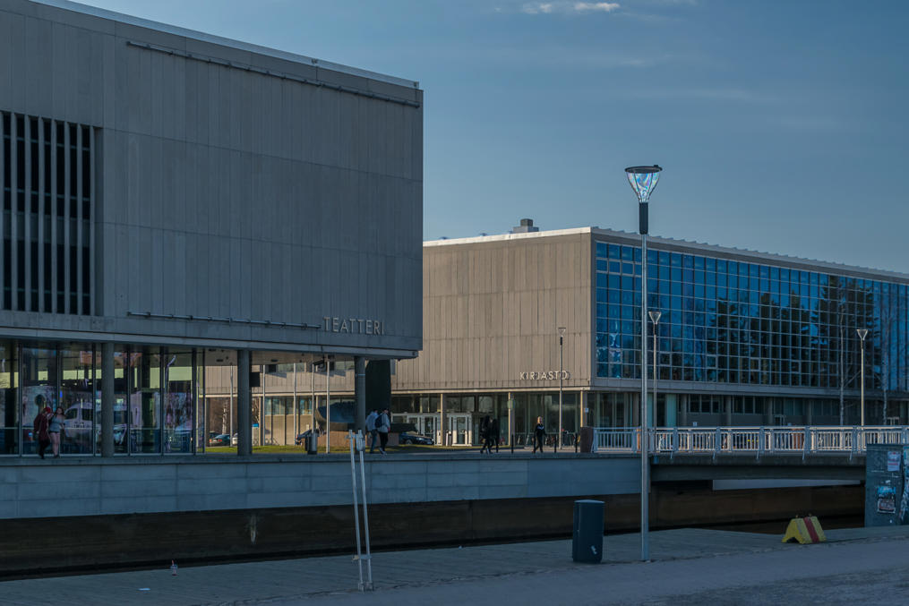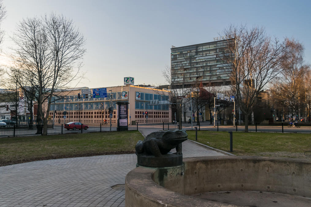 3. Как и во многих финских городах, на площади со старыми зданиями соседствуют бетонные кубы: театр, библиотека, гостиница. Перед гостиницей заезд в большую подземную парковку "Каменное сердце".