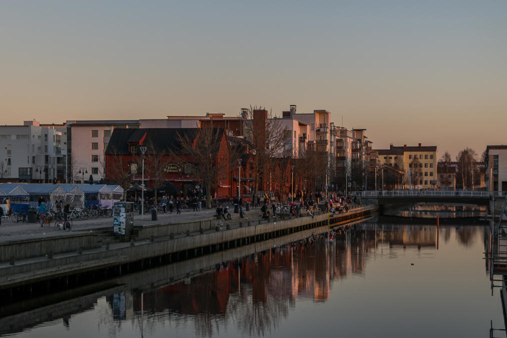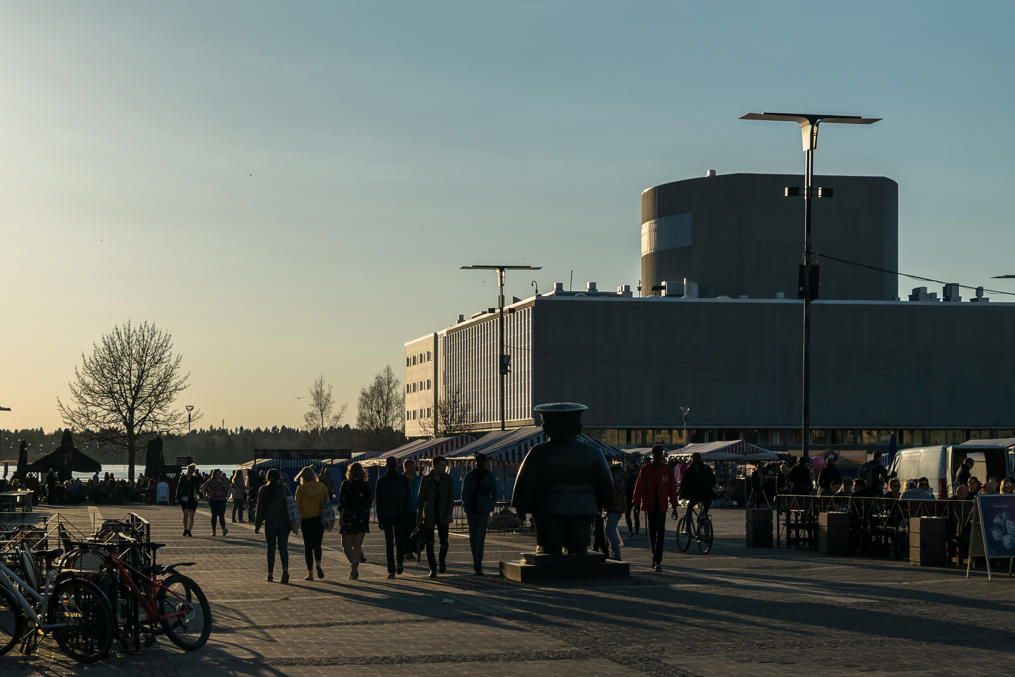 2. На площади, с одного бока примыкающей к проливам дельты реки Оулуйоки, к оставшимся здесь живописным бывшим складам собрался народ, первым настоящим теплом насладиться.