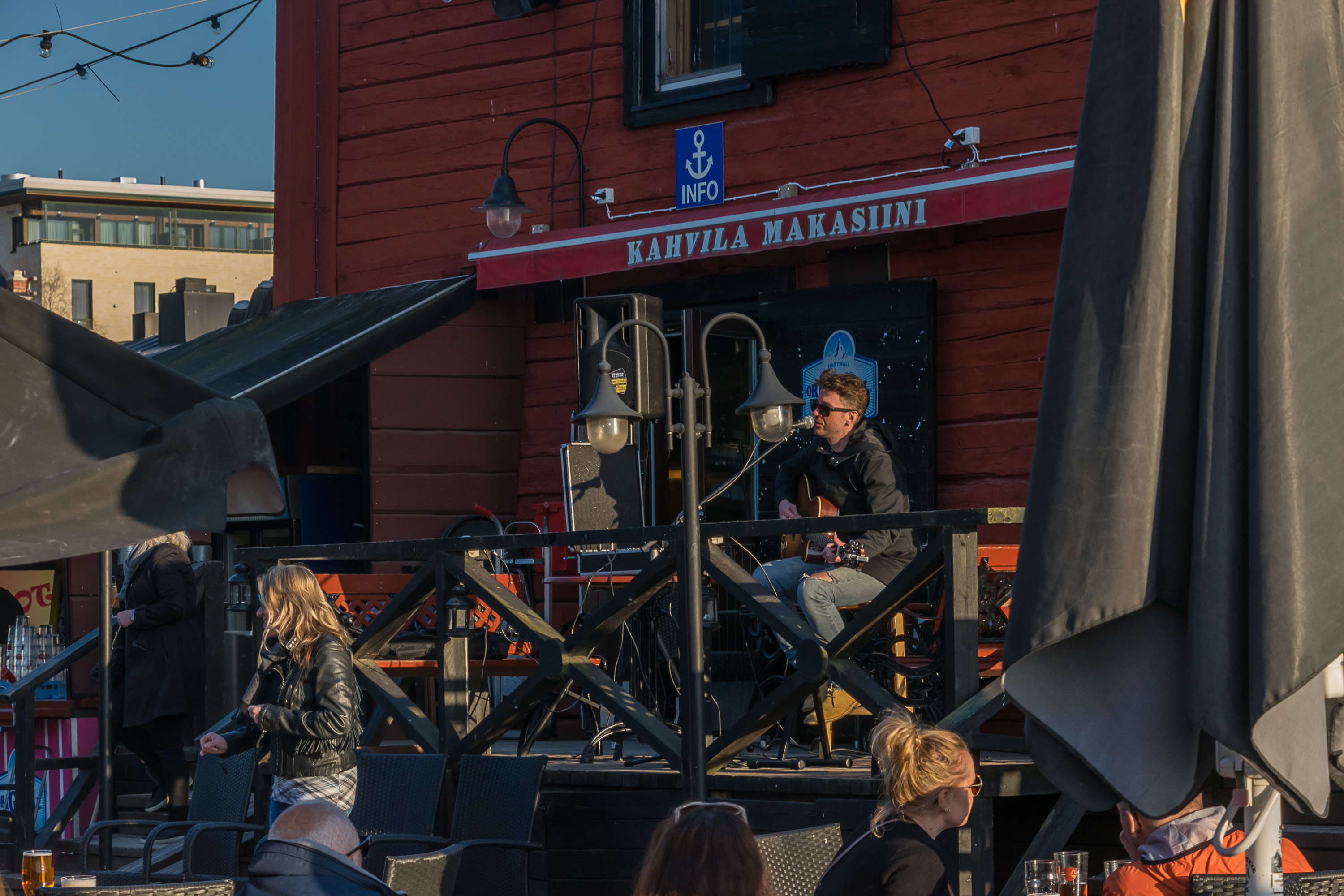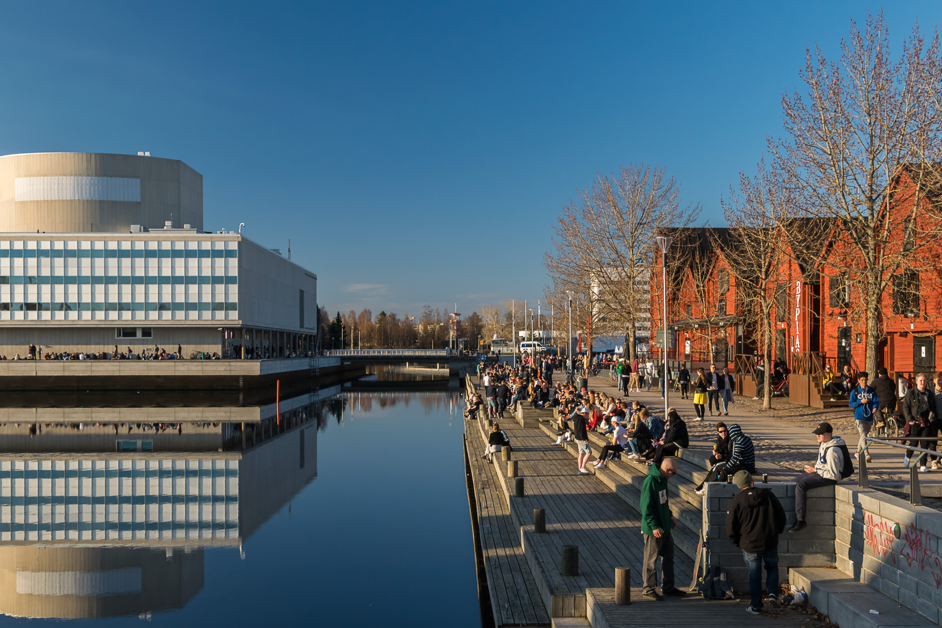 2. На площади, с одного бока примыкающей к проливам дельты реки Оулуйоки, к оставшимся здесь живописным бывшим складам собрался народ, первым настоящим теплом насладиться.