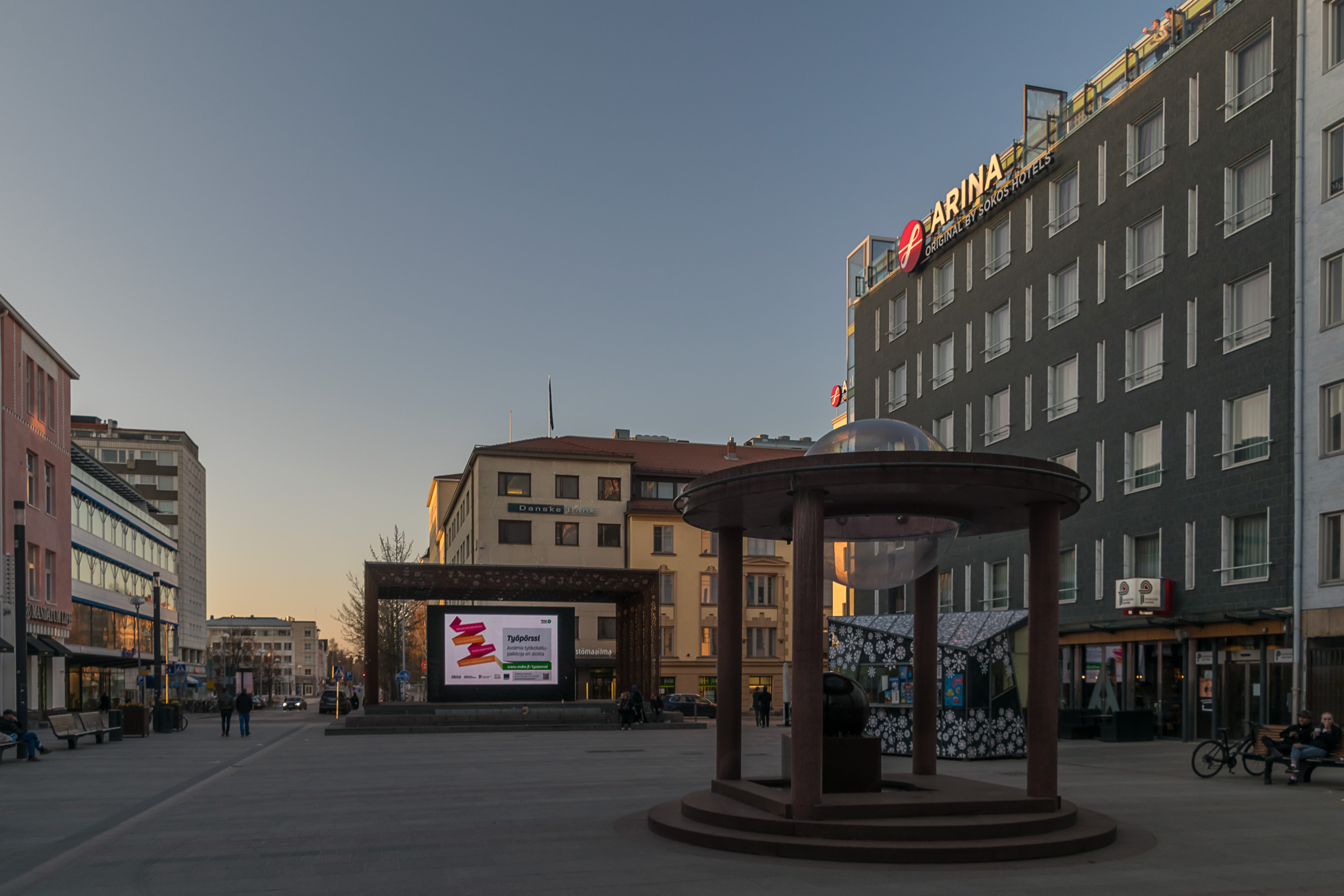3. Как и во многих финских городах, на площади со старыми зданиями соседствуют бетонные кубы: театр, библиотека, гостиница. Перед гостиницей заезд в большую подземную парковку "Каменное сердце".